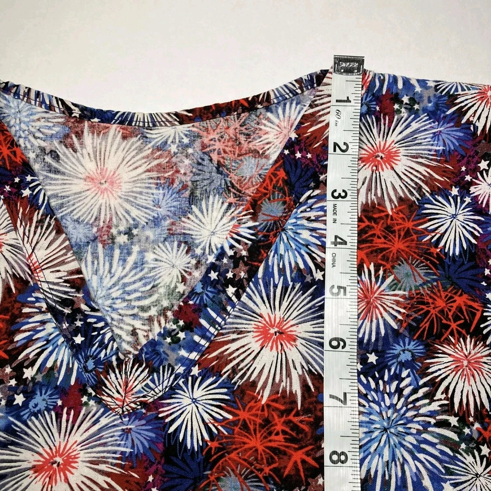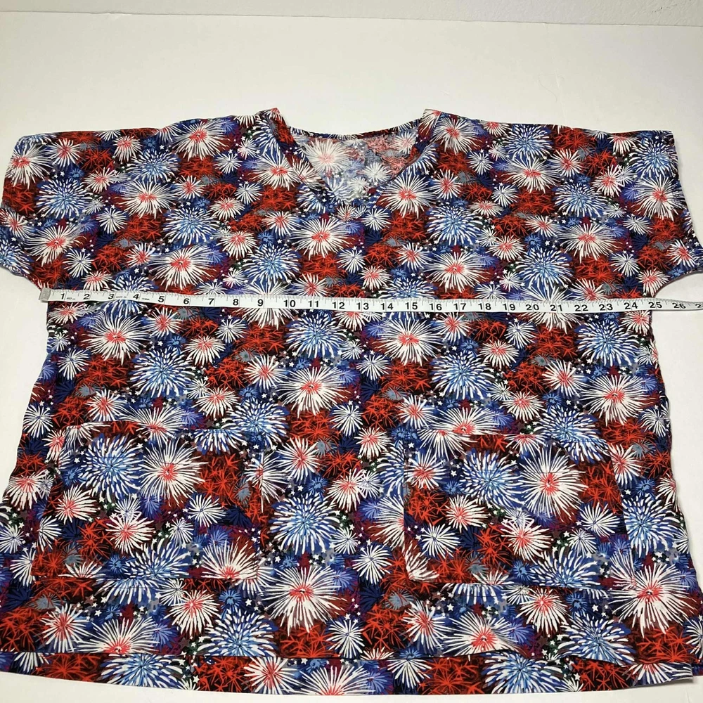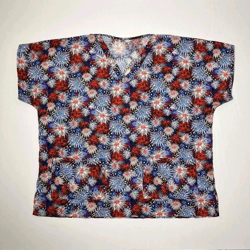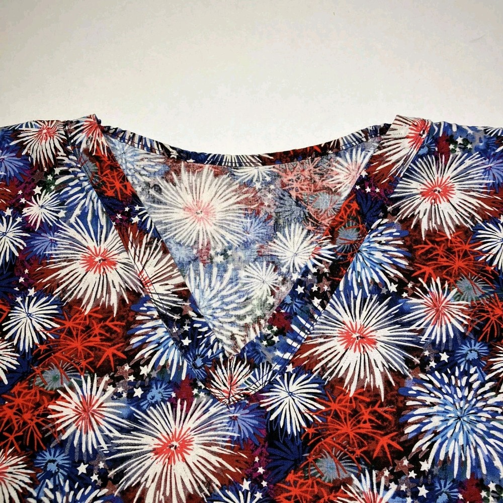 The product is a Women's V-neck scrub top designed for the medical industry, perfect for celebrating the 4th of July. This top comes in a 2XL size and features a patriotic pattern in multi-color, made from a comfortable cotton blend material. With a stylish V-neck design and tailored for women, this scrub top adds a touch of fun and style to a healthcare professional's wardrobe.