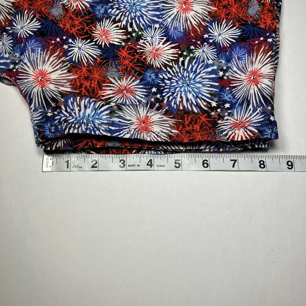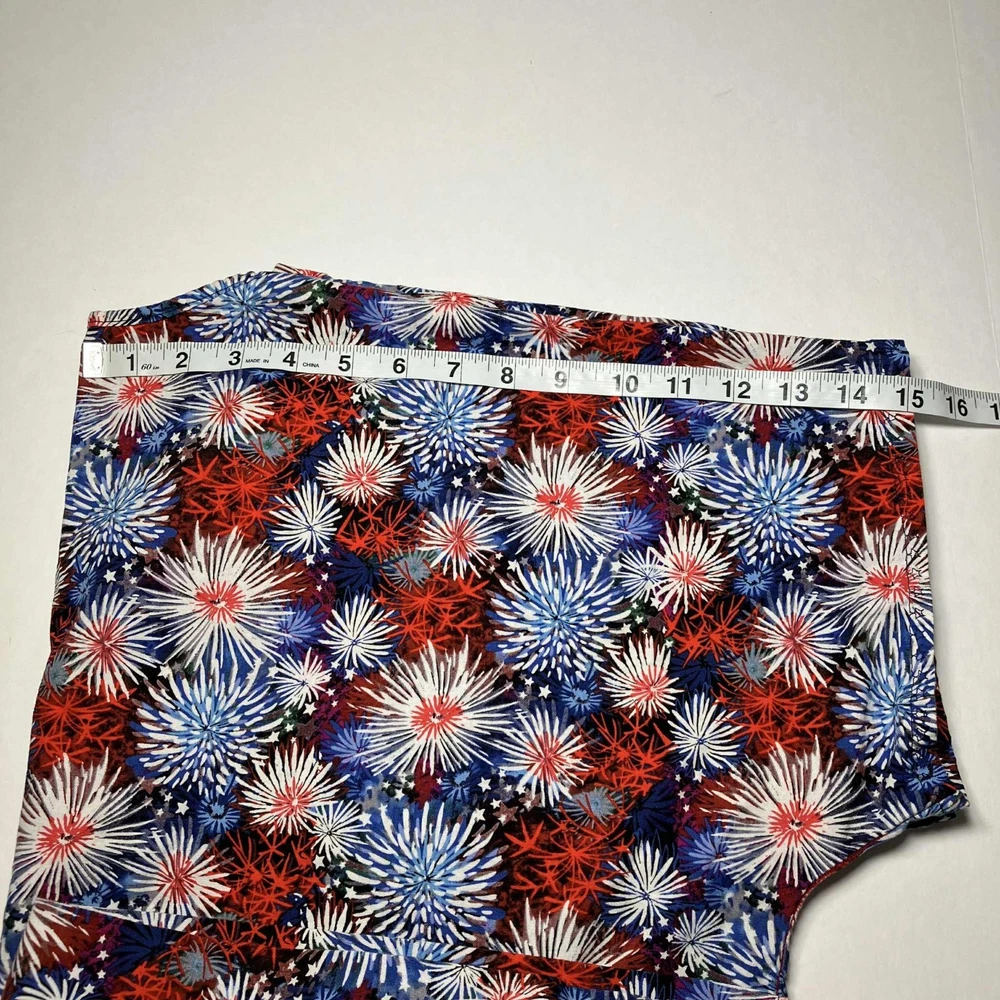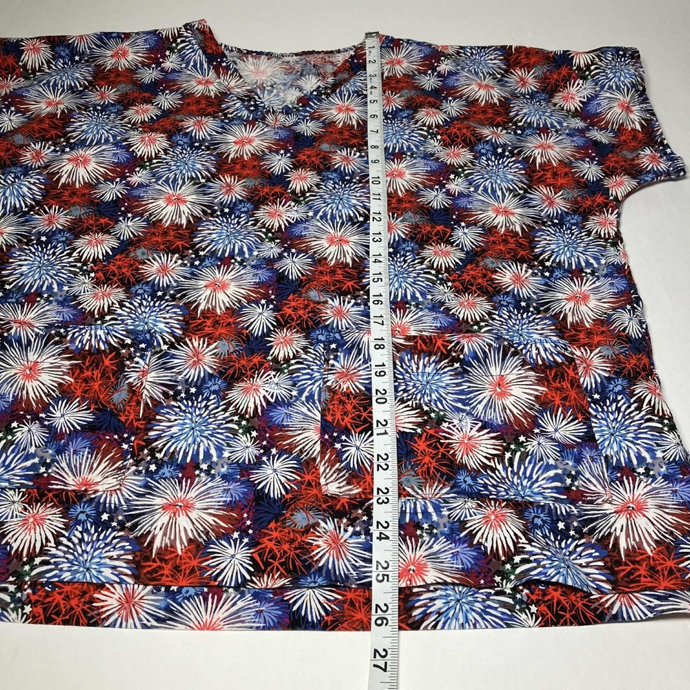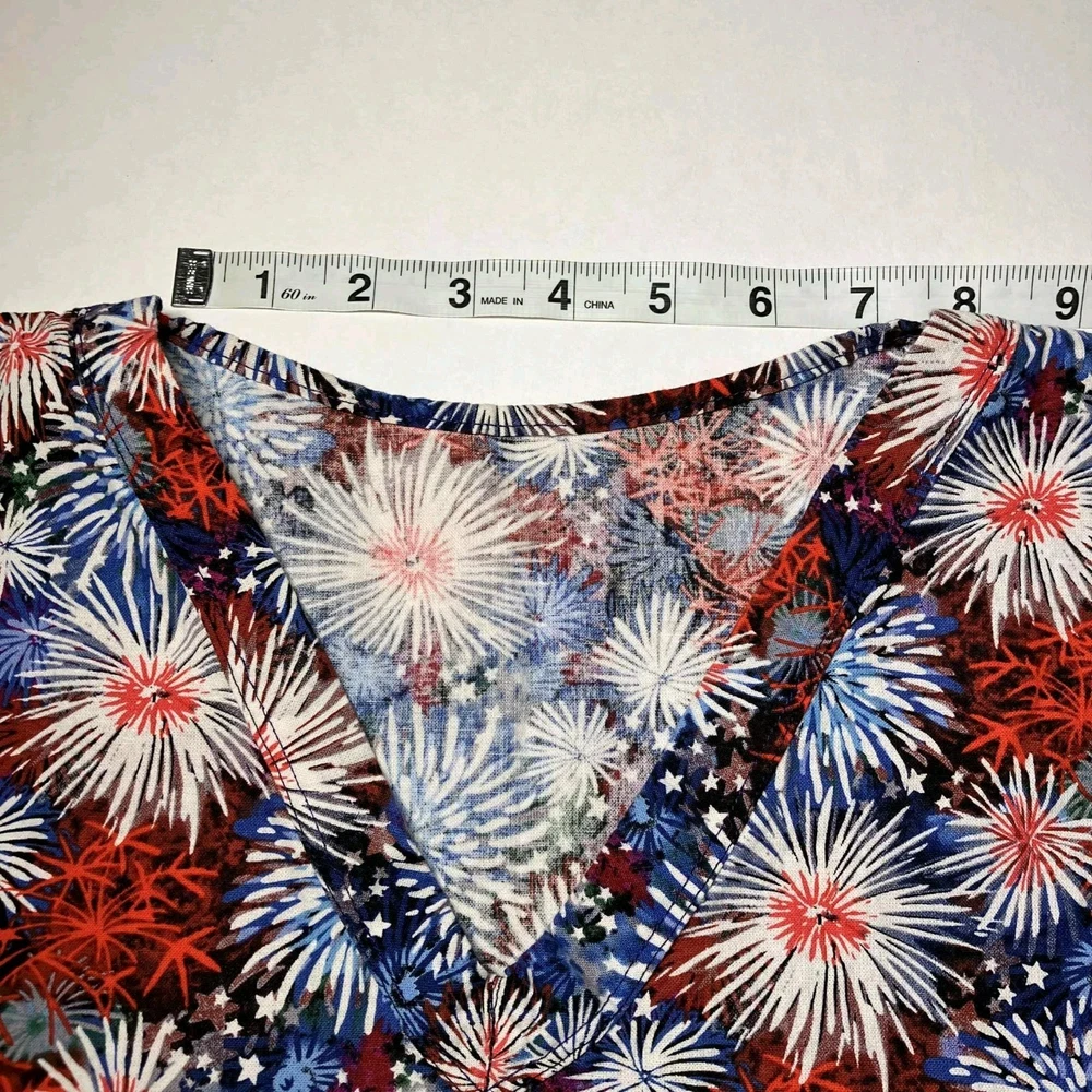 The product is a Women's V-neck scrub top designed for the medical industry, perfect for celebrating the 4th of July. This top comes in a 2XL size and features a patriotic pattern in multi-color, made from a comfortable cotton blend material. With a stylish V-neck design and tailored for women, this scrub top adds a touch of fun and style to a healthcare professional's wardrobe.