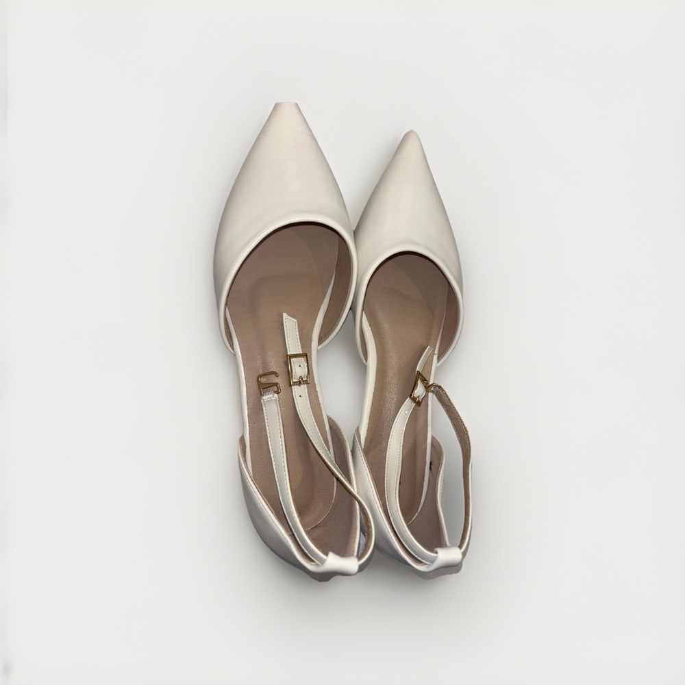 These Women's White Pointed Toe Ankle Strap Flats are perfect for a casual summer or spring outfit. The synthetic upper material and outsole provide durability and comfort, while the buckle closure and ankle strap add a stylish touch. The solid white color and pointed toe shape give these flats a chic and trendy look, making them a versatile and fashionable choice for any woman's wardrobe. Size: 8.5 US.