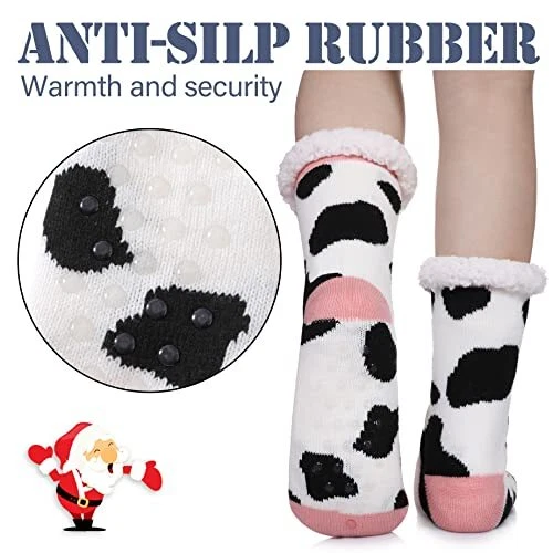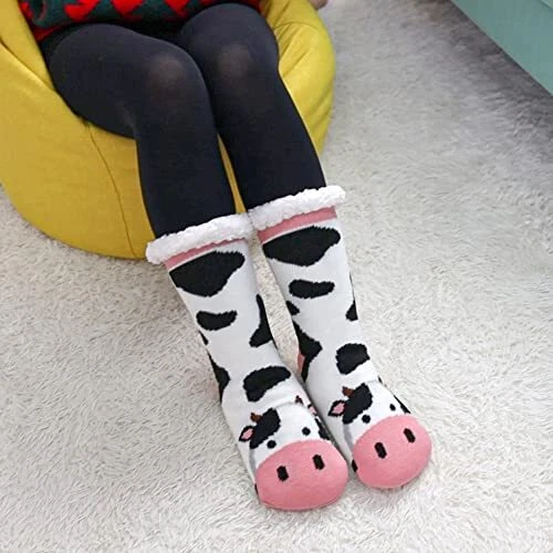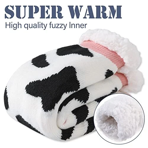 Womens Winter Slipper Socks With Grippers Cozy Warm Cute Cow-black and White)