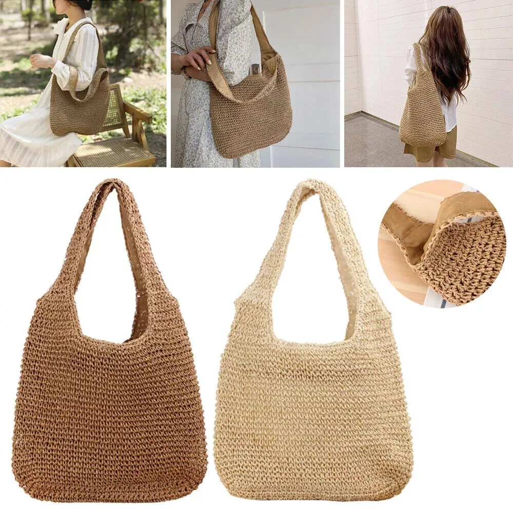 Women's Woven Straw Summer Beach Tote Bag with Zipper