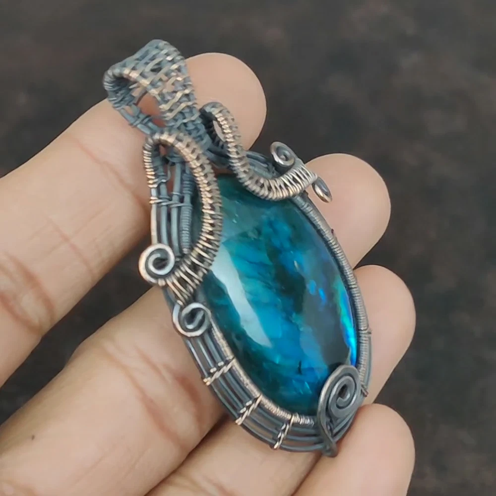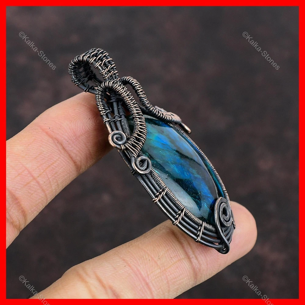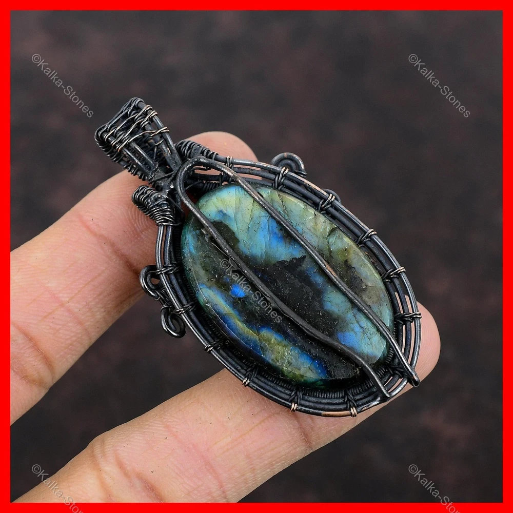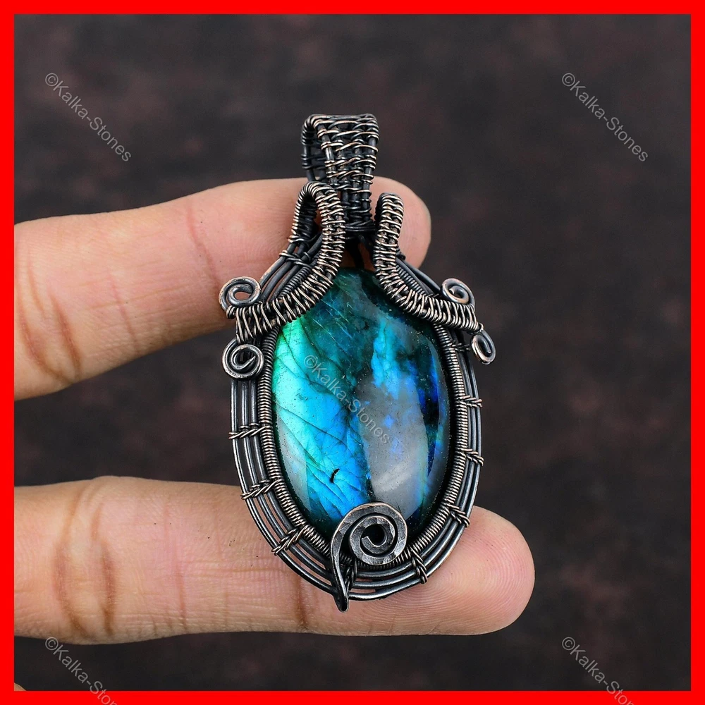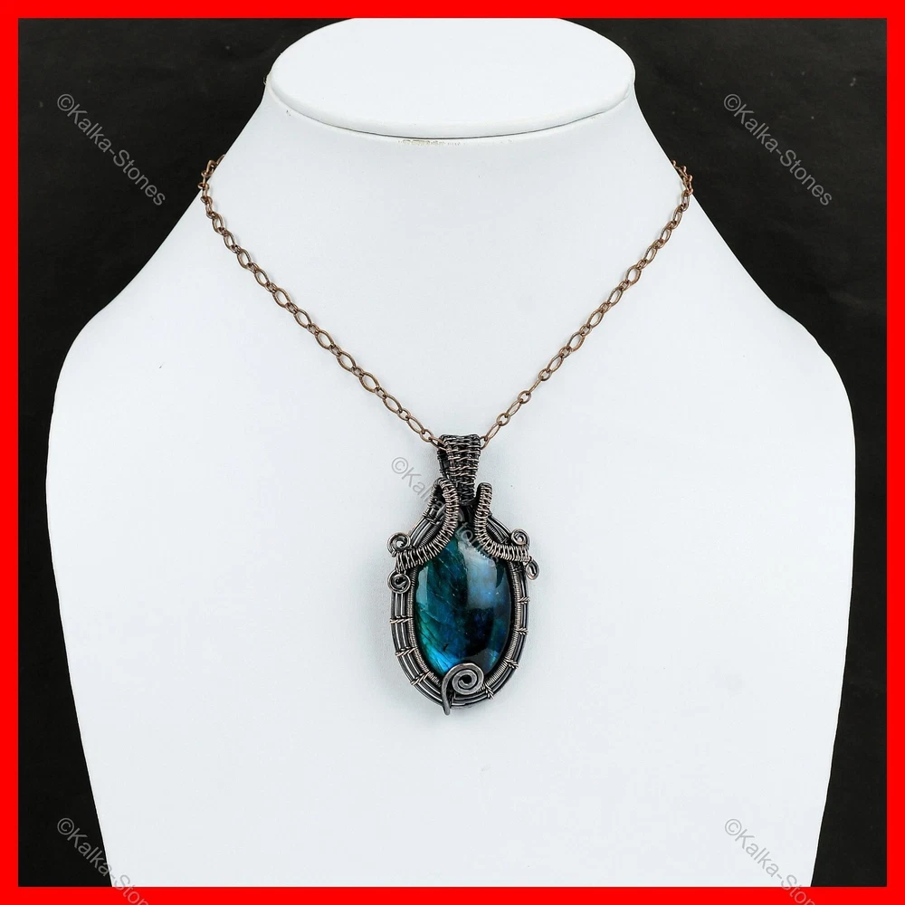Note : Due to the natural formation of this gemstone. Slight variation in design and color are to be expected. Welcome to Kalka Stones Womens day Sale Copper Neon Flash Labradorite Stone Unique Wire Wrapped Pendant Handmade Pendant, Wire Wrapped Pendant, Wire Wrapped Jewelry, Copper Pendant, Copper Wire Pendant, Wrapped Jewelry, Wire Wrap Pendant, Wire Wrap Jewelry SKU : VFWP-531 Gemstone : Neon Flash Labradorite Stone Shape : Oval Metal Purity : Unknown Copper Length : 65 Millimetres Width : 35 Millimetres Copper has been used for jewelry making for thousands of years, dating back to ancient civilizations such as the Egyptians, Romans, and Aztecs. Copper was valued for its beauty, versatility, and durability, and was often used to make everything from jewelry and coins to cookware and tools. In addition to its historical significance, copper jewelry also offers several benefits. Copper is a natural conductor of heat and electricity, which makes it ideal for energy healing and therapeutic purposes. Wearing copper jewelry is believed to have various health benefits, such as improving circulation, reducing inflammation, and boosting the immune system. Some people also believe that copper jewelry has the ability to balance energy and improve mood. For Mother's Day Gift For Father's Day Gift For Promise For Valentine's Day For Halloween Party For Christmas Day Gift For New Year Party For Mom For Her If you can't find the information you need or need some advice for your design? Feel free to contact us. We are fast to reply :) All our work is made by hand with Love and Care in our workshop Thank you so much for visiting and hope you enjoy shopping with us Kalka Stones is committed to delivering the best quality jewelry to customers. As a handmade jewelry manufacturer, we offer an extensive selection of copper gemstone jewelry that showcases the brilliance of our craftsmanship. We are an experienced handmade jewelry supplier with expertise in embellishing gemstones to suit every style. We offer you the liberty to create your jewelry ensemble with sparkling, earthy, and pure gemstones. Our Talented artisans masterfully handcraft each piece of jewelry you see here. Our pieces are made with genuine gemstones.