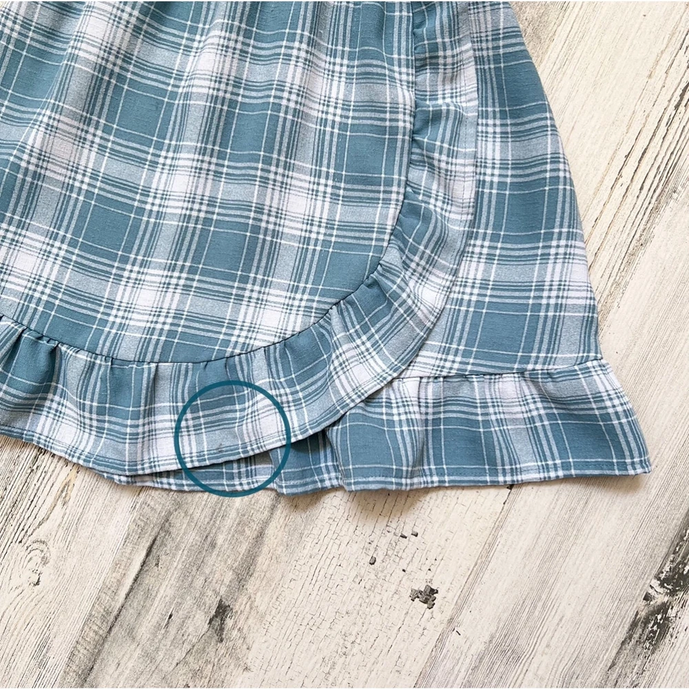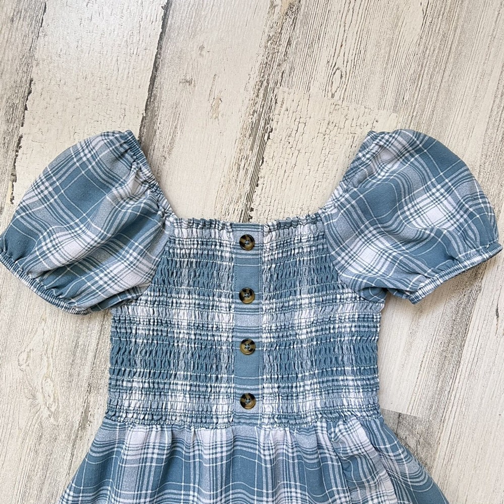 A sweet plaid dress from Wonder Nation with a smocked bodice and faux tortoise shell buttons. Designed with puff sleeves, a square neckline, and a faux wrap ruffle hem for a playful finish. Styling suggestions: Pair with tights and a cardigan for fall, wear with sandals in summer, or layer with a denim jacket for casual outings. • Brand: Wonder Nation • Size: 4-5 (XS) • Color: Light teal & white plaid • Material: 100% polyester • Style: Dress • Features: Puff sleeves, smocked bodice, faux button front, faux ruffle wrap hem • Neckline: Square • Sleeve: Puff sleeve • Closure: Pullover • Dress Length: Above knee • Fit: Regular • Pattern: Plaid • Occasion: Casual, School, Everyday • Season: Spring, Summer, Fall • Condition: Very good used condition (minior small stain at hem shown in photos) • Style aesthetics: playful, casual, classic, trendy, sweet, girly, comfy, versatile Ships from the USA. No customs delays, no surprise import fees. Clean, smoke-free, pet friendly home. Bundle to save!
