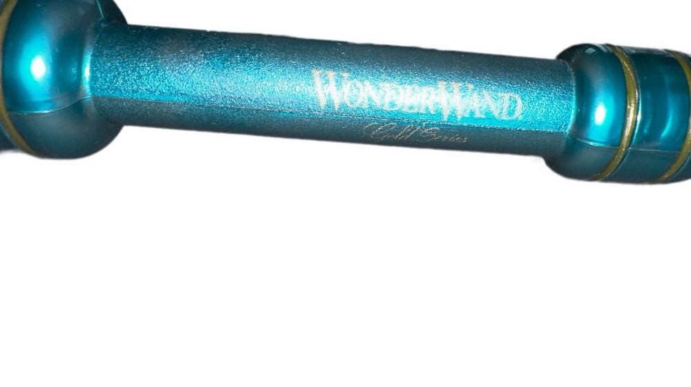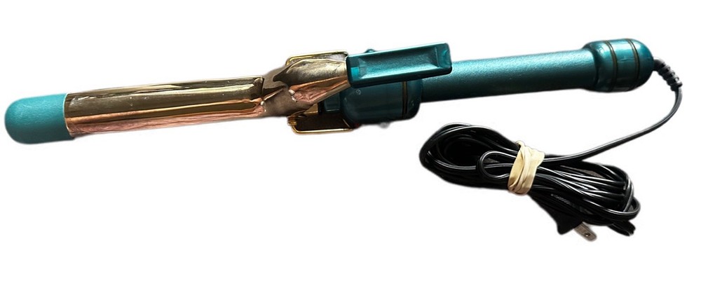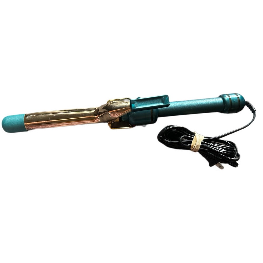 The Wonder Wand Curling Iron in turquoise blue and gold is an electric curling iron with a titanium heating plate. It features an indicator light, adjustable heat settings, a cool tip, built-in safety stand, and a swivel cord for convenient use. The barrel size is 1 inch, making it ideal for creating various curl styles with ease. Tested and confirmed to work, this curling iron is a reliable styling tool for achieving beautiful curls with added style and safety features. Some wear but still works great!