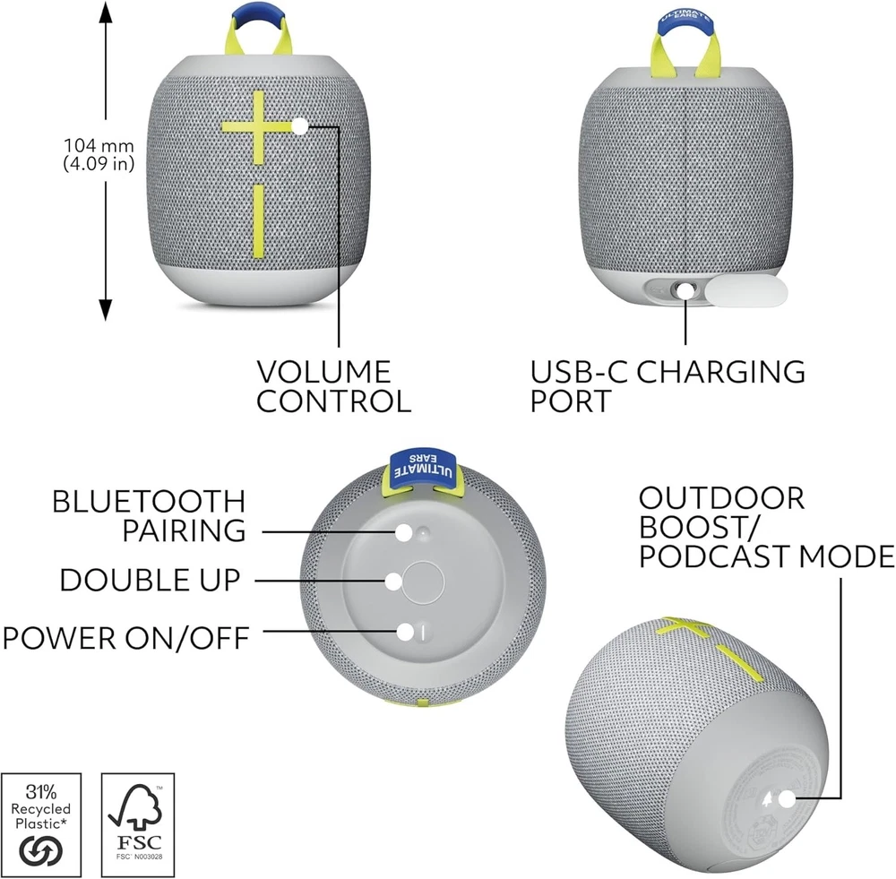Product Features Connectivity technology Bluetooth Audio output mode Stereo Mounting type Tabletop Material recycled plastic Speaker type Portable Bluetooth Speaker Special feature Waterproof + Floatable Compatible devices Smartphone, Tablet, other devices that support Bluetooth Unit count 1.0 count About this Item Surprisingly Bigger 360-Degree Sound: The WONDERBOOM 4 portable waterproof Bluetooth speaker features bigger 360-degree sound in a petite package; boosted sound for up to 14 hours of playtime Outdoor Boost and Podcast Mode: Engineered for full stereo sound; tap the Outdoor Boost button for outdoor environments; use the new Podcast Mode to make vocals sound rich and clear 14 Hours of Boom: With a battery that lasts throughout the day, this waterproof portable speaker booms on with up to 14 hours of playtime, so you can soak up every moment Waterproof, Dustproof, and Floatable: IP67-rated this Bluetooth waterproof speaker can be submerged in 1m of water for 30 min; protected from dust; ideal for the pool, beach, or shower Double Up for Stereo: Pair up two WONDERBOOM 4 portable Bluetooth speakers for even bigger sound; press once to double up; press again for true stereo from both speakers, with left and right channels Durable Wireless Speaker With Range: 40 metres ( 131 feet) of range so you’re free to roam; plus it’s dirt-resistant and drop-proof (1) with a handy loop so you can take it with you Made With Recycled Plastic: Plastic parts in the WONDERBOOM 4 wireless Bluetooth speaker include a minimum of 31% post-consumer recycled plastic by weight (1) Drop-tested from 1.5 m (5 ft) Product Details Surround-sound channel configuration 1 . 0 Colour White Included components Quick Start Guide ( printed inside the box ) , Strap ( attached to product ) , ULTIMATE EARS EVERBOOM , USB - C Cable Product dimensions 13.2D x 11.5W x 11.8H centimetres Item weight 0 . 57 Kilograms Is waterproof True Maximum range 40 Metres Number of items 1 Control method Touch Wireless communication technology Bluetooth Speaker size 11.81 Centimetres Power source Battery Powered Material type recycled plasti