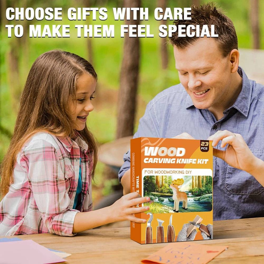 [Wood Carving Kit 23Pcs]-Our wood carving kit provides everything that beginner or professional needs, 4 large carving knives, 5 small detail knives, 9 basswood blocks, polishing compound, leather strop, gloves, and an instruction manual. And all knives are organized in a portable bag for convenience. [9Pcs Basswood Blocks & Upgraded Leather Strop]-Our wood carving kit includes 9pcs high-quality basswood blocks that are soft, burr-free, and easy to carve. And our leather strop comes with the convenient handle for easy operation, providing you with everything you need for your carving needs. [Quality Blade for Effortless Carving]-Our wood carving knives feature sharp and sturdy blades, which is made of high-quality stainless steel with added Mo. V alloy to make it more durable and corrosion-resistant. The blades are pre-sharpened and air pressure assembled to prevent any deformation or stripping during carving. [Ergonomic and Comfortable Handle]-The handles of our wood carving knives are crafted from premium walnut wood, coated with varnish for extra durability and a smooth finish. Designed with an ergonomic shape, it provides a comfortable and non-slip grip, which reduces fatigue during long carving sessions. [Safe and Enjoyable Experience] - This wood carving knives come with a pair of gloves to protect your hands from cuts. Whether you're a beginner or an experienced carving enthusiast, you can enjoy a safe and enjoyable carving experience with our high-quality wood carving knives.