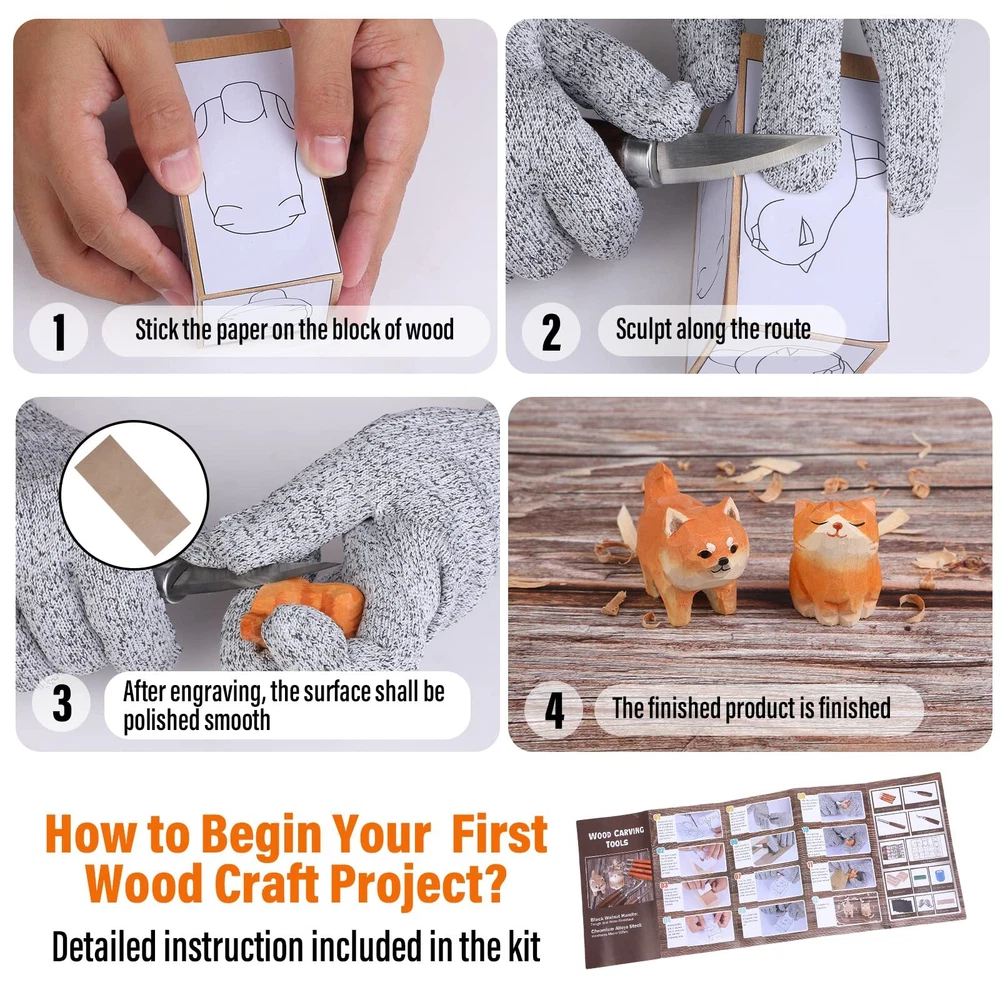 🏆 All In One Wood Carving Tools Kit --- The wood carving kit includes 3 kinds of whittling knives,4pcs sk2 carbon steel wood carving knives,8 basswood wood blocks,4pcs sandpapers1 polishing compound,1 leather strop,1sharpening stone,1 roll of cut resistant tape,1 pair of gloves,drawings and carving step instructions.Our wood carving tools kit can help beginners easily carve different animals, which is the perfect carving experience. 🏆Premium Quality Wood Carving Knife --- Our wood carving knives are made of chrome vanadium alloy steel,feature excellent sharpness, high hardness to keep knives edge razor-sharp and not curling after several wooden carving,and exceptional corrosion resistance. ⭐NOTICE: Due to the limitation of the production process, the hook knife you receive will be dull, please sharpen it before use. 🏆Walnut Handle of Whittling Knife --- Black walnut as the woodcarvers first choice create comfortable green wood carving tools. Handle length about 4inch, no matter adult and older kids are able to hold carving wood knife tightly. 🏆Engrave Everything Wood Carving Kit --- The wood carving set can carve just about anything you can imagine!Sloyd knife is good at whittling and taking bigger chunks of wood.Hook carving knife plays a leading role on perfect for digging out grooves.Round handle long chisel knife can dig out deep grooves,like bowl.Then you can use sk2 carbon steel wood carving knives to do tiny details and caricature carving. You can easy get woodcrafts like spoon, bowl, cat,dog,bird etc. 🎁Perfect Holiday Gift Idea --- The professional wood carving knife set is perfect for carving unique and original designs while passing time around the fireplace. It's the perfect gift for beginners all the way to advanced wood carver! Those wood carving knife comes with the highest quality blades,sharp, precise and durable,to satisfy all your wood carving creativity!A perfect gift for Birthday, Christmas, Halloween, Thanksgiving, Valentine's Day.