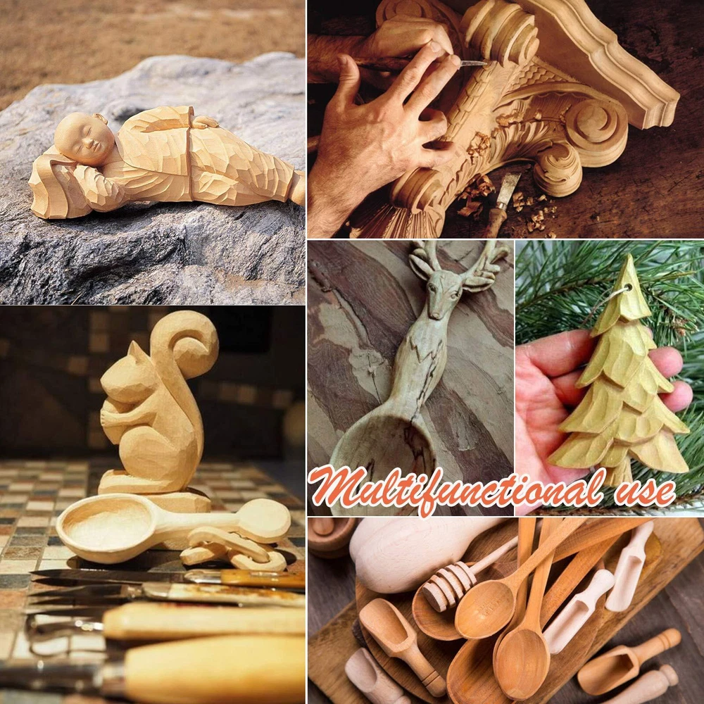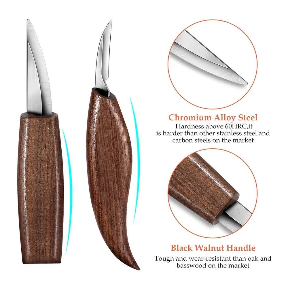 Product Description [ Package Include ] 1 × whittling knife 1 × detail wood carving knife 12 × high quality SK2 carbon steel wood carving tool 1 × polish leather strop 1 × polishing compound 2 × gloves 1 × whetstone 1 x roll bag 1 x sandpaper 2 x canvas sheaths [ Wood Carving Tools Set ] It can be a beautiful gift for any occasion, thanksgiving day and christmas, birthdays, father's day etc. We put in our heart and soul to create a modern wooden carving set with all its accessories that makes it practical and complete. This gift will surely never be forgotten. [ Polish Compound and Leather Storp ] Polishing compound is applied to the rough side of the leather strop. and then rub the blade back and forth. This can prevent the blade from rusting, making it glossier and sharper. [High Quality SK2 Carbon Steel Wood Carving Tool ] Our Wood Carving Knives are made of SK2 Carbon Steel. Widely use in wood working projects, art project, crafts, home repair, linoleum, clay sculpture, soapstone projects and DIY article. Worked well with softwood such as basswood, pine, hickory, poplar wood. 🏆23Pcs Wood Carving Tools --- Wood carving tools kit wood carving set includes 1 × whittling knife, 1 × detail wood carving knife, 12 × high quality SK2 carbon steel wood carving tool, 1 × polish leather strop, 1 × polishing compound, 2 × gloves, 1 × whetstone, 1 x roll bag, 1 x sandpaper, 2 x canvas sheaths. 🏆Premium Quality Wood Carving Set --- Unlike other carved knife, our carving knife blades are more sharper for adding more Mo. V alloy into stainless steel on the smelting process to create firmness, anti-corrosive and more durability carved blades, which had enough hardness to keep knives edge razor-sharp and not curling after several wooden carving. 🏆Practical Wood Carving Hand Tools --- Wood whittling knives good at roughing sharpening, crooked knife play a leading role on concave shape or rounded edges woodwork, then you can use detail wood knife to finish stop cuts and add pretty pattern embellishment. Carving hand tools sets to bring spoon, bowl, fork, cup for child, carving wooden horse, gnomes, wizards to your house. 🏆Ergonomic Handle of Wood Sculpting Tools --- Made of hardwood oak and processed with natural linseed oil, the ergonomic design of the handle allows having a long period of comfortable wood carving without hand fatigue. The carving set is designed specifically for those who appreciate comfort during working with wood. 🏆Perfect Holiday Gift Idea --- The professional wood carving knife set is perfect for carving unique and original designs while passing time around the fireplace. It's the perfect gift for beginners all the way to advanced wood carver! It comes with the highest quality blades to satisfy all your wood carving creativity! Sharp, precise and durable, these blades can carve just about anything you can imagine!