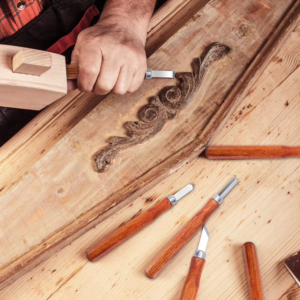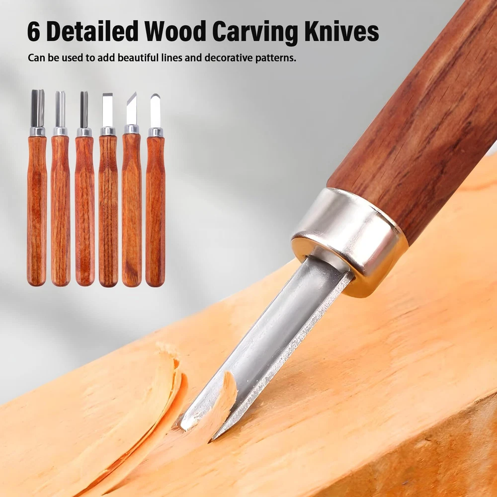 Wood Carving Tools Set, Wood Whittling Kit for Beginners Kids and Adults - Wood Carving Kit with Detail Wood Carving Knife, Whittling Knife, Wood Chisel Knife, Gloves, Carving Knife Sharpener Wood Whittling Kit Package Included Wood Carving Knife *10 knife Blade Protector *9 Storage Bag *1 Wood Carving blank*1 Leather Strop*1 Polishing Compound *1 Frosted Sponge *2 Cut Resistant Gloves * 1 pair Wood Carving Set Advantage ★Ergonomic handle The handle is round and comfortable. ★Cut Resistant Gloves Protect your hands ★Portable Roll Bag You can use them anywhere for easy storage and portability. Wood Carving Knife *10 ★4pcs wood carving knives Wood Carving Details Knife Wood Carving Sloyd Knife Wood Carving Hook Knife Wood Carving Oblique knife ★6pcs carbon steel carving chisel knives This wood carving tool set is a perfect gift for beginners to advanced sharpeners, it can satisfy your wood carving creativity, allowing you to enjoy the fun of wood carving creation by creating your own wood carving art, allowing you to relax from a busy day . 【Wood Carving Tools Set】Whittling knives set Including 1 hook carving knife, 1 detail wood carving knife, 1 paring knife, 1 Oblique knife, 6 carbon steel carving chisels, 9 blade protectors, 1 pair of cut-resistant gloves, 1 wood carving blank, 1 leather strap, 1 polish, 2 scrubbing sponges and 1 storage bag. 【Grip & Metal Cover】With 4 main carved handles made of smooth and durable black walnut, the Wood carving knife tool set is ergonomically designed to reduce hand fatigue. The sharp blade also features a metal cover to hold the blade in place and prevent the blade and handle from breaking. 【Multifunctional Wood Carving Tools】Widdle wood kit for beginners kids, you can freely carve various shapes of wood blanks. Detailing knives and engraving knives are suitable for working with concave or rounded woods, while 6 piece detailing wood carving knives can be used to add fine lines and decorative patterns. 【Cut-Resistant Gloves】The equipped cut-resistant gloves can effectively protect hands from cuts and abrasions. The glove is flexible and comfortable, stable and not slipping when operating. 【Enjoy Wood Carving Fun】This wood carving tool set can meet your various wood carving creation needs,wood whittling knife kit is a perfect gift from beginners to professional knife sharpeners! Use your own craftsmanship to create woodcarving works for your family or friends, and enjoy the fun of woodcarving.
