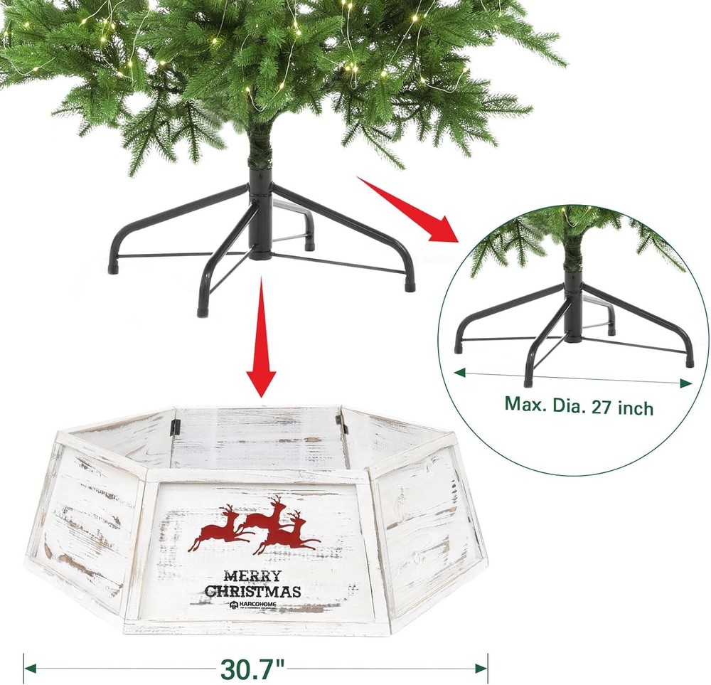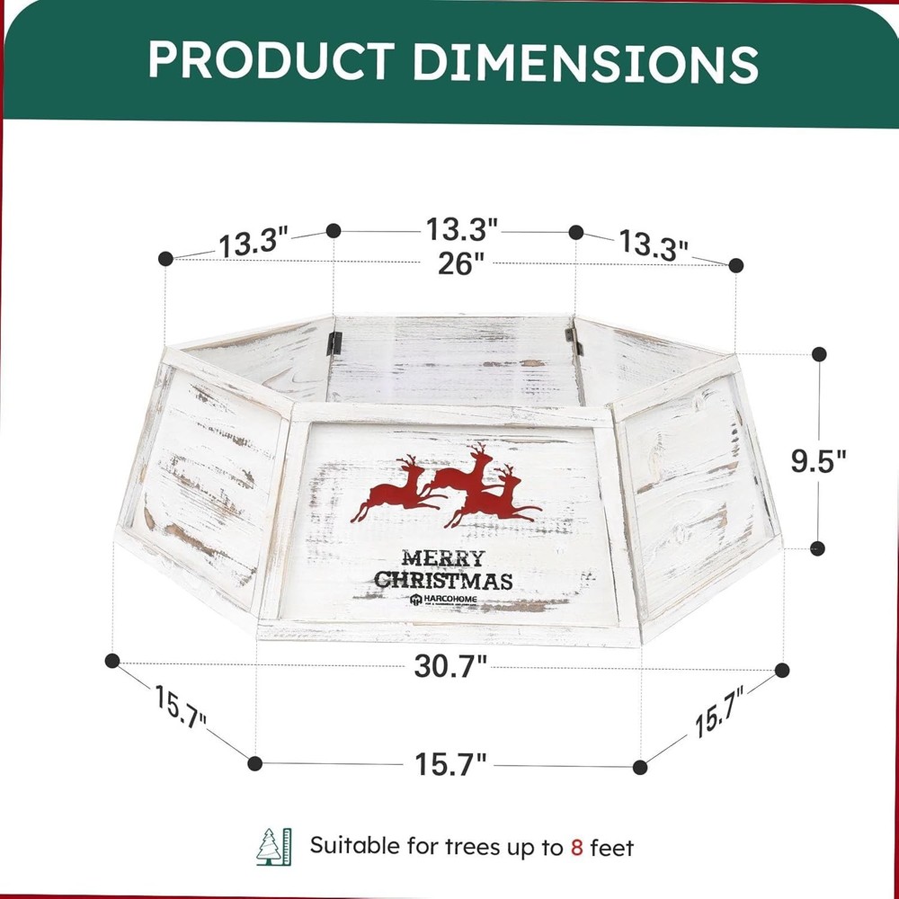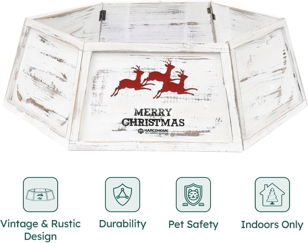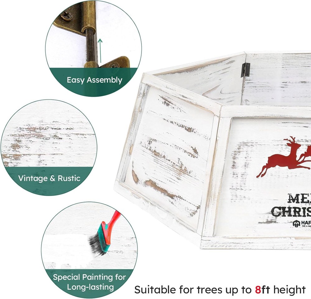 Free eBay listing template designed by dewiso.com Wood Christmas Tree Collar, Wooden Hexagon Tree Base Cover, Handcrafted Natural Wooden Tree Ring, Vintage Weathered Tree Skirt for Xmas Decor, Rustic (Distressed White) FREE AND FAST SHIPPING! About this item RETRO APPEAL: Add a rustic touch to your holidays with our solid wood Christmas Tree Collar, featuring a distressed finish for a classic, vintage look DURABLE HOLIDAY ESSENTIAL: Crafted from premium materials, our Christmas Tree Collar delivers robust stability, safeguarding your tree from pet play; Burr-free and odorless, ensuring a safe and enjoyable holiday ambiance for all CUSTOM-FIT HOLIDAY CHARM: Crafted for a flawless fit on 9ft trees, our 26" top diagonal x 30.7" bottom diagonal x 9.8" high tree cover enhances your decor with a perfect, tailored fit; verify your stand dimensions for a seamless setup EASY ASSEMBLY AND STORAGE: With customized latch hinges and small pins, our tree collar assembles and disassembles with ease. Post-season, it stores compactly, conserving your valuable space WRINKLE-FREE HOLIDAYS: Our tree collar with custom latch hinges and pins ensures a smooth, wrinkle-free look all season. Simplify your holiday decor with effortless setup and no stress Product We offer a 30-Day Return Policy on items which you are not completely satisfied with. You have the option for a full-refund or an exchange of the item. No returns are available on items shipped outside of the US . Shipping We offer Free Shipping to the US and ship within 2 business days of payment, usually sooner. We use UPS express shipping. That's why your products are usually delivered within 3 days . Contact We try our very best to make sure every customer is completely satisfied. If there's a problem , message us! We're happy to help. 24/7 live chat available.