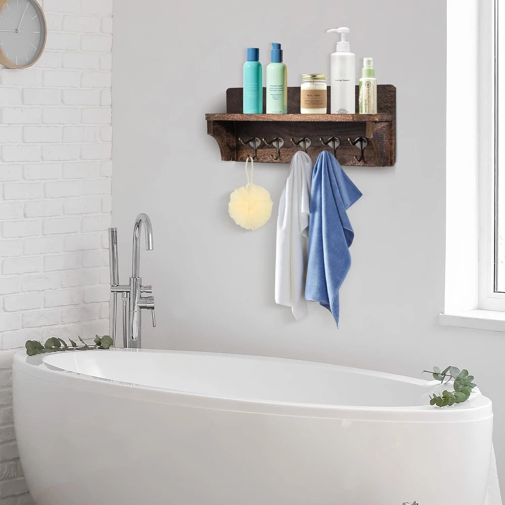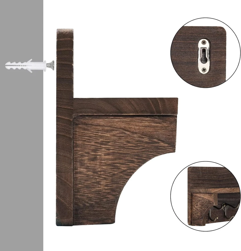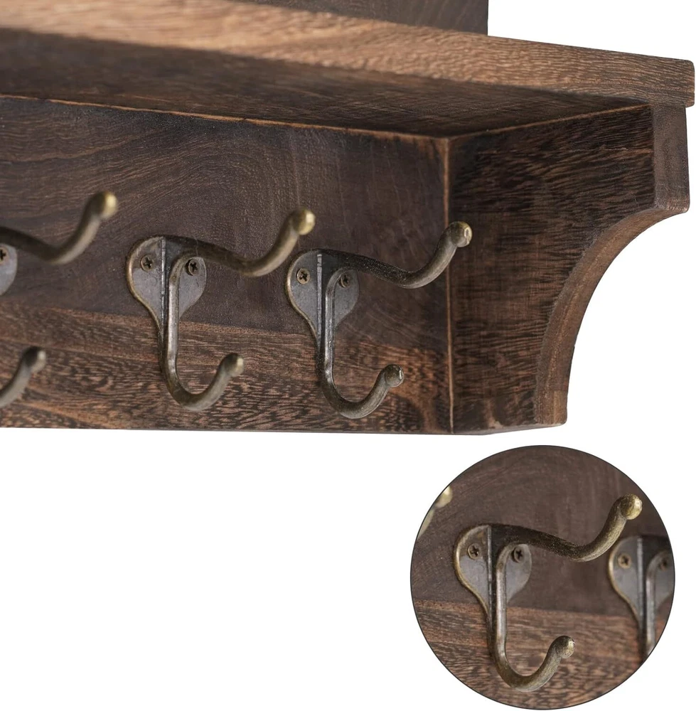 [High Quality of Rustic Coat Rack]: Our rustic wall mounted coat hooks with shelf are made from 100% solid fir wood. Our wood is hand selected to great quality and endurance. The unique rustic finish of our wall-mounted coat rack will bring function and farmhouse flair to the foyer [Unique Design Coat Rack for Space Saving]: Our entryway shelf with 5 hooks can hang any coats, purses, jackets, leashes and more. These hooks are perfect for saving your room space and make your home tidy and stylish. Upper with a flat shelf in this rack is convenient for holding like letters, mails,books or displaying picture frame, and some small plants or any other small items [Get Organized with Our Coat Rack]: Declutter your home with this stylish and practical entryway shelf. Utilize the coat hooks with shelf for extra organizing space or for decorative purposes. Use the upper flat shelf and hooks to store all your loose items and give a new clean yet rustic look to your home. to keep your home or office neat and organized, and it's very space-saving [Easy to Install]: This wall-mounted coat rack is easy to install with screws and anchors included making ready to hang out right out of the box. Our wood wall mounted coat hanger is 15 inches long, 6.3 inches tall, and 3.9 inches wide [ risk-free shopping]:We are confident in our products and stand behind them . Just reach to us with any questions or concerns and we will be happy to help in less than 24 hours Product Description Our Rustic Wall Coat Organizer will save you space and look great! The unique rustic finish color looks great in modern, industrial, or rustic style homes. It also comes with 4 metal hooks to help you organize your kitchen, bathroom, entryway, mud room, hallway or anywhere else! Entryway Coat Rack with Hooks Features: GOOD MATERIAL: Made of 100% solid fir wood material and stainless steel hooks, this rustic coat rack is stable, durable, stylish and sturdy, and easy to clean. SPACE SAVING: This wall shelf is perfect to be used in living room, bedroom, hallway, balcony, kitchen or other suitable place, to keep your home or office neat and organized, and it's very space-saving. EASY to INSTALL: This wall-mounted coat rack is easy to install with screws and anchors included making ready to hang out right out of the box. MULTIPURPOSE RACK: Combined hook and shelf design, this hook rack is perfect for saving your room space and make your home tidy and stylish. Upper with a flat shelf in this rack is convenient for holding books, picture frame, keys and some small plants or any other small items, and 5 dual coat hooks can be used for hanging bags, coats, umbrellas, towels, etc. MULTIPURPOSE RACK Bathroom Kitchen Livingroom High Quality Stunning Hardware Our entryway shelf with 5 hooks can hang any coats, purses, jackets, leashes and more. These hooks are perfect for saving your room space and make your home tidy and stylish. Suit Size Coat Rack Our wood wall mounted coat hanger is 15 inches long, 6.3 inches tall, and 3.9 inches wide.The coat rack with shelf are perfect for saving your room space and make your home tidy and stylish. Easy to Install This wall-mounted coat rack is easy to install with screws and anchors included making ready to hang out right out of the box. Package Included: 1 x Coat Rack 3 x Screws(1 spare) 2 x Dry Wall Anchor Specification: ●Color: Dark brown(Retro). ●Weight capacity: 30lbs(15kg). ●Material: solid wood. ●Dimensions:15 x 3.9 x 6.3 Inch. Add to Cart Add to Cart Add to Cart Add to Cart Customer Reviews 4.6 out of 5 stars 326 4.5 out of 5 stars 459 4.6 out of 5 stars 340 4.2 out of 5 stars 29 4.3 out of 5 stars 33 Price $20.99 $ 20 . 99 $20.99 $ 20 . 99 $18.49 $ 18 . 49 $18.99 $ 18 . 99 — material solid wood solid wood solid wood solid wood solid wood color brown black white black black