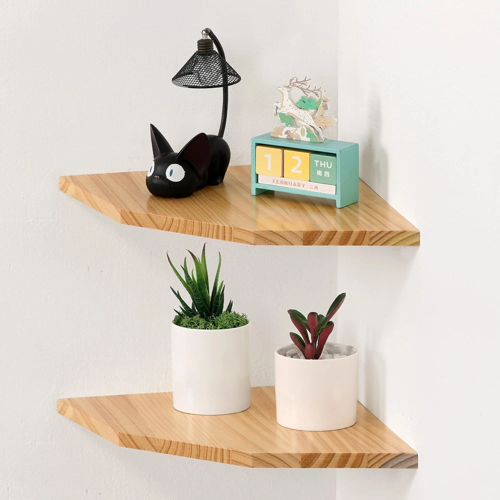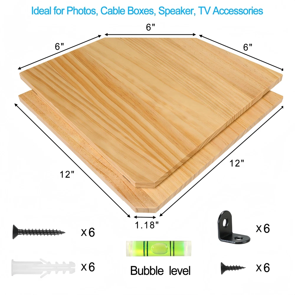 Solid Wood Corner Wall Shelf: These corner wall shelves are designed with natural wood and stainless steel brackets, made of 100% Premium Solid Pine Wood, green and pollution-free. Our sturdy and beautiful corner shelves are suitable for any corner of your room to display your favorite decorative items. Space Saver Floating Corner Shelves: Do you have empty corner wall where you could use some additional storage and organization? Our corner shelf can meet your needs, very useful for adding extra storage space to and reorganize small items in your bedroom, living room, kitchen and more. It will be a great space saver. Efficient Corner Shelves Wall Mount: The corner shelf wall mount is 0.7 inches thick and 12 inches long and can hold 48 pounds. Ideal for displaying photos, collectibles, small plants or other decorative items in your living room, bedroom, study, corridor, stairway corner; It is also a good choice to install it to your kitchen for storing spices and condiments. Large Size And Easy To Install: Each wood corner shelf's size is 12Lx12Wx0.7H inches, more width and more depth than others. Wall mount corner shelves include all hardware and installation instructions, you only need to follow the instructions to complete the installation in a few minutes. Specially designed for 90 degree wall corners only! Get Your Home Organized: Wanna turn bare and empty corner into a useful storage and display space? Would you like to neatly display your family photos or exquisite collectibles in your home or office? We provide you with 2 shelves of the same size to meet your storage and display needs.