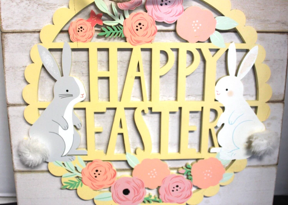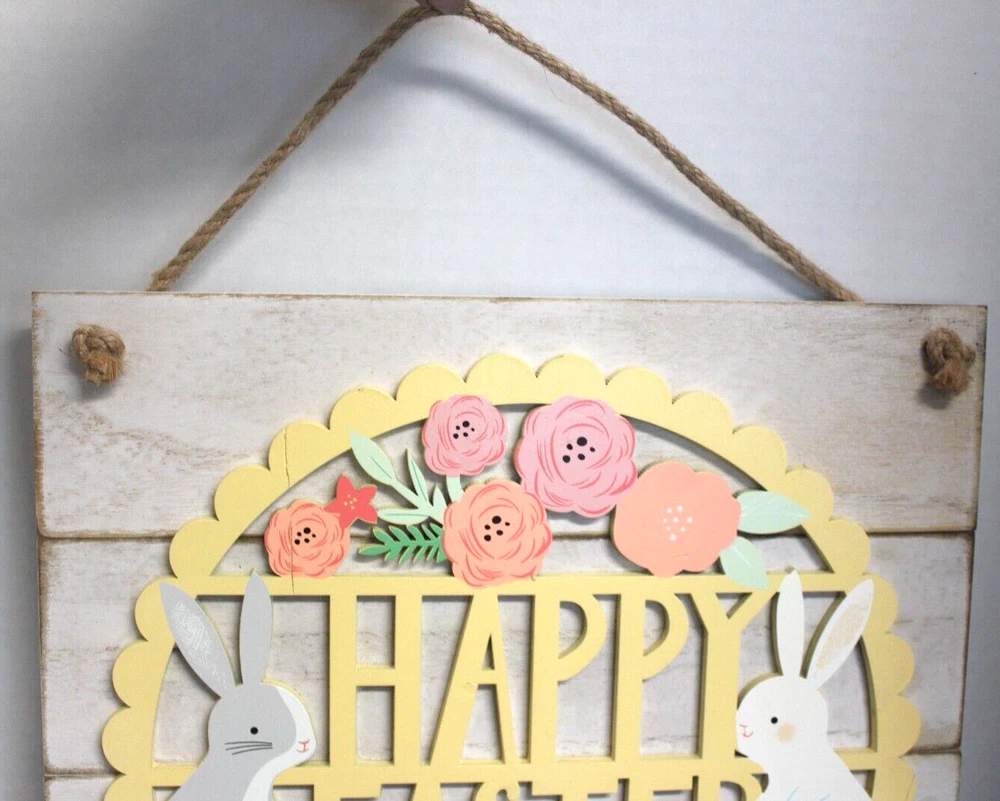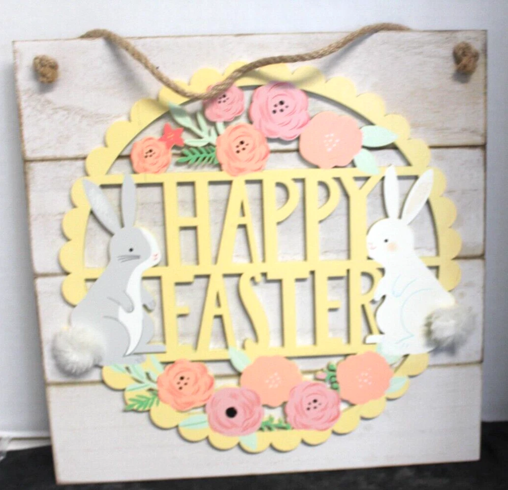 Add some festive flair to your home or office with this charming Easter door/wall hanger from Kohl's. The multicolored design features Flowers and bunnies and is made of high-quality wood material with a matte finish. Measuring at 12.5 inches in length and height, and 3/4 inches in width, this traditional style decoration is perfect for any room and occasion. The hanger comes with additional parts required for installation and can be easily cleaned with a damp cloth. Its vertical orientation and hanging mounting style make it an ideal choice for teens, adults, and kids. This decoration is a great addition to your holiday and seasonal décor collection and is sure to brighten up any space. This Easter wall hanging is in very good pre-owned condition. Please see the pictures as they are part of the description. Thank you for viewing my item. Please check out my store as I have similar items listed and list frequently.