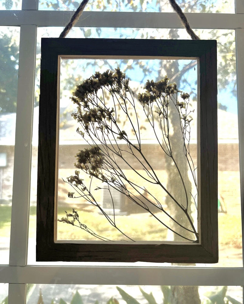 Add a touch of cottagecore charm to your living space with this beautiful handmade art piece. The wood framed pressed yellow flower hanging art is a perfect addition to any small space or window. The intricate design of the flower and the attention to detail make it a unique piece of folk art. This art piece is a one-of-a-kind addition to your collection. The framed piece measures approximately 10 inches in height and 8 inches in length plus about another 5 inches for the rope. Bring the beauty of nature into your home with this stunning piece of art.