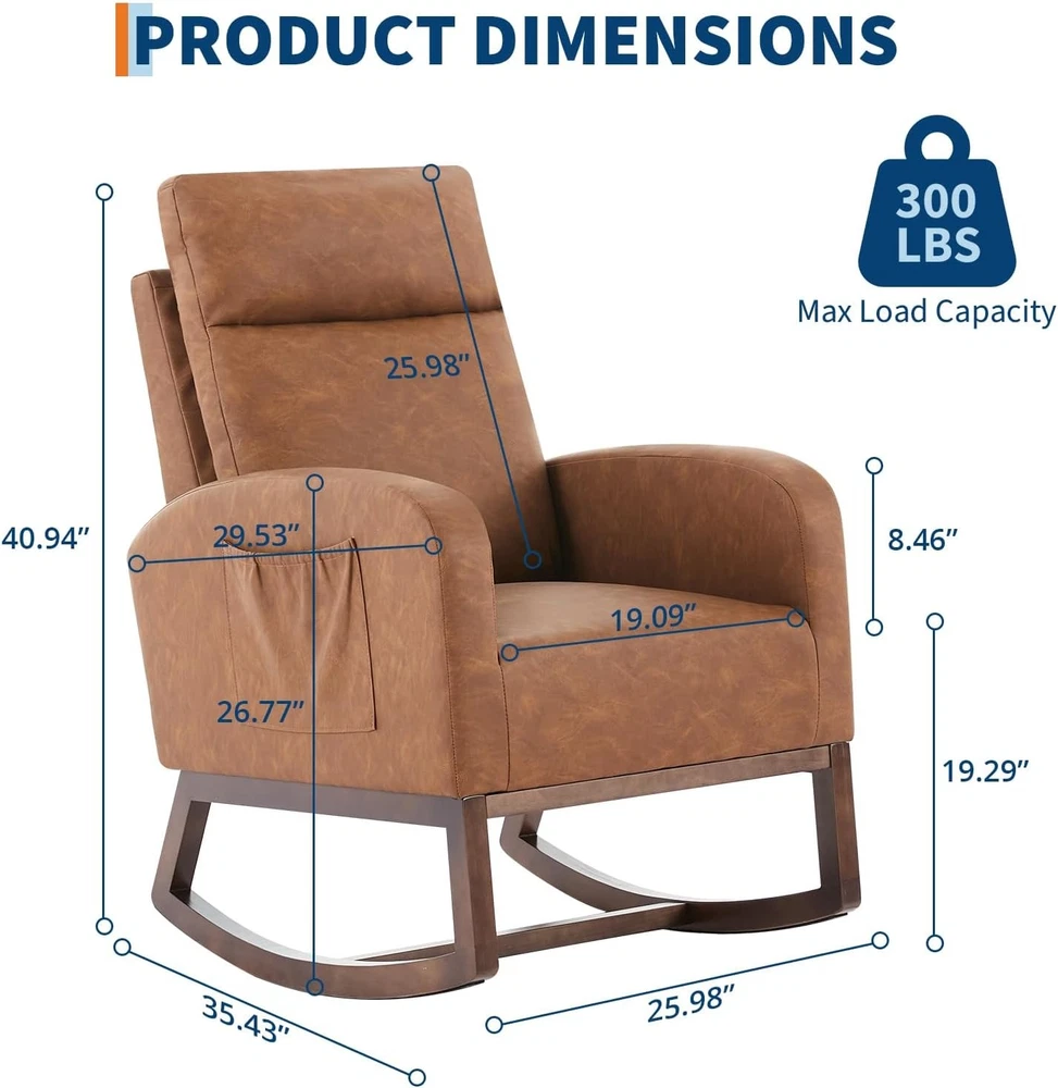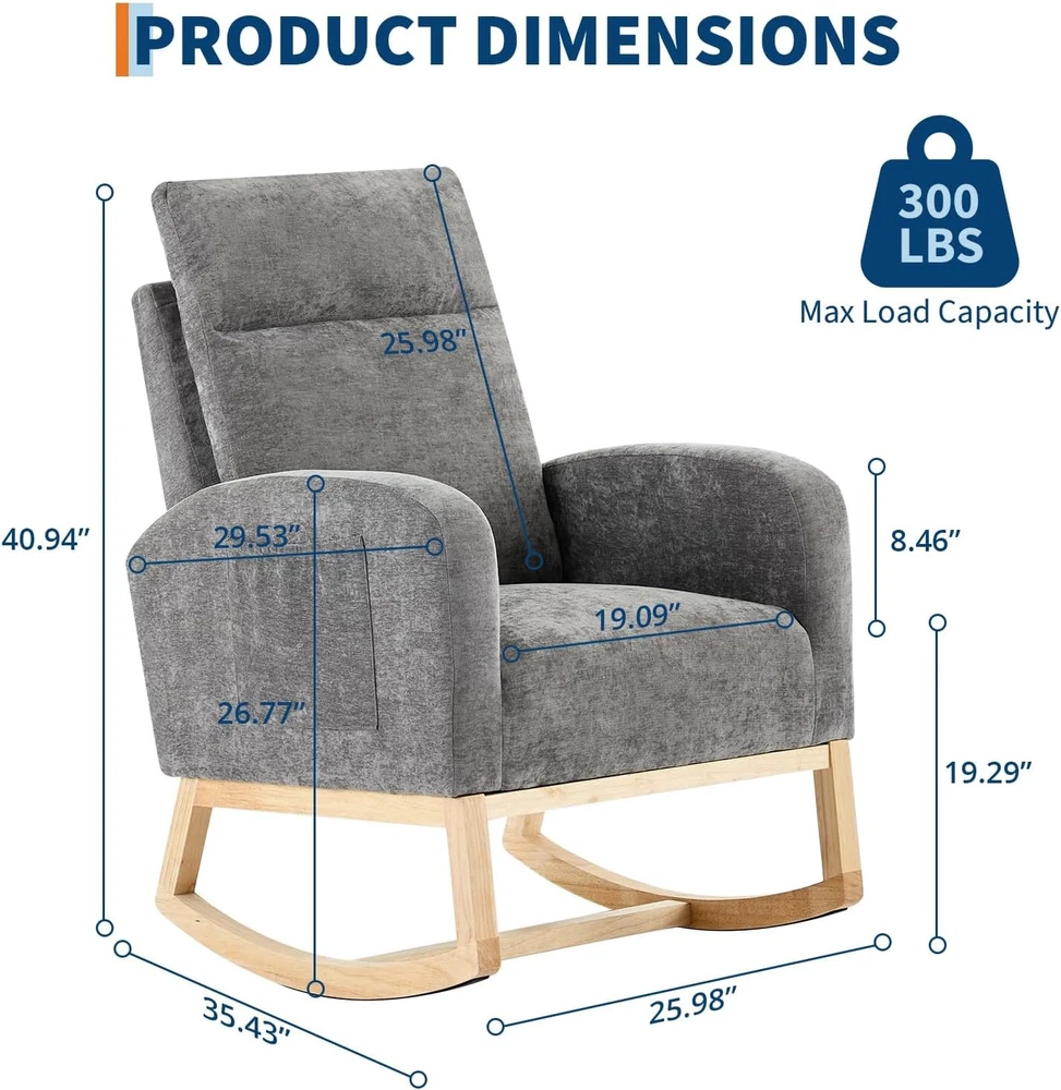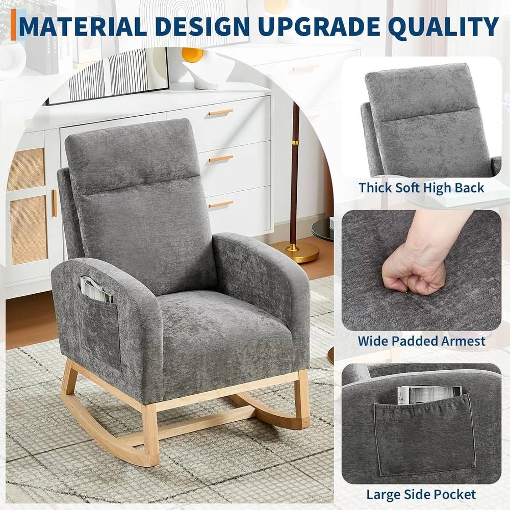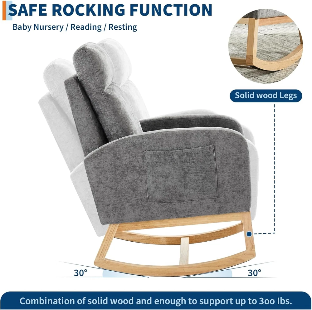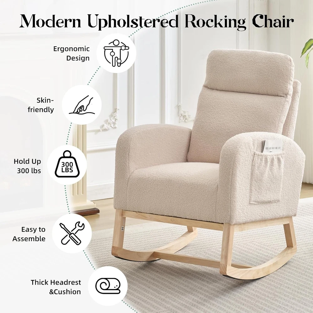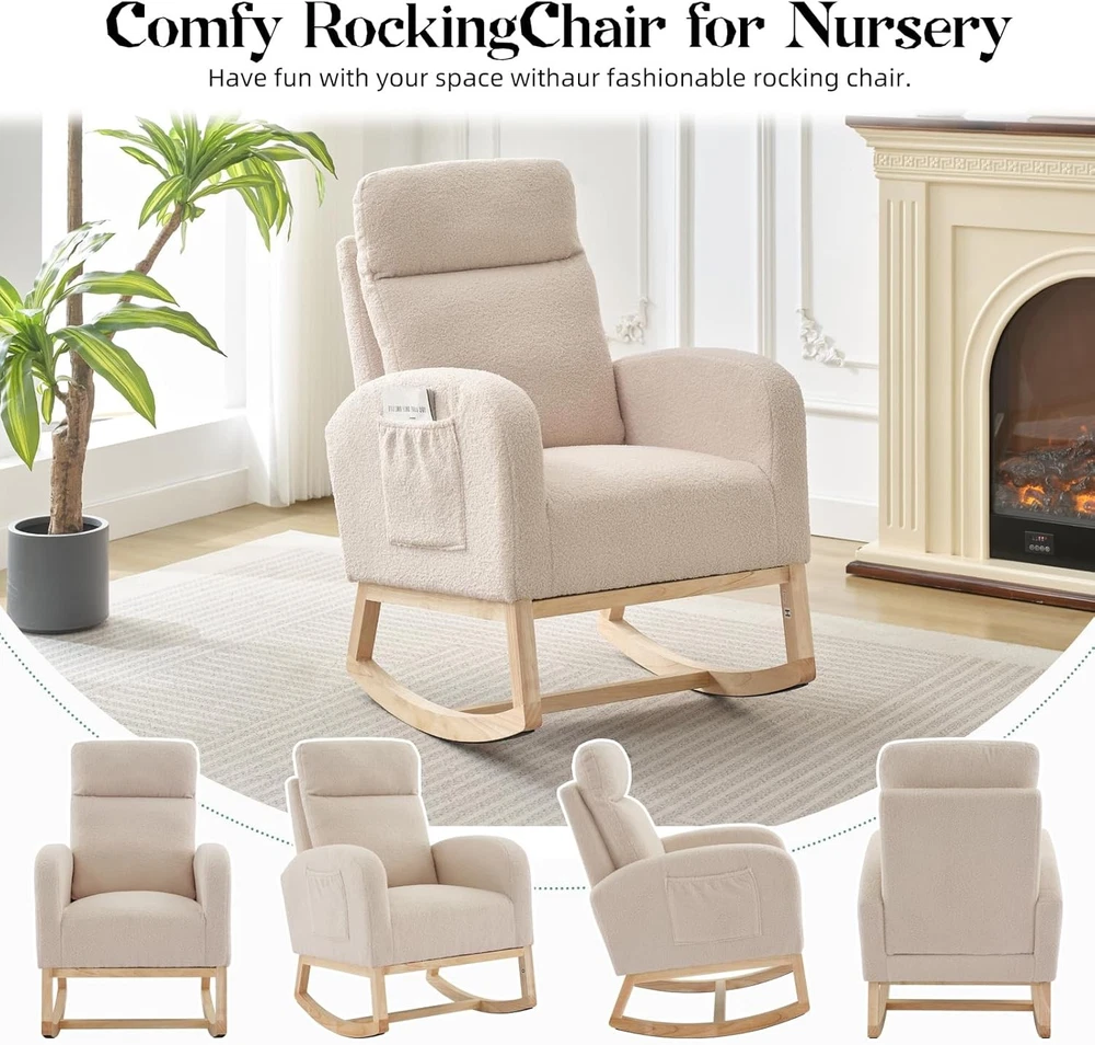 Product description Nursery Rocking Chair:The rocking chair frame is made of solid wood and a thickened rubber wood base,Super sturdy,with a weight capacity of up to 300LBS,The non-slip pad at the end of the wooden legs can not only bring a soothing effect,but avoid scratching the floor. Teddy Velvet Fabric:Upholstered with durable,soft,skin-friendly Teddy fabric that is gentle and non-irritating to the touch.The surface of rocker chair is breathable and easy to maintain.Durable and won't fade,wrinkle or pill over long periods of use. Side Pocket & Anti-tipping Stopper: The rocking chair has a storage pocket on each side that keeps your recently read books or magazines close at hand, making it the ideal reading nook for you. The plastic stoppers installed at the ends of the chair legs keep you from tipping backward Smooth Rocking:The rocking design of this chair is a great choice for mothers to coax their baby into sleep with free hands,When rocking,the angle range is 80°-130°Apart from that,the eleders can sit on rocking chairs to rest or read books to relax their mind and body by smooth rocking,mecedoras para dormir bebes. Versatility: With a combination of elegant appearance and rocking function, this boucle accent chair is ideal for living rooms, nurseries, bedrooms, study rooms and any other room in your house. With this super comfy accent chair, you can create a relaxing and entertaining corner.