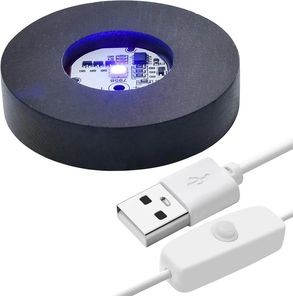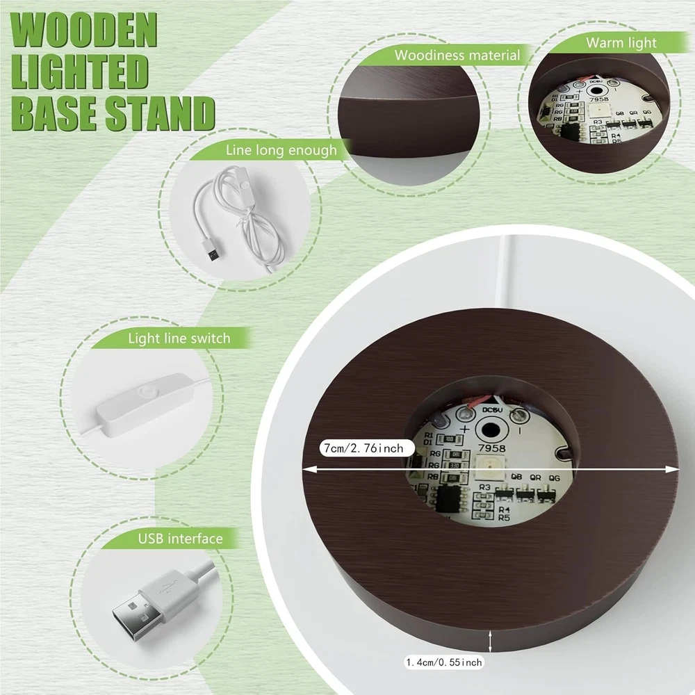 Wood LED Light Base for Acrylic, Resin, Crystal, Glass Art, 7 Color Cycle USB Crystal Sphere Holder, Round Lighted Display Stand for 3D Crystal (2.75"-Single) 【Energy Saving and Convenient】The light base voltage is 5V, equipped with USB cable with button switch, one button switch power, energy saving and convenient, a variety of connection power supply, can be connected to the computer, charging bank, mobile phone charger and so on. 【Durable Material Crystal Ball Holder】Made of mahogany, The display stand wood grain is clear and natural, the edge is rounded and smooth after fine grinding, looks elegant and generous, more durable; Widely used: can be used to place crystal, glass, acrylic, jewelry, resin and other items. 【LED Light Display Stand】 Seven colors cycle light base, make any transparent object become bright, like a rainbow, the effect is very spectacular for lighted display base. 【Very Wide Application 】The display base can be used as a night light in your room; Suitable for bedrooms, living rooms, children's rooms, bars, shops, restaurants, cafes, offices, etc