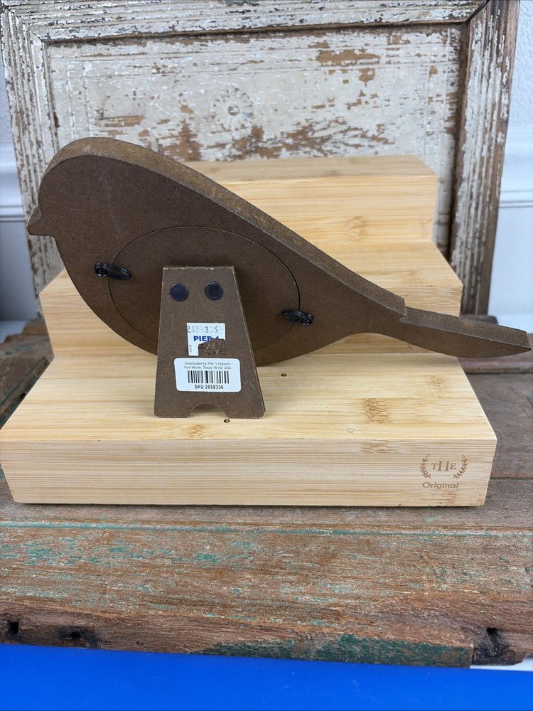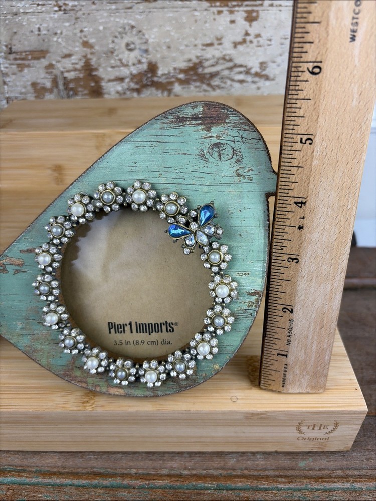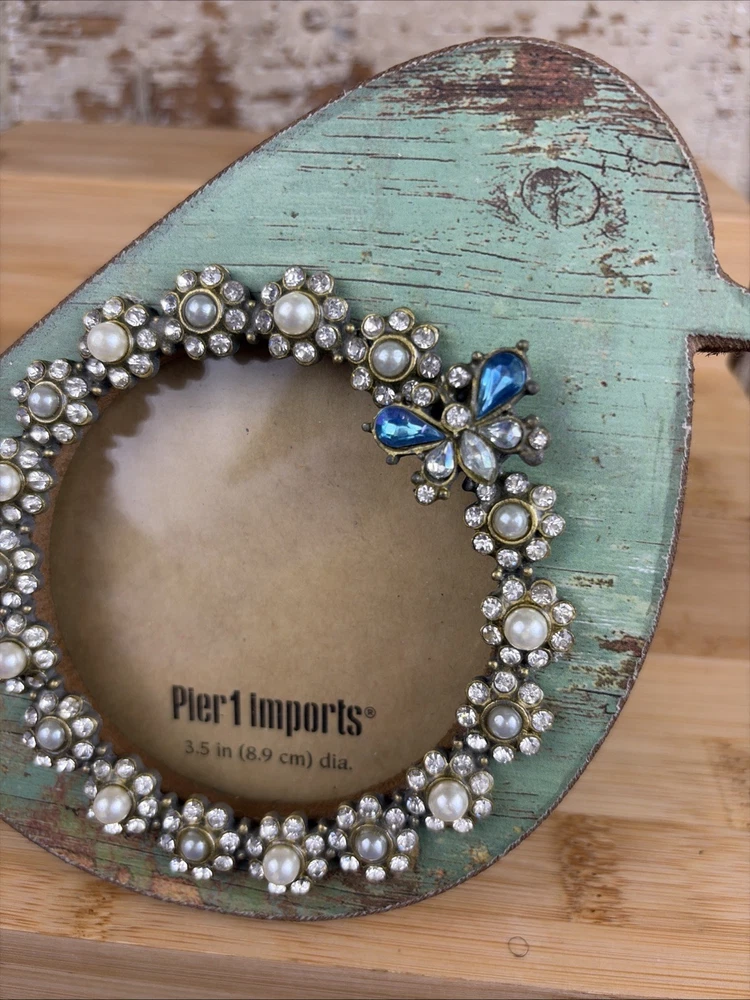 Wood Pier 1 Imports Green Distressed Bird Photo Frame 3.5" Rhinestone & Pearls Nice condition. Stands about 6” tall. Fits a 3.5” picture. Round window.