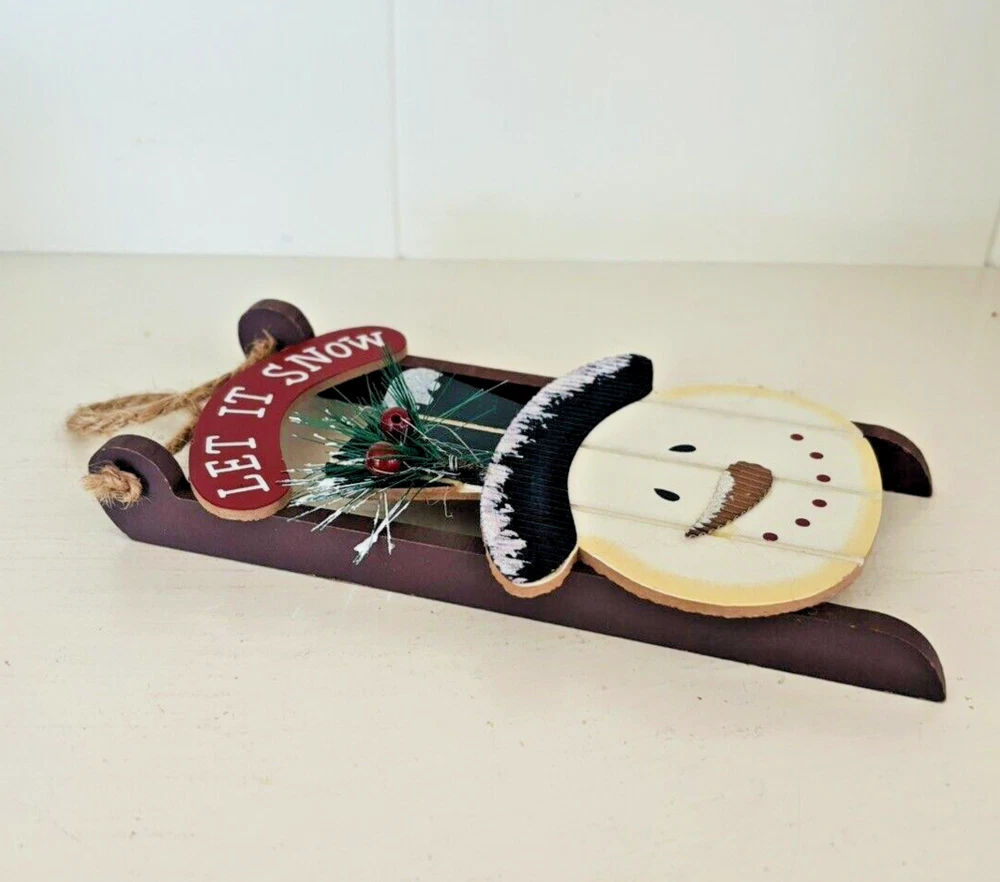 This adorable rustic wood snowman/sled ornament measures approximately 7" x 3-3/4" x 5/8" and is in terrific used condition. It is adorned with glitter and a little spray of bottle brush needles and holly beads. A darling piece of holiday decor ready for display. Feel free to reach out with any questions. I take great care when packaging and ship within one day of purchase. Thank you so much for stopping by! **Please understand this is a vintage and/or used item that may show wear due to age and use. This could include fading, scuffs, scratches, cracks, chips, crazing, marks, nicks, paint/detail loss, etc. Please review all photos before purchasing. All items are sold AS IS.**
