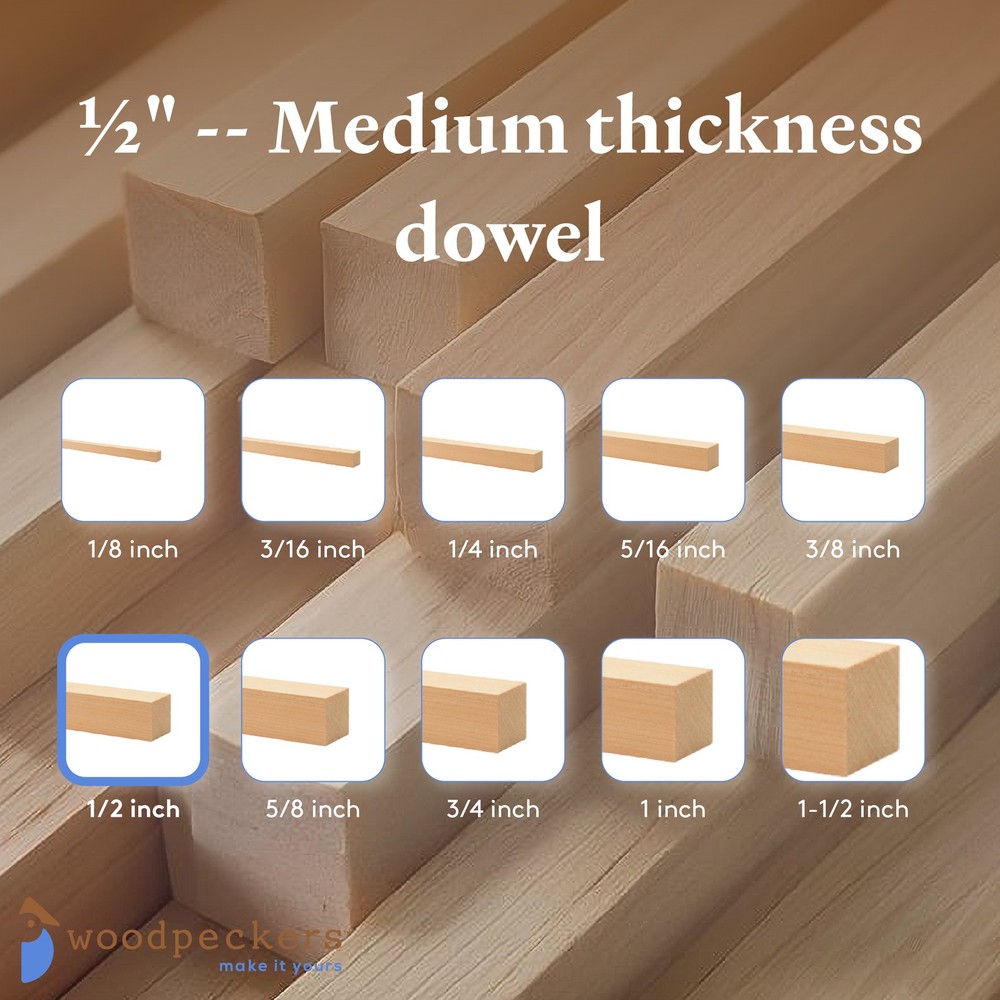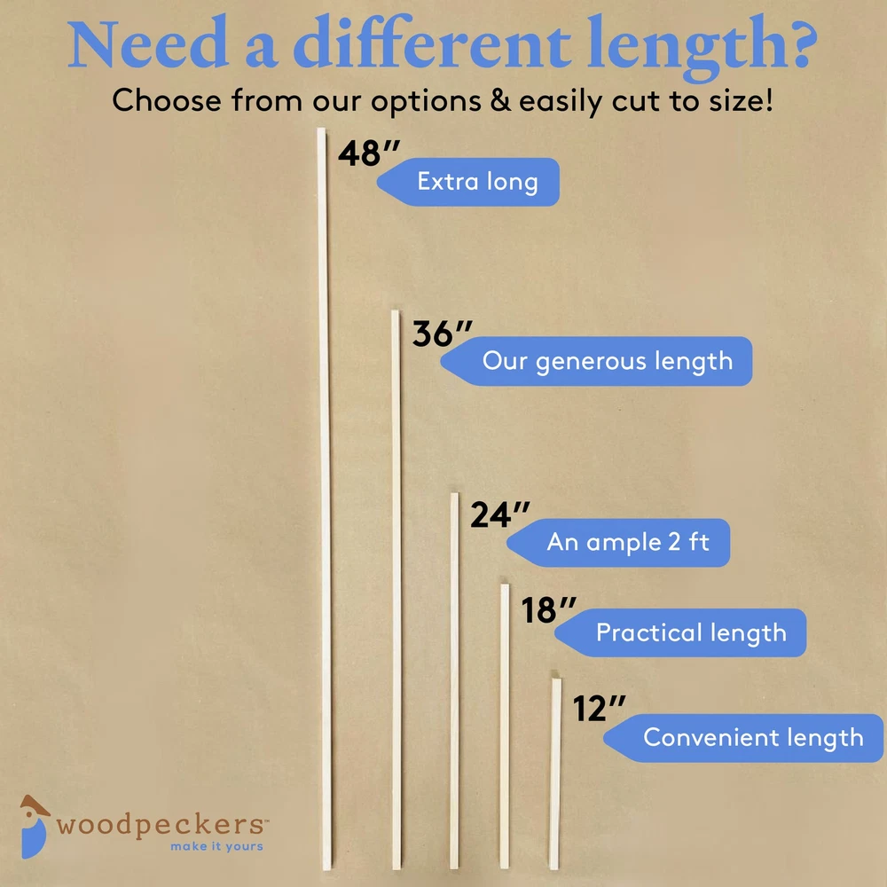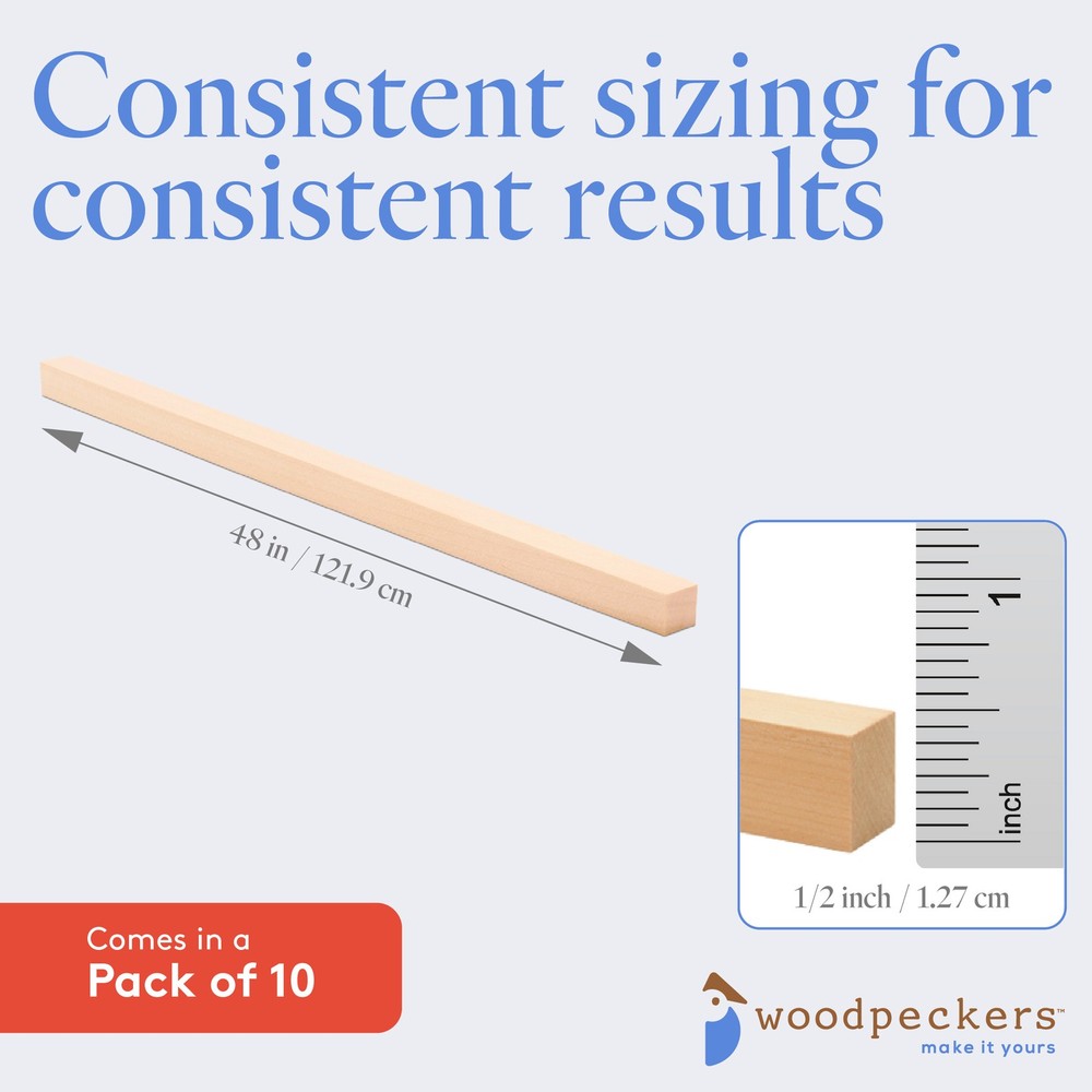 Woodpeckers Birch/poplar Wooden Square Dowels 1/2 inch x 48 inchIf you like your wooden dowels square... you'll love our wooden dowel rods! They are -· Hardwood - our hobby wood dowels are made of solid hardwood birch/poplar· Straight and smooth - at medium thickness, these 5/8" x 48" square wooden rods are ready to use right out of the bag· Beautifully unfinished - our square wood rods have a light and beautiful grain. They're beautiful enough to leave as-is, and are easy to paint or stain.