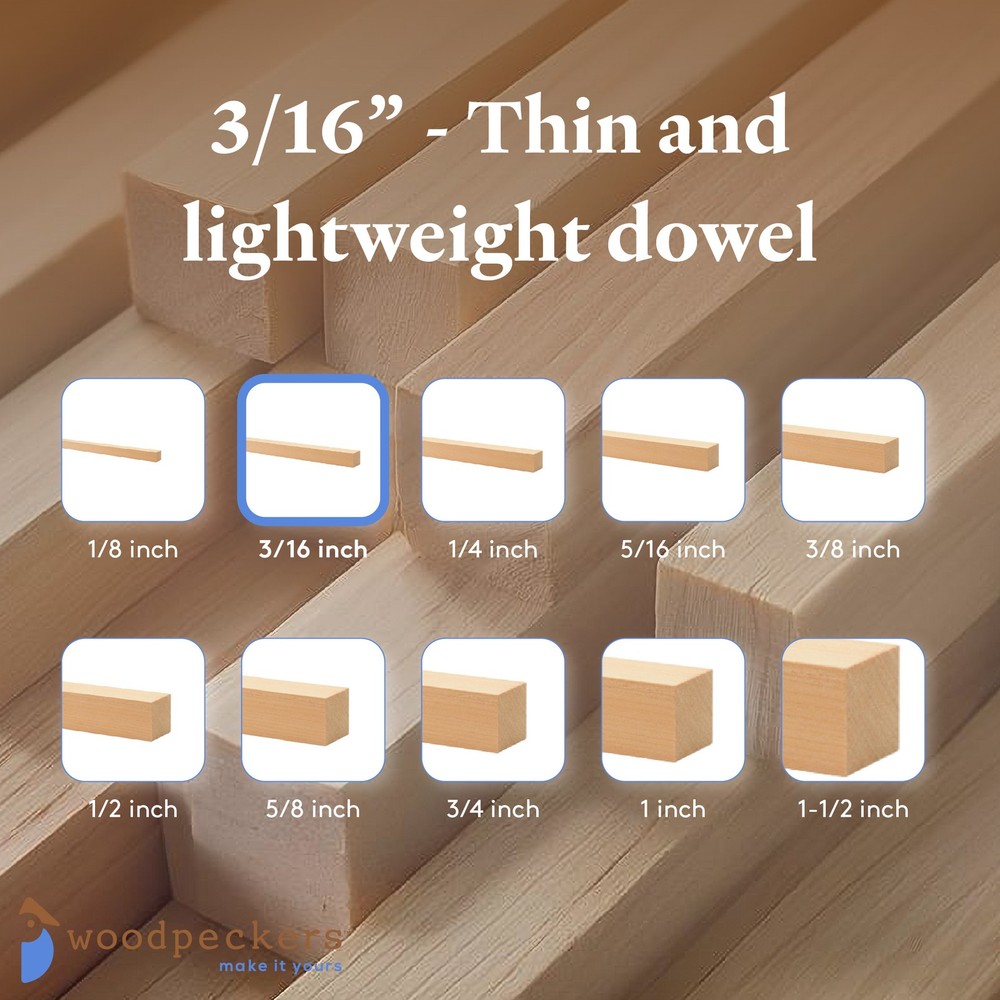 Woodpeckers Birch/poplar Wooden Square Dowels 3/16-inch x 48 inchIf you like your wooden dowels square... you'll love our wooden dowel rods! They are -· Hardwood - our hobby wood dowels are made of solid hardwood birch/poplar· Straight and smooth - at a skinny 3/16", these 48" square wooden rods are ready to use right out of the bag· Beautifully unfinished - our square wood rods have a light and beautiful grain. They're beautiful enough to leave as-is and are easy to paint or stain.