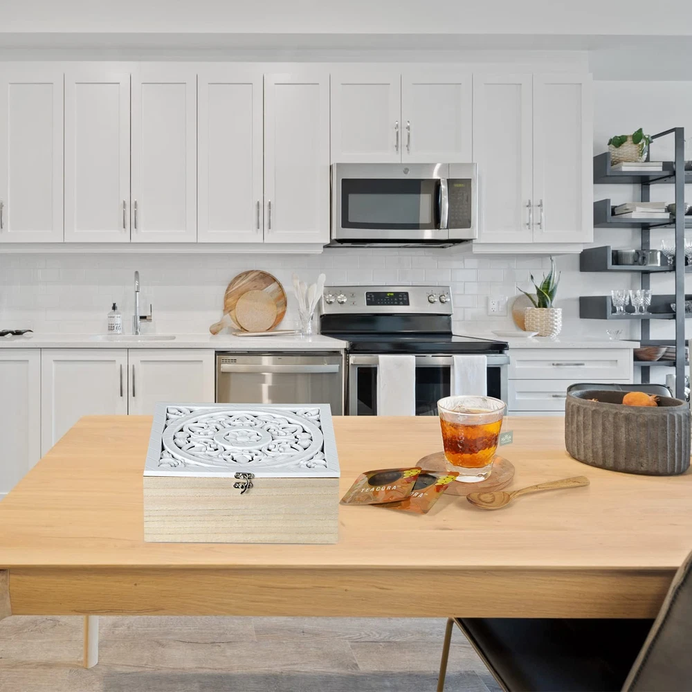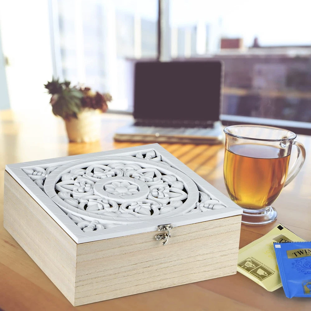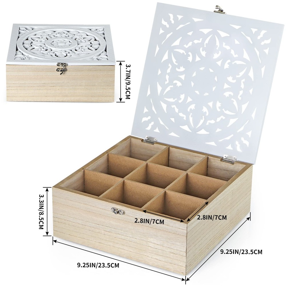 Unit Count: 1.0 Item Package Quantity: 1 Material: Wood Number Of Compartments: 9 Closure Type: Latch Brand: Does not apply Assembly Instructions Description: Remove Dividers And Customize The Look As Desired. EAN: 0616430911269 ISBN: 0616430911269 Type: Does not apply Storage Volume: 5246.3 Recommended Uses For Product: Tea Bag Storage Color: White Weight: 2.47 Pounds gtin13: 0616430911269 Item Shape: Rectangular Country of Origin: China UPC: 616430911269 Package Dimensions LxWxH: 10.08x9.96x4.21 Inches Assembly Instructions: Diy Pattern: Floral Material Feature: Durability Size: 9.25 Inches × 9.25 Inches × 3.7 Inches (L × W × H) Style: Classy Opening Mechanism: Lift-Off Lid