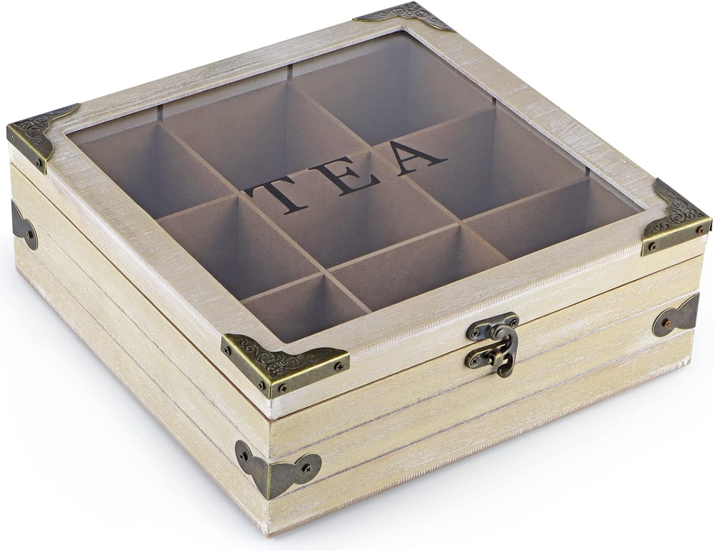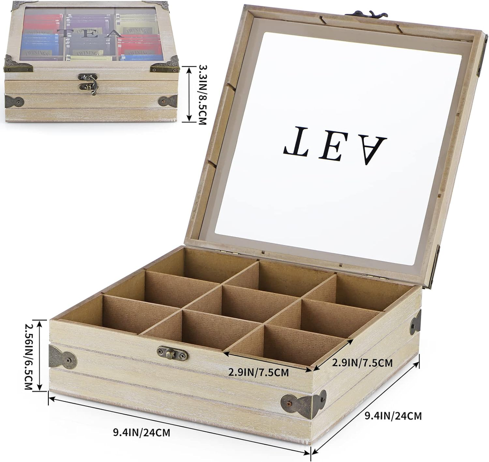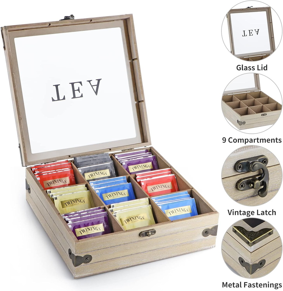 Wood Tea Box Organizer, Tea Storage Chest with Glass Lid, 9 Compartments, Tea Ba