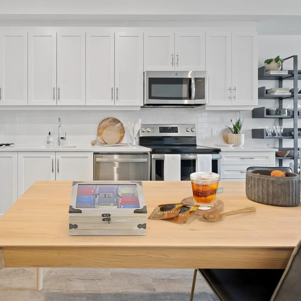 Store New Arrivals Add to Favorite View Feedback Wood Tea Box Organizer, Tea Storage Chest with Glass Lid, 9 Compartments, Tea Bag Holder for Cabinet, Pantry Description Number of Items 1 Closure Type Latch Number of Sets 9 Is Microwaveable No Unit Count 1.0 Count Item Volume 4896 Cubic Centimeters Batteries required No Product Dimensions 9.4"L x 9.4"W x 3.3"H Material Glass, Wood Item Form Box Container Shape Square Item Package Quantity 1 Is Dishwasher Safe No Item Weight 1.94 pounds Material Feature Durable, Non-Porous, Temperature Resistant, Transparent Special Feature Portable Color Gray Size 9.4"×9.4"×3.3" (L×W×H) Product Care Instructions Hand Wash Only Number of pieces 1 MATERIAL: Made of wood, the glass lid is transparent, so you can clearly check the tea bags in the tea box organizer SIZE: 9.4"×9.4"×3.3" (L×W×H), each compartment is 2.9"×2.9" (L×W) RUSTIC LOOKING: The wooden tea box looks very pretty with a nice weathered finish and the metal fastenings on the corners. Also has a vintage latch for securing 9 COMPARTMENTS: The tea bag holder has 9 compartments for storing a variety of teas, and the dividers are removable, you could DIY the look just you like FREE UP SPACE: Tea box makes keeping all your favorite tea in one place easy, freeing up the space in pantry, counter, table Product description Product Details Glass Lid Clear top allows you to easily view and find your favorite tea bags, also makes it beautiful to display. Vintage Latch Features a vintage latch for securing the contents, easily open and close the lid. Removable Dividers You could reorganize the compartment to store more types of things like coffee capsules, crafting supplies. Tea Storage Box Made of natural wood with weathered finish, fits your farmhouse and rustic decor nicely 9 compartments fit a good amount of tea bags, have all your tea bags nicely arranged and easily accessible, no more digging through the cupboard to find them Tea chest is 9.4"×9.4"×3.3" (L×W×H), each compartment is 2.9"×2.9"×2.56" (L×W×H) Make a great gift for tea lovers It's a cute way to organize a variety of teas, keeps all your favorite tea in one place easy, handy to have out and helps clean up your counter. ABOUT US We offer the best prices around on high quality products. Our E-store includes media such as books, movies, music and games while offering electronics, toys, sporting apparel, clothing, tools, general home, garden items and more. SHIPPING We are always working hard to ensure your package arrives as soon as possible. Please understand that some factors like weather, high postal traffic, and the performance of shipping companies are outside of our control. We offer free shipping to the lower 48 states and ship within 2 business days of payment, usually sooner. We do not accept P.O. Boxes. Please provide a physical address. RETURNS We offer a 30-Day Return Policy on items which you are not completely satisfied with. You have the option for a full-refund or an exchange of the item. No returns are available on items shipped outside of the USA. PAYMENT We accept PayPal. CONTACT US This page content is yet to come Please ad us to your favorite seller and visit again later Thank You