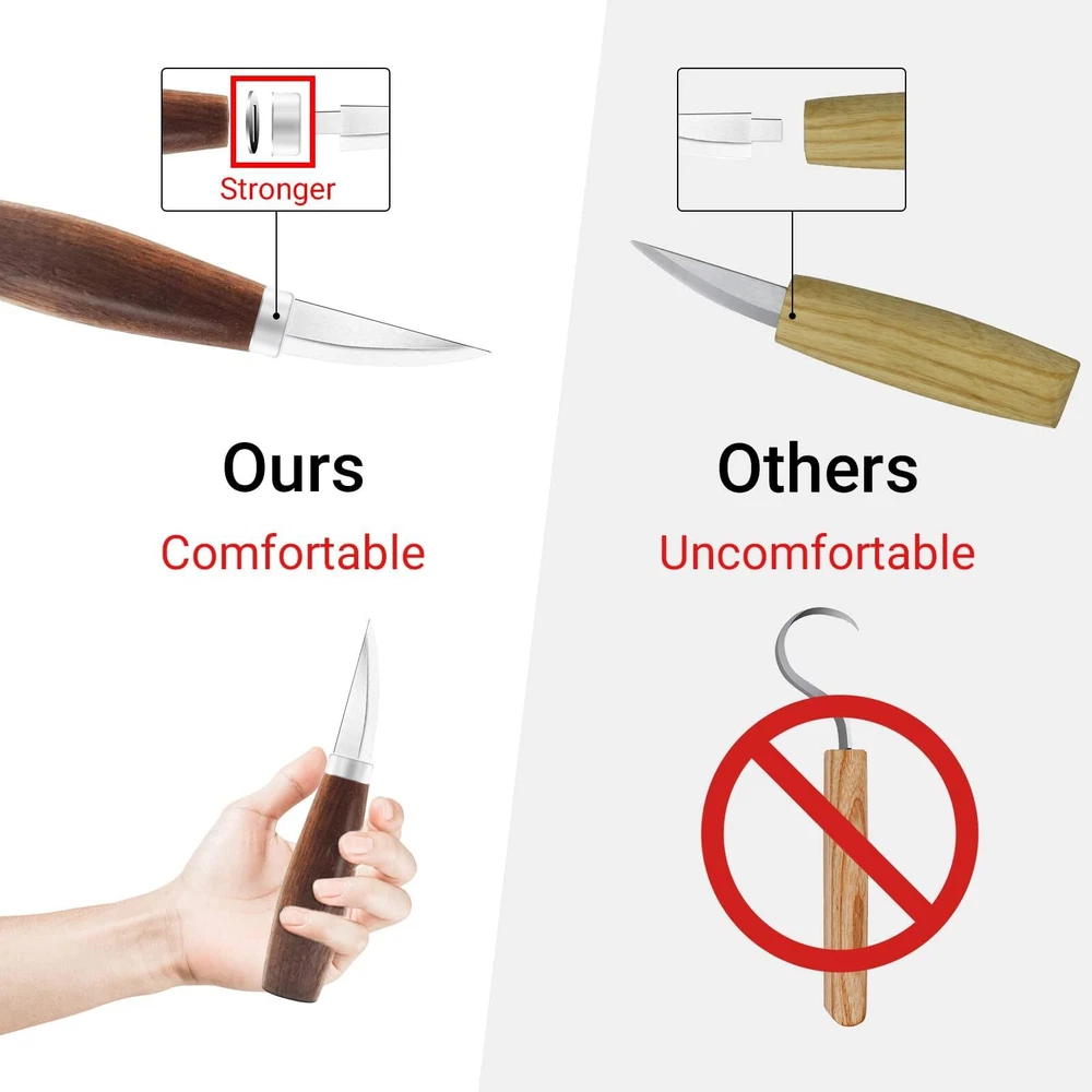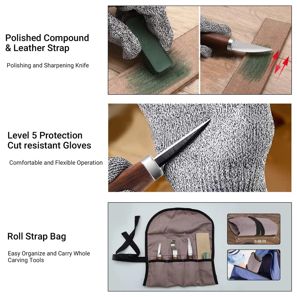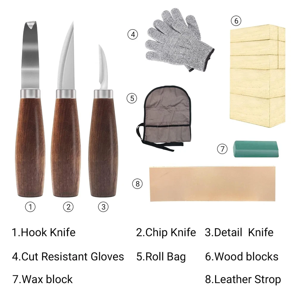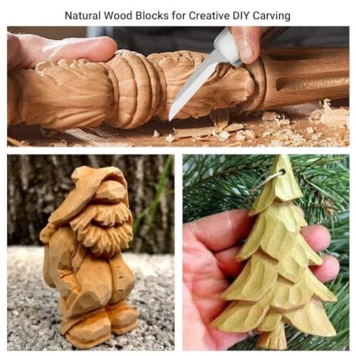 Our woodcarving tool set includes: Detail knife Culling knife Hook knife Artificial leather Polish, tool bag A pair of cut-resistant gloves 6 wooden blocks (including 4 large and 2 small) 【Knife with Wood】Our whittling kits include 3 kinds of whittling knives, 8 basswood woodblocks, and cutting gloves, which are very suitable for wood carving toolset for beginners in wood craftsmanship. 【Round and comfortable handle】The rounded handle is made of walnut wood and is coated with a layer of varnish on the surface, which makes the hand feel softer and will not feel tired after long-term use. 【Strong and sturdy】The sharp blade makes the wood carving knife easy to use. It also has a metal cap to hold the blade in place and prevent the blade and handle from breaking. 【Reasonable Suit collocation】The pocket knife suit that you carry with you has an anti-roll belt for easy storage and carrying. Cut-resistant gloves can protect your hands from cuts and scrapes. The polishing and polishing mixture of leather can prevent the blade from rusting, making it smoother and sharper. 【Suitable for a wide range of people can be used as a gift】Not only suitable for children and beginners, but also professionals. Can be used as a gift to mothers, fathers, lovers, friends, let them experience the fun of wood carving!
