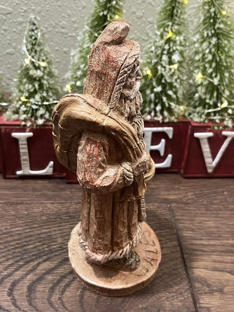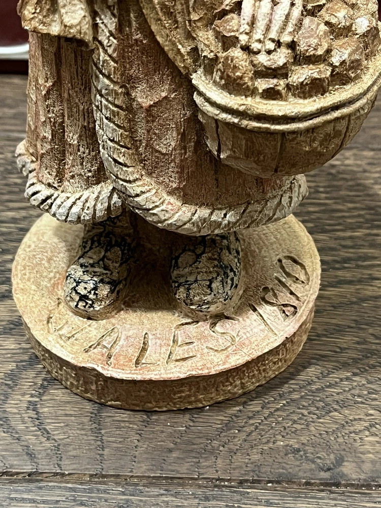 This collectible figurine from Wood World Inc. is a unique addition to any holiday decor. The figure depicts Santa Claus in an Old World Welsh costume, hand-painted with intricate details on a wooden base. Measuring 8 inches in height and 3-1/2 inches in width, it is a medium-sized piece that is perfect for display on a shelf or tabletop. The figurine is a limited edition item, part of the Old World Santa 1810 collection. It features an all-over multicolor pattern and is unboxed, ready to be displayed in any room of your home. Whether you're a collector or just looking for a special holiday decoration, this Santa Claus figurine is sure to impress. Preowned in good condition. This is a beautiful, highly detailed piece of art. Very heavy.