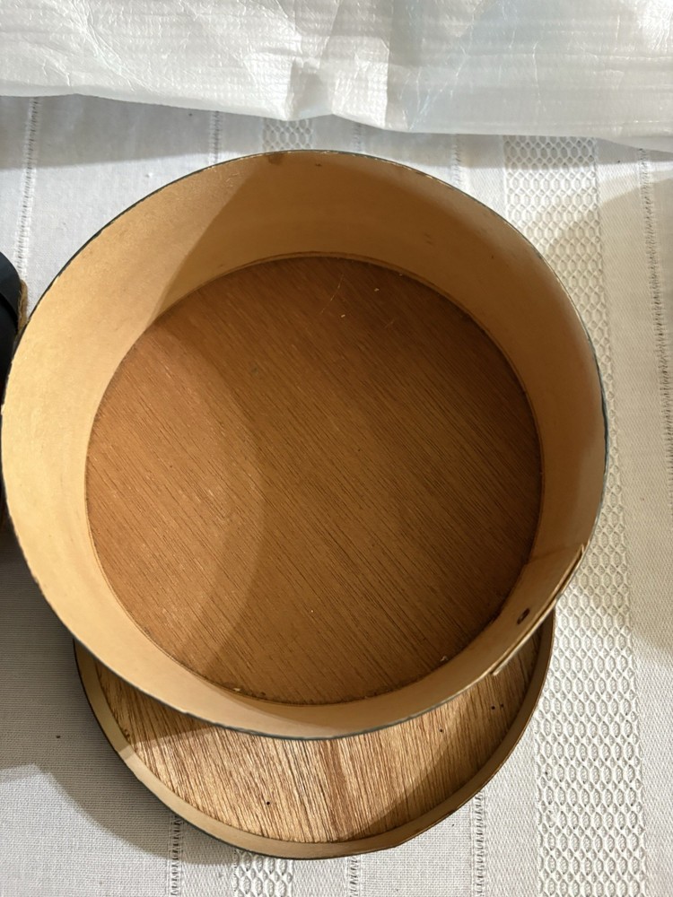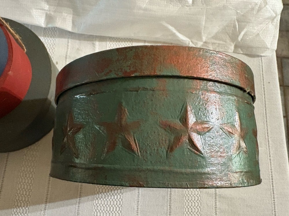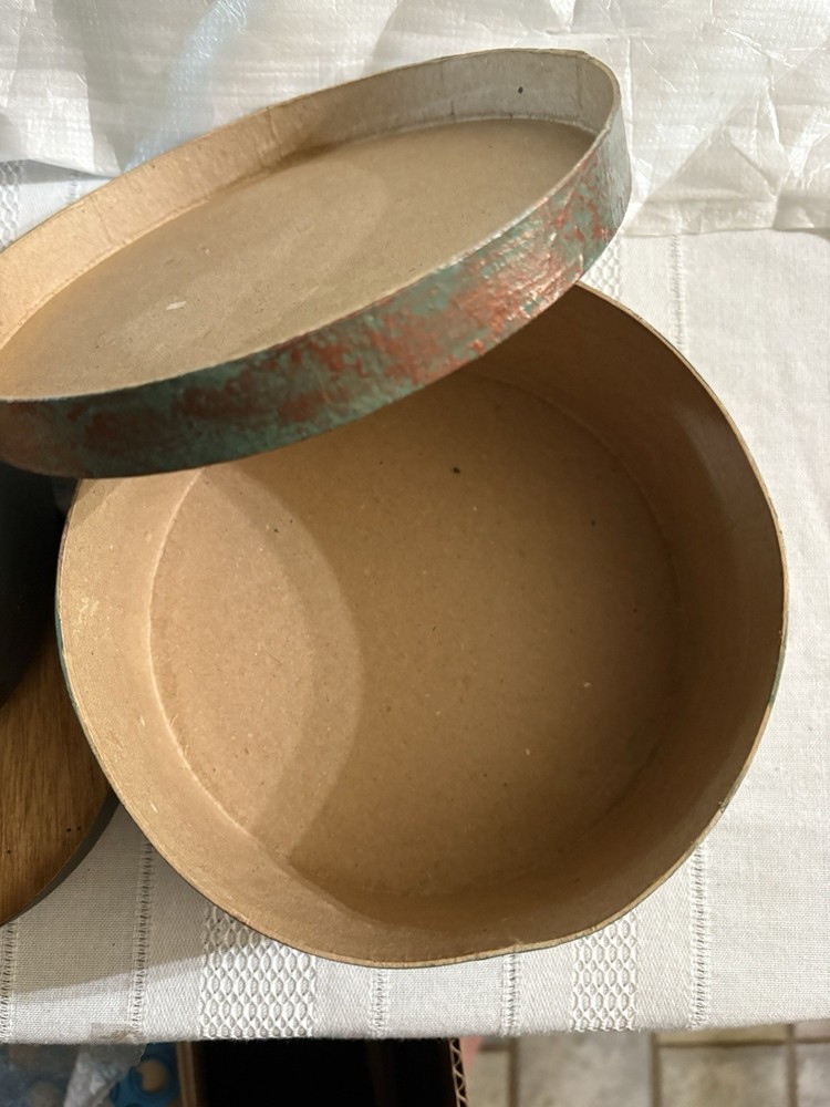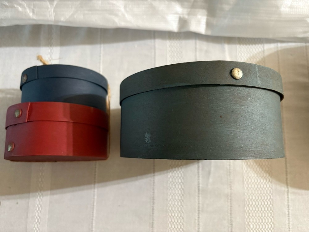 This product consists of three round wood chip boxes and one papier-mâché box, in red, blue, and green colors. These decorative boxes are perfect for teens, boys, adults, and kids who are interested in collecting and storing keepsakes. The boxes are from the 1990s and feature a lid closure for easy access. Ideal for period and style enthusiasts, this collection of boxes offers a unique and charming way to display or store small items.