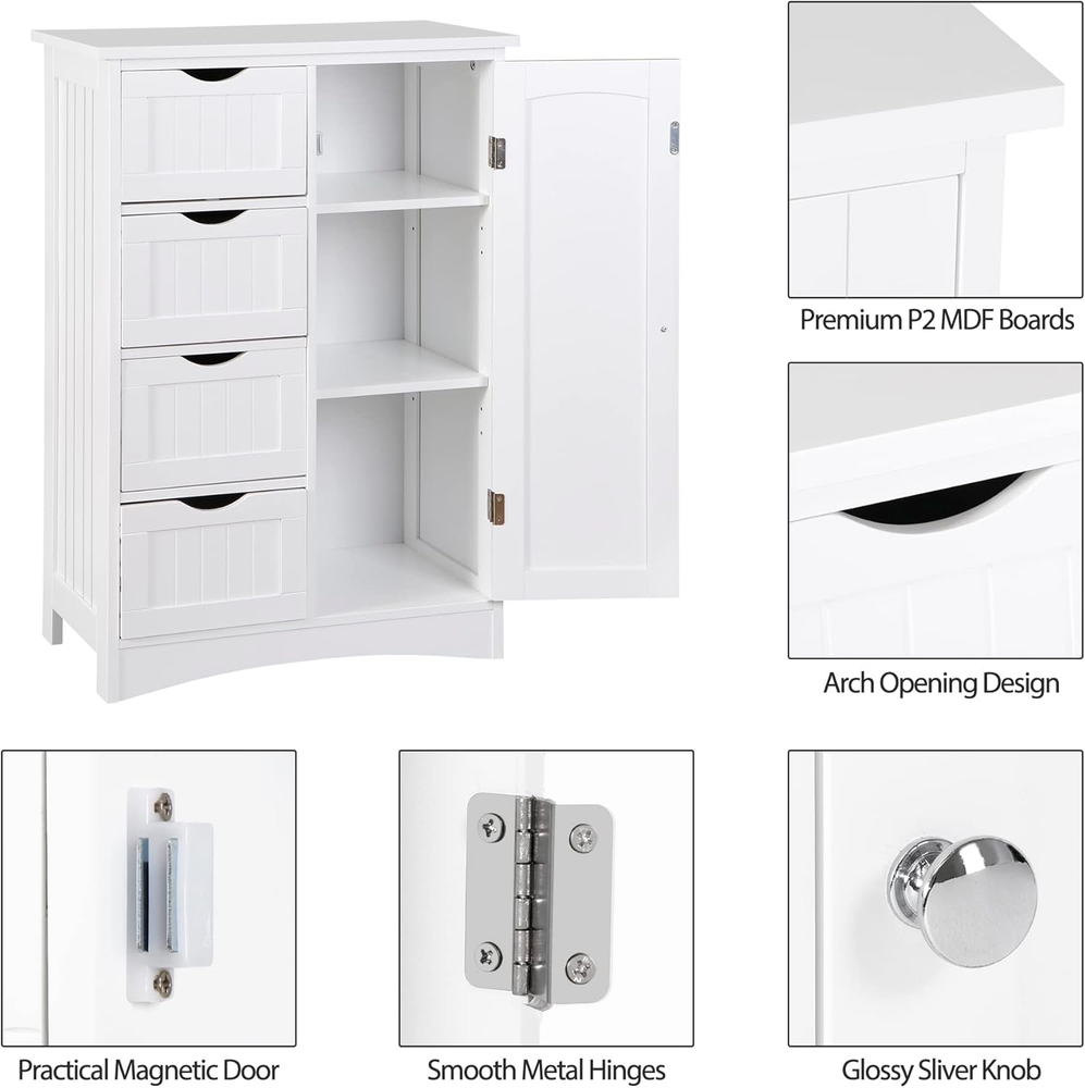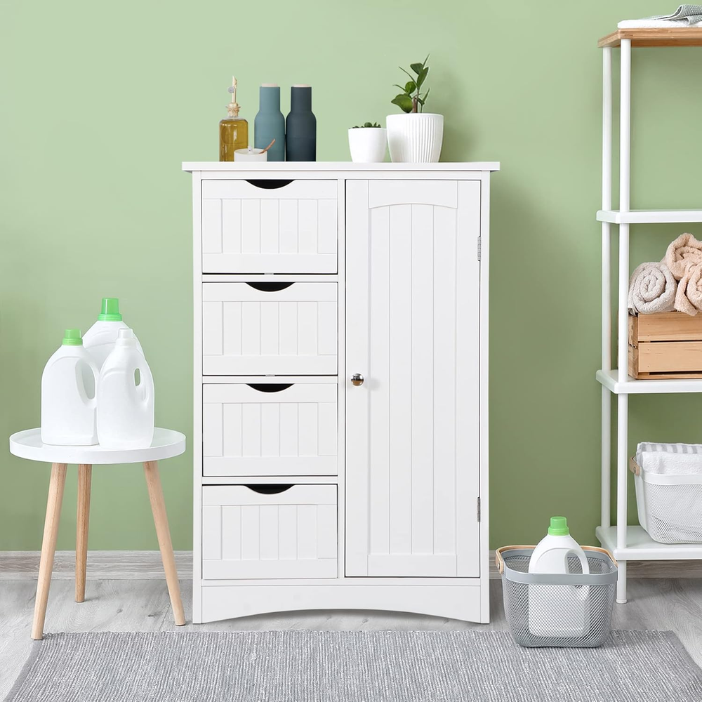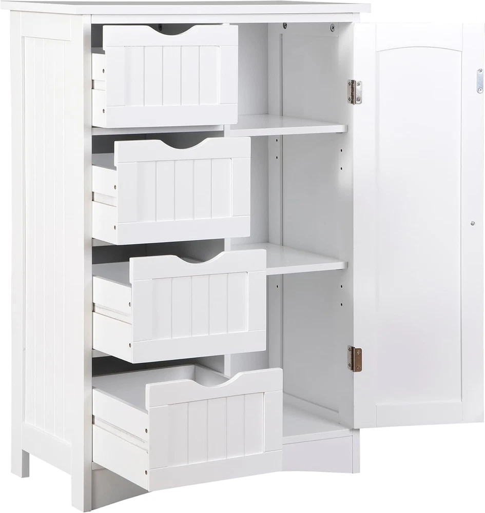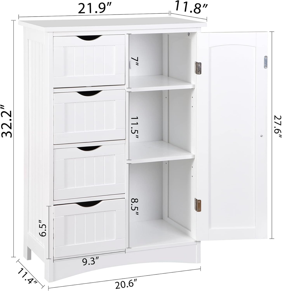 Stable structure: This wooden bathroom storage cabinet is made of high-quality MDF boards, which are not only sturdy and durable, but also fashionable and environmentally friendly.Waterproof coating for wet environments, suitable for extended use 4 Drawers and 1 Cupboard: This bathroom storage cabinet with 4 drawers and 1 cupboard can be classified and stored according to the type of item. The 4 drawers are suitable for small-sized items,The interior shelves of the cabinet have 3 adjustable heights to accommodate a wide range of product sizes; It makes organizing more convenient Easy installation and cleaning: Due to the bathroom organizers and storage cabinet's simple appearance and structure, it does not require a lot of time to install and is equally conservative to clean Modern style suitable for anywhere: This bathroom storage cabinet is designed modern, simple and elegant, suitable for any room. You can place it anywhere you want, bedroom, living room, study, etc Multifunctional use: For freestanding storage, its uses are very extensive; It can be used to place books, clothing, towels, and various things such as CDs, it can effectively avoid the stacking of room debris Product Description This white storage cabinet has a simple, elegant, and fashionable design, which can help you make good use of your home space, saving space. It is a modern style suitable for any place, adding a warm beauty to your home. Features: -- Large storage space -- Stable and safe construction -- Fashionable and easy to install -- Keep the family tidy and organized -- It is not just a piece of furniture, but also plays an important role in decorating a home Specifications: -- Color: White -- Shape: Rectangular -- Material : MDF -- Freestanding Cabinets Dimensions: 21.9"D ×11.8"W×32.2"H -- Net Weight: 15.7kg/34.6LB Package Content: -- Freestanding Storage Cabinet×1 -- Instruction×1