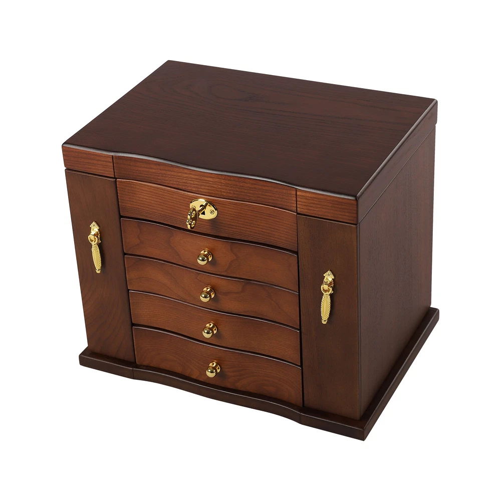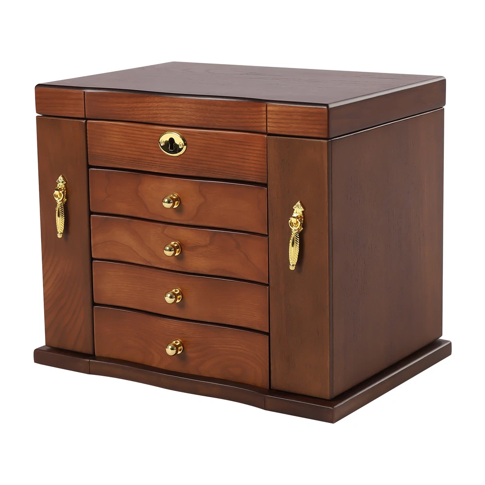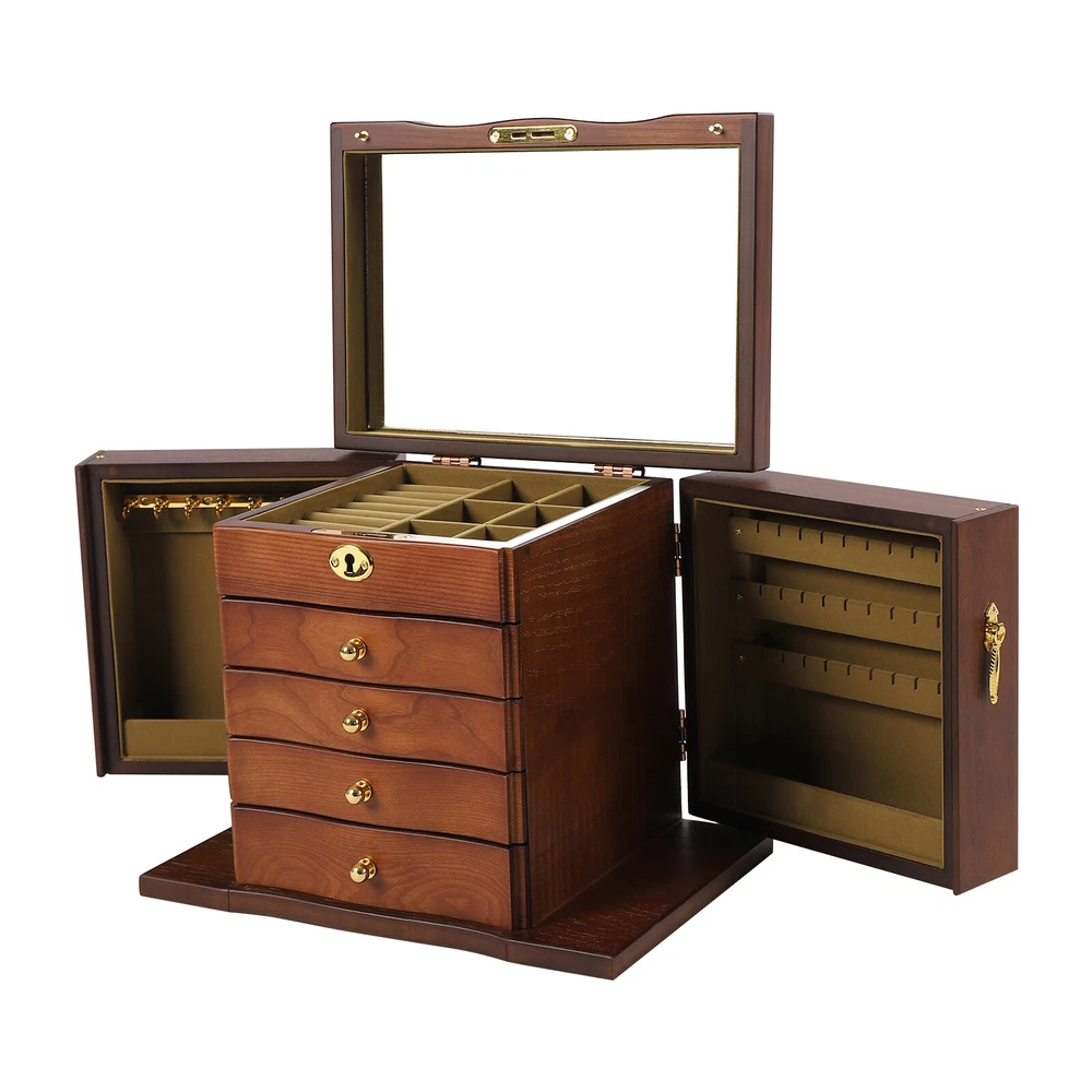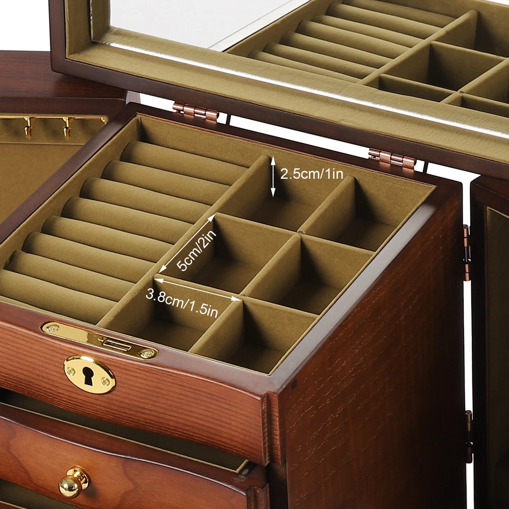 Wooden 5 - Layer Large 4 Drawers Jewelry Box Fit Wowen With Mirror Organizer Box Description This Wooden Jewellery Box is a perfect choice for your life. Multi-functional design will satisfy your different needs of storage. What's included? 1 x Wooden Jewellery Box Weights & Dimensions Weight:2.7kg Size: 27x19.2x24.3cm / 10.62x7.55x9.56inch Feature: [Elegant and Durable] Made of durable and high-quality solid wood and MDF with veneer and painting, which makes you enjoy all the functions of storage box. Because many compartments and functional parts are folded and stored together, a lot of space is saved. [Velvet Interior] The drawers and compartments are lined with soft velvet material, which can ensure that your jewelry is not affected by scratches or dents, so that you can safely store your jewelry. [Large Capacity Jewelry Box] This box includes a built-in mirror, 4 pull out drawers, 2 side compartments, and a top drawer. Contains earring hangers, ring rollsMetal jewelry hook for storing some other Jewelry. Enough space to satisfy your collection of various jewelry. [Safe Lock] The lid is designed to lock all drawers and cabinets firmly to protect your rings, earrings, necklaces, bracelets, watches and other jewelry accessories. [Meaningful Gift] Beautiful appearance and practical function, safety lock with key adds elegance and security. Ideal gift for Valentine's day, Mother's day, Thanksgiving, Christmas, birthdays and weddings. (Note: watches and jewelry are not included.) Specifications: Colors: Brown Layer: 5 layers+2 swing-out cabinets Types: with mirror Material: MDF+Wooden Lock: Key lock The first drawer : 6 slots + 1 ring slot The second drawer: 6 slots /Each size:4.6*4.6cm/1.81*1.81inch The third drawer: 4 slots /Each size: 7.1*7.1cm/2.79*2.79inch The fourth drawer: 3 slots /Each size: 4.6*14.3cm/1.81*5.62inch The fifth drawer: 1 slot/Size: 14.3*14.3cm/5.62*5.62inch Payment Delivery details Terms of sales About us Contact us Payment We accept ebay payment 。 Fees such as import duties, taxes are not included in the item price or shipping costs. These charges are the buyer's responsibility. Delivery details Shipping: 2-9 working days to: USA Terms of sales We maintain high standards of excellence and strive for hundred percent customer satisfaction. Feedback is very important to us. We hope that you contact us immediately before you give neutral or negative feedback, so that we can address your concerns. It is impossible to address issues if we do not know about them! About us Your satis faction is our ultimate goal. We work hard to earn your trust and future business. Our certified technicians have tested each item before shipping. The unit comes with 1 year limited warranty on all manufacturing defects. a) If you receive a defective item, you may return it or ask for a discount. Please contact us within 14 days after you receive the package. b) What you returned must be intact and in its original packaging as re? u. Customer is responsible for shipping costs of the returned item. c) We will cover the cost of shipping back t with the shipping rate indicated in the registration page. We will send you a new unit or refund the full payment you paid. Thank you. Contact us Business Hour Business Hour: Monday To Friday: 8:30 AM to 5:00 PM (Beijing China time) Due to time zones, our reply to your questions may not be immediately. But within above working time, we will reply your email within 24 hours. If it's non-workdays, please kindly be patient and wait till Monday. Please contact us with ebay message. Please feel free to contact us if you have any questions. Monday To Friday: 8:30 AM to 5:00 PM (Beijing China time) Due to time zones, our reply to your questions may not be immediately. But within above working time, we will reply your email within 24 hours. If it's non-workdays, please kindly be patient and wait till Monday. Please contact us with ebay message. Please feel free to contact us if you have any questions.