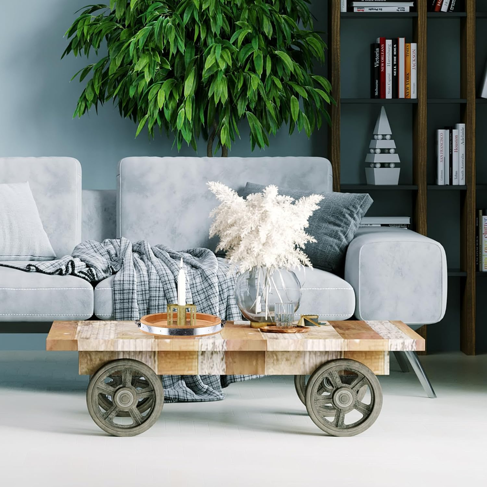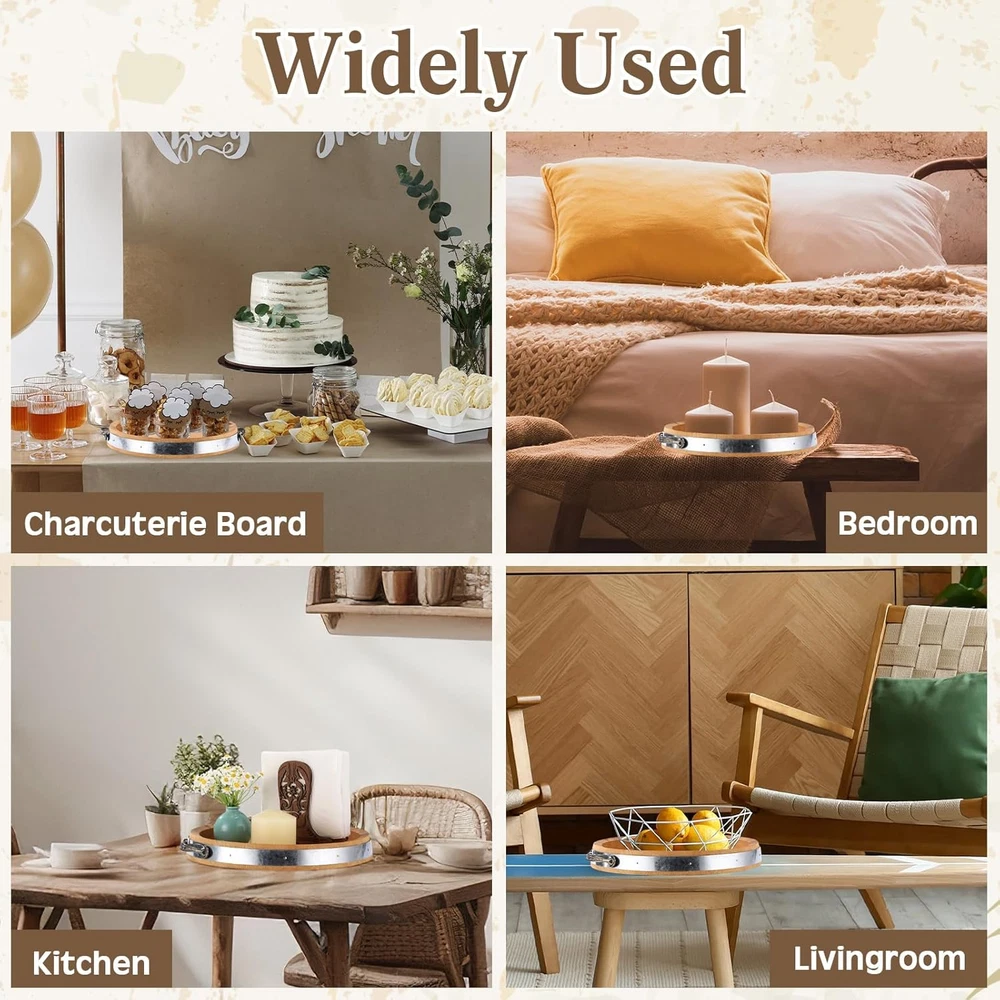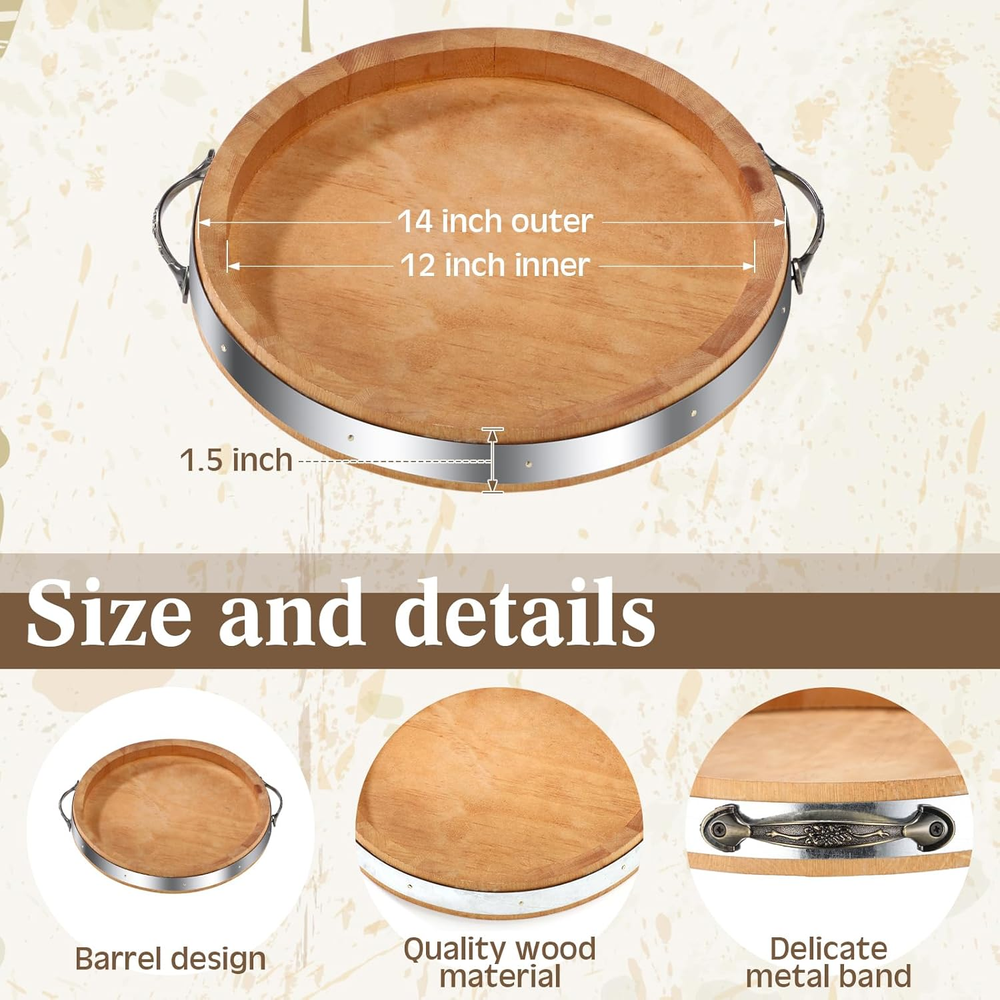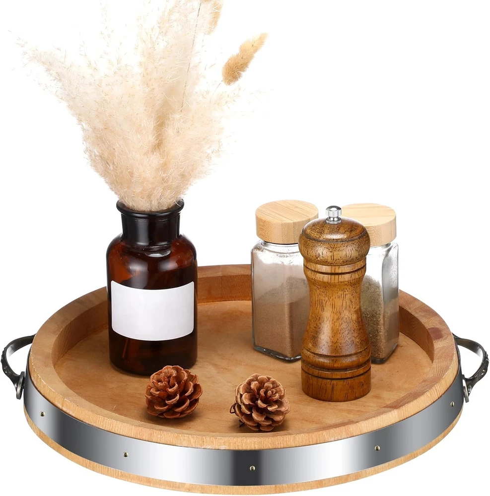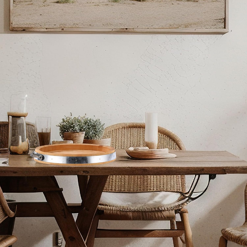 Wooden Barrel Serving Tray with Metal Handles 14" Round Wooden Table Tray Ottoman Stand