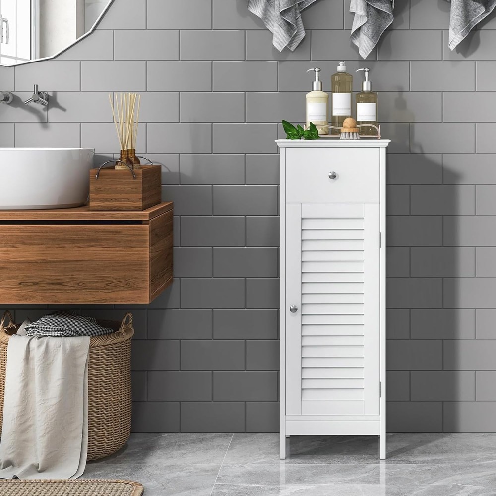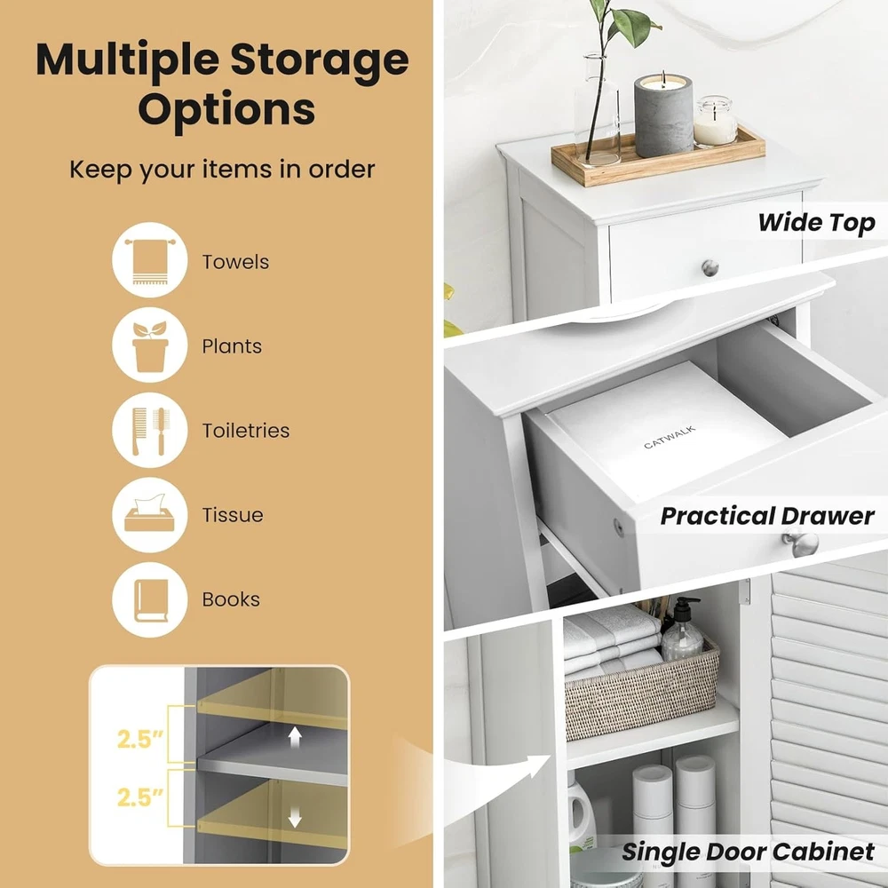 This bathroom floor cabinet is a game-changer! The adjustable shelf makes it super versatile—perfect for storing towels, toiletries, or even kitchen essentials. The white finish looks sleek, and the anti-toppling feature gives peace of mind. Sturdy, spacious, and stylish—exactly what I needed to declutter my space!