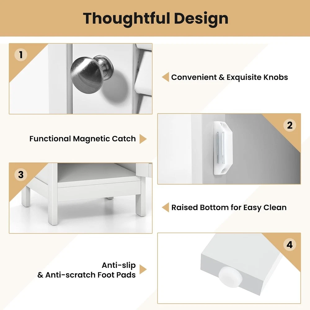 Bathroom Floor Cabinet, Wooden Side Storage Cabinet with Single Shutter Door and Inner Adjustable Shelf, Equipped with Anti-toppling Fitting, 13 x 12 x 34.5 inches (White) Product Description About this item 【Inner Adjustable Shelf】 The inner shelf could be adjusted in three positions, allowing you to freely set a suitable height according to your needs. This feature make this floor cabinet suitable for a lots of occasions. Definitely a great addition to bathroom, living room, kitchen and so on. 【Exquisite Lacquered Surface】 Adopting selected painting, the surface of the floor cabinet is rather smooth and water-proof, making it suitable for bathroom use or other humid environment. 【Anti-toppling Fitting Included】 We have prepared a set of anti-toppling fitting for this cabinet for added safety. It can be securely fixed to the wall to have around pets or kids. 【Easy to Assemble and Maintain】With the enclosed step by step instruction and necessary hardware, it is easy for you to have the bathroom floor cabinet installed in no time. Thanks to its smooth lacquered surface, it is convenient to clean and remove stains. 【 Promise】We proudly stand behind all of our products. If for any reason you are not satisfied with our floor cabinet, please contact us for solution and we are committed to making things right for you. We will respond within 24 hrs by offering feasible suggestion until problem is solved. Description Sicked of staying in a disordered room? Our exquisite and practical bathroom floor cabinet would be one of the rightest choice for you to start to own a tidy and clean room. Constructed of superior wood, together coated with selected painting material, this bathroom storage cabinet can withstand the humidity, especially suitable for bathroom or toilet use. With its chic and elegant appearance, it can also be used as a side cabinet to whether place it in the living room nor kitchen, adding a touch of elegance without any doubt! In addition, it is easy for you to clean it with a damp cloth due to the smooth lacquered surface. Just bring this storage cabinet home now! You won’t be regretted! Feature Minimalist yet practical design, matching most home decor Ample storage space, ideal for storing bath essentials, first aid kit, soaps, etc. Constructed of superior P2 MDF, assuring durability, stability, great load-bearing capacity Adjustable inner shelf for flexibility, storing things of different heights freely Shutter door design for extra air circulation to better store your belongings Lacquered surface designed to withstand the humidity, making it suitable for bathrooms Ideal for bathroom, living room, kitchen, entryway, hotel, inns Easy to assemble with detailed instruction and enclosed hardware set Specification Color: White Material: P2 MDF Overall dimension:13" x 12" x 34.5" (L x W x H) Feet height: 3" Drawer dimension: 10" x 6" (L x W) Net weight: 20 lbs Top board weight capacity: 20 lbs Shelf maximum weight capacity: 7 lbs Drawer weight capacity: 5 lbs Package includes: 1 x Bathroom floor cabinet