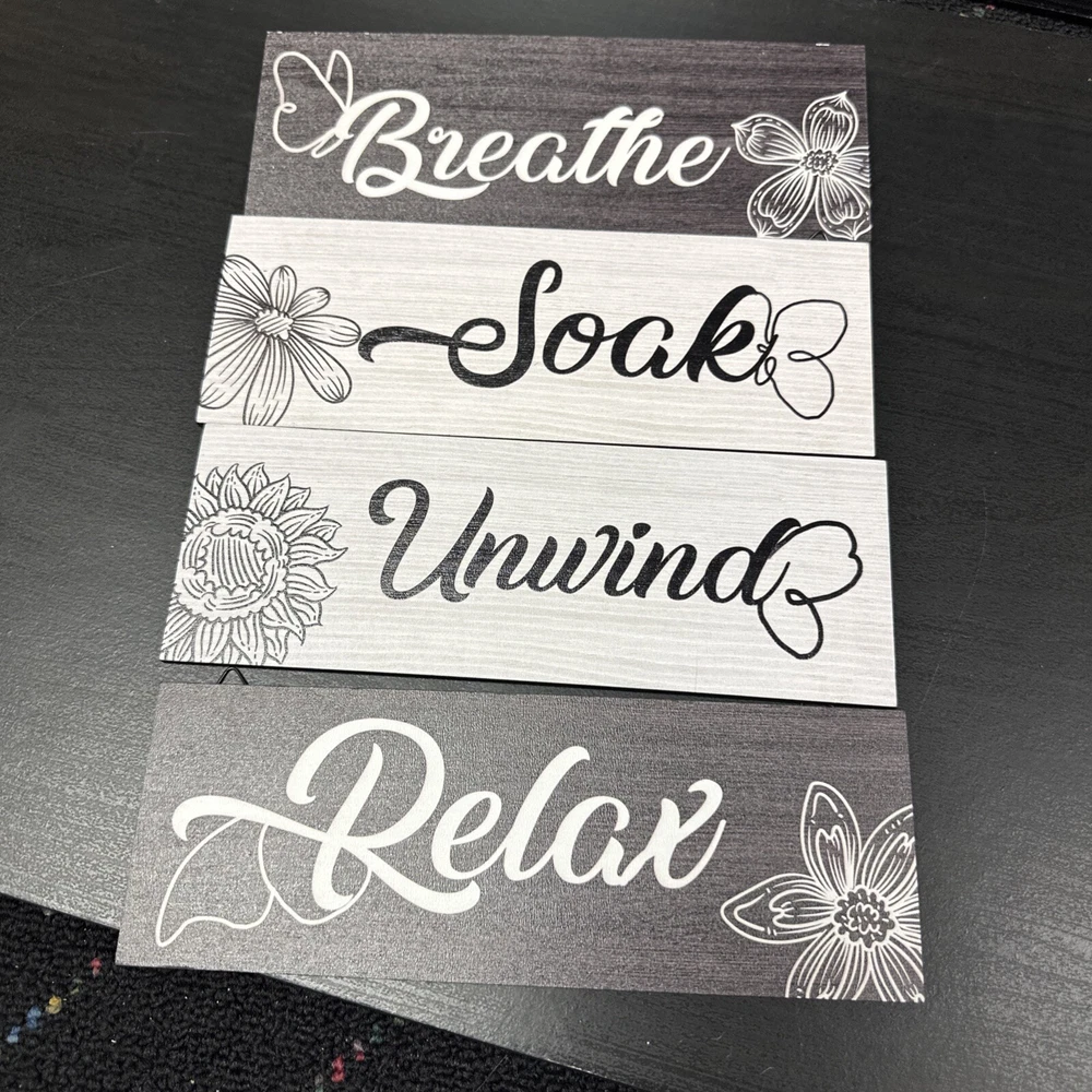 Included Components:4 x Farmhouse wooden bathroom wall signsColor:BlackMaterial:cyrstal, wood, WoodProduct Dimensions:3.5"L x 9.8"Wgtin13:7445019574563Shape:RectangularStyle:ModernItem model number:T-227Mounting Type:Wall MountItem Weight:8.1 ouncesNumber of pieces:4Batteries required:NoUPC:7445019574563Type:Does not applyCountry of Origin:ChinaBrand:Does not applyRoom:BathroomTheme:Words & QuotesSubject:RelaxRecommended Uses For Product:Office