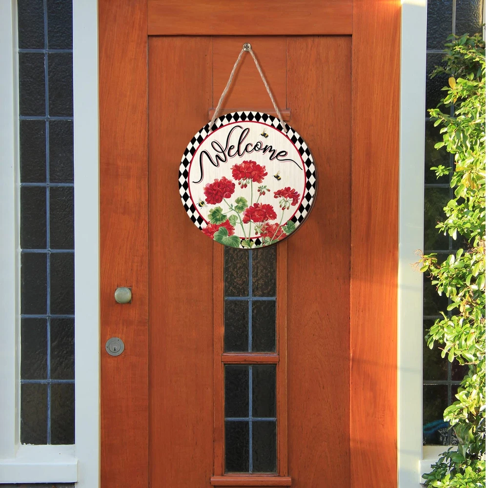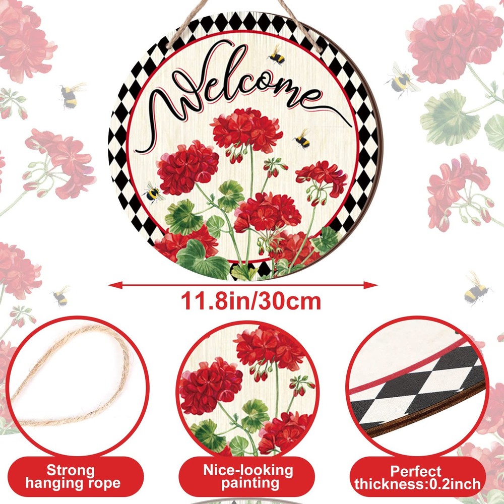 Features: Easy to apply: With provided rope, you can quickly hang the farmhouse welcome sign where you want to display it, such as doors, trees, windows and more, depending on your own decorating preferences, to fill the space with joy and elegance. Creative gifts: You can send our wood welcome signs for outside to your family, friends, colleagues, neighbors and others as presents on housewarming parties or other holidays, which could express your care while strengthening your relationships. Specifications: Main material: wood Color: as pictures shown Size: approx. 11.81 x 11.81 inches/ 30 x 30 cm Package includes: 1 x Geranium welcome sign Notes: Manual measurement, please allow slight errors on size. The color may exist a slight difference due to different screen displays. Package Information: you'll receive a charming welcome sign for front door featuring a delightful geranium theme, designed to radiate warmth and cheer; Ideal for both everyday and festive outdoor decor, it effortlessly enhances your front door, porch, or indoor walls with instant charm Vibrant Appearance: brighten your home with our eye catching geranium spring door hanger! Designed with bold red geraniums, playful yellow bees, lush green leaves, a crisp [Welcome] message, and a timeless white and black buffalo plaid wreath, this piece creates an inviting atmosphere that showcases your hospitality in style Trustworthy Material: crafted from wood, this geranium front door sign boasts expert craftsmanship,smoothly polished, odor free, and built to last; The sturdy, warp resistant surface features vibrant, fade resistant printing that stays vivid season after season, ensuring long lasting beauty Noticeable Size: each welcome door sign for front door measures approx. 11.81 x 11.81 inches/ 30 x 30 cm, an ideal size to make it a good adornment in the home, easy to apply and store, grabbing your guests' attention easily, suitable for plenty of indoor and outdoor places of different kinds of decoration styles Wide Range of Applications: the spring summer porch decor can be applied for a variety of occasions, such as birthday parties, family gatherings, dinners, weddings, holidays and so on, which play decorative roles in your bedroom, office, kitchen, front door, porch, garden, corridor, yard and more places
