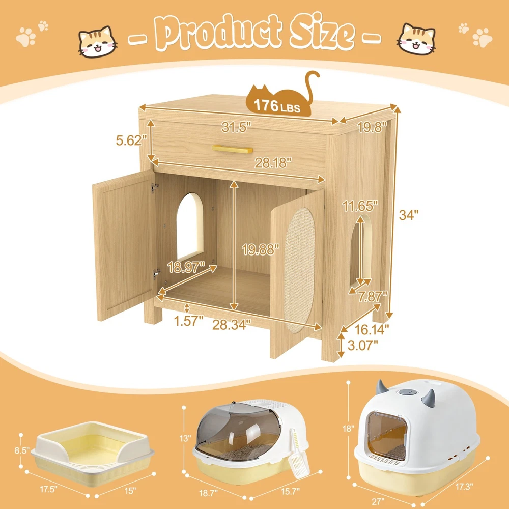Product Feature Multi-Purpose Pet Furniture: This versatile cabinet serves as both a litter box enclosure and a cozy cat house. With its stylish design, it also functions beautifully as a side table or coffee table next to your sofa. Place decorative plants, books, or ornaments on the top to enhance the elegance of your living space. Spacious Storage: Features a spacious top drawer to neatly organize cat essentials like litter scoop, trash bags, toys, grooming tools, or treats—bringing a cleaner and more organized home environment. Premium Cat Scratch Pads: The cabinet doors are fitted with natural sisal scratch pads that keep your cat safe while allowing them to satisfy their scratching instincts, protecting your furniture from damage. Expandable Two-Room Design: Buy two units to create a connected cat suite! Side pass-through holes allow cats to freely move between two cabinets—use one for the litter box and the other as a cozy resting space. Sealing Strip: Sealing strip reinforces the structure, reduces gaps, and protects cats from scratches. Self-adhesive for adjustable placement. Fit Most Cats : With an internal usable size of 28.34"x18.97"x22.83"H, this furniture fits most cats and litter boxes, gives your cat the space to hide and poop at ease. The door can conceal the litter box inside, reducing odor while also allowing easy access for cleaning. Product Description Features Net Weight 64.32lbs Weight Capacity 176lbs Material MDF Assembly Time 1hour
