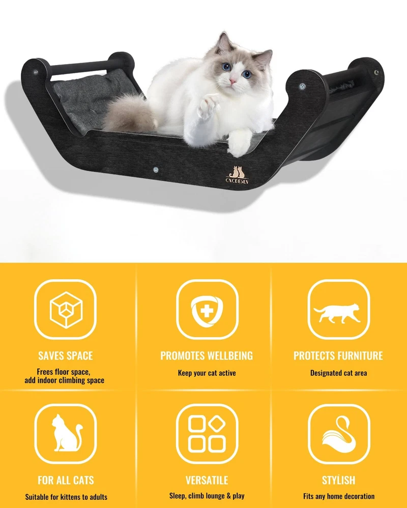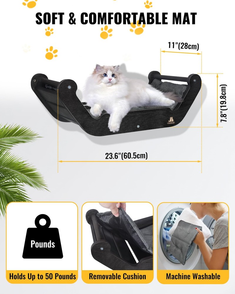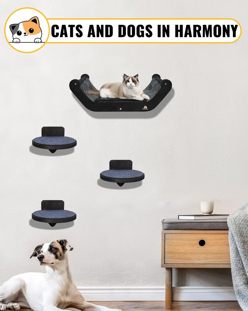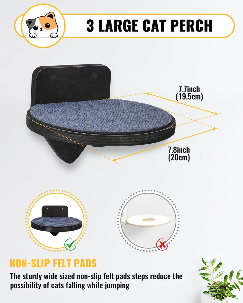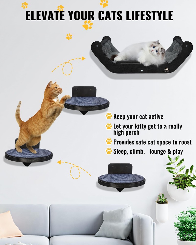 Climbing Wall Cat Set with Cat Bed and 3 Steps, Wooden Cat Furniture, Cat Stairs, Cat Wall Elements, Multifunctional for Sleeping, Playing and Climbing Perfect Cat Wall Furniture: cat wall shelves set consist of the cat perches and 3 cat wall steps, soft, removable mats on every perch ensure comfort, your cat can play in your own private area. Cat Climbing Wall Furniture for Indoor Cats reduces fur & dander on home furniture, scratched home furniture, territory behavior issues, multi pet behavior issues. Wall-mounted cat shelves blend seamlessly into your decor while offering space-saving cat climbing wall furniture for indoor cats. Suitable for kittens to adults. Space-Saving Large Cat Shelf: Perfect as cat shelves for small apartments, this 3-step set provides vertical play without sacrificing floor area.This cat climbing shelves with scratching pad for indoor not only offers kitty a space to climb and jump but also allows cats to exercise, improve its quality of life, and the 3 stairs can protect the joints of the old cats. Wall Mounted Cat Furniture for Sleeping, Playing, Climbing, and Lounging. Elevate Your Cat’s Lifestyle: Cat perches for wall satisfy natural climbing instincts. Stimulate your furbaby's mental health and physical activity. Cat shelves and perches for wall promotes a healthy lifestyle by encouraging climbing, jumping, and playful activities. Also make cats and dogs in harmony, durable and pet-friendly design allows multi-pet households to share wall-mounted cat tree sets peacefully. High-quality & Sturdy Cat Perches: Cat Wall Shelves is made of high quality wood, soft bed and non-slip felt pads, ensure cat shelves reliable stability to prevent any chances of wobbling or tipping over. The cat shelf is equipped with three non-slip foot ladders, and each ladder can bear at least 50pounds. The wood surface is smooth and flat burr-free, won't hurt your cats. The cat bed has soft and removable cushions with non-slip points on the bottom, large base offers enough space for cat to sleep freely also greets your sensitive kitten with pleasant comfort and warmth. Easy DIY Installation: Our cat climbing wall furniture for Indoor cats package included instructions, screws, drywall anchors, etc. We Simplify the installation process. You only need to nail it to the wall with tools, and then the sturdy cat wall mounted shelves and perches are ready for your cats to play. Modern cat wall shelves for all home decoration.