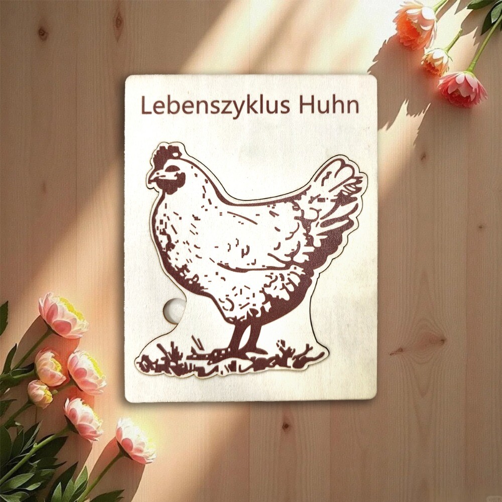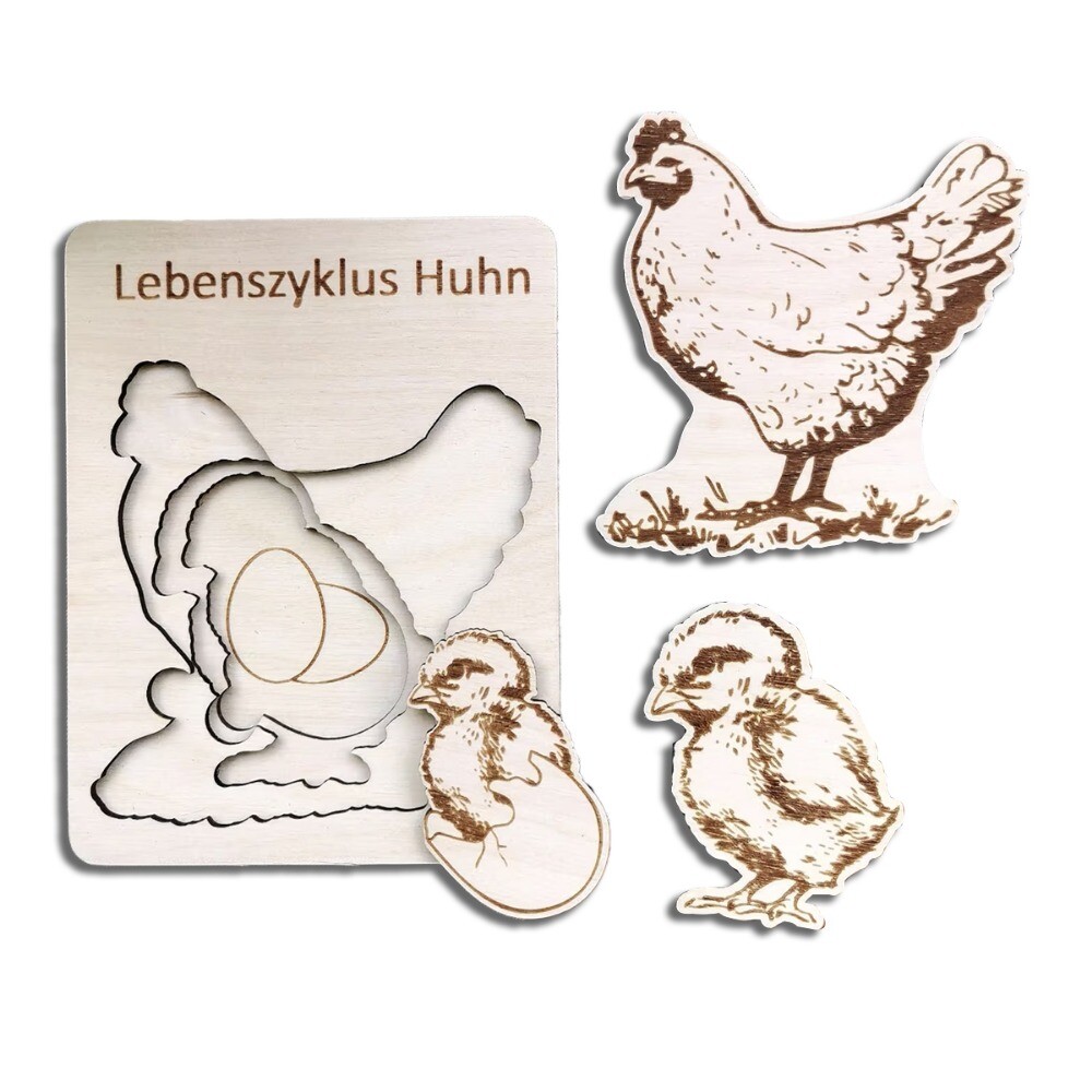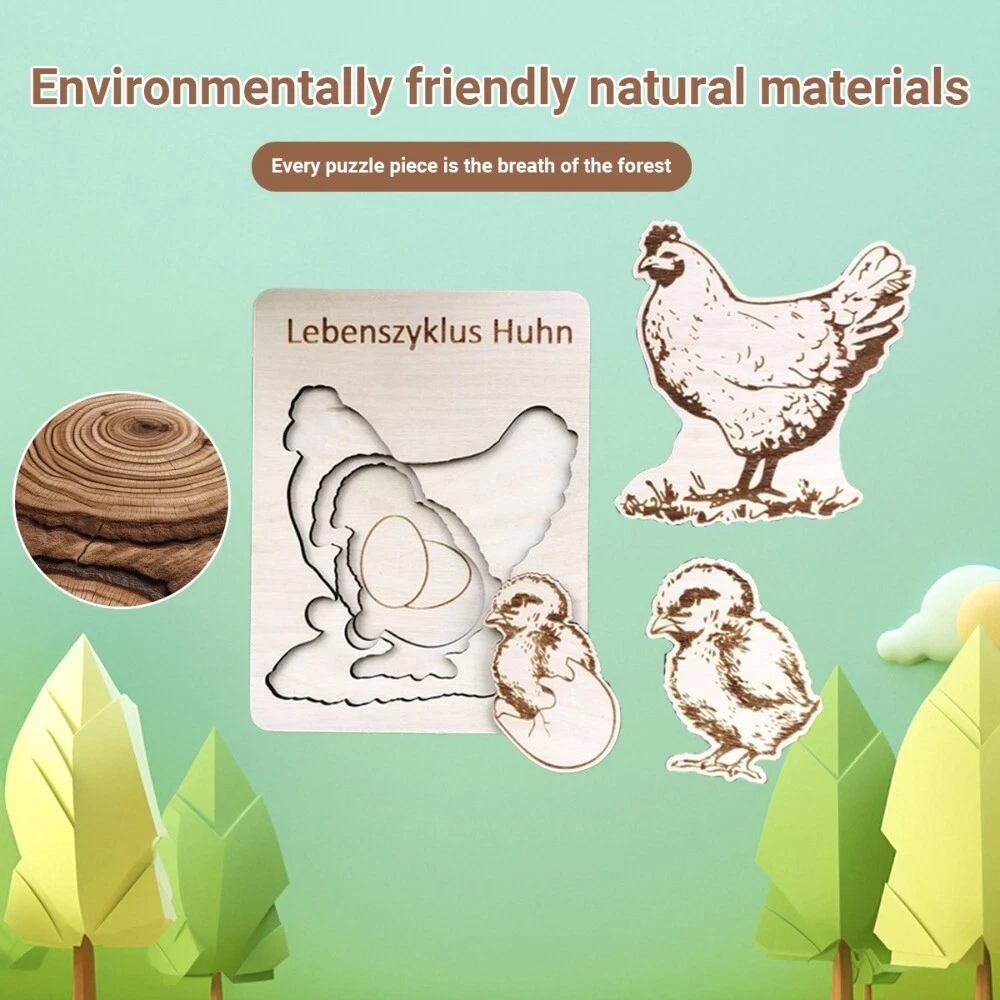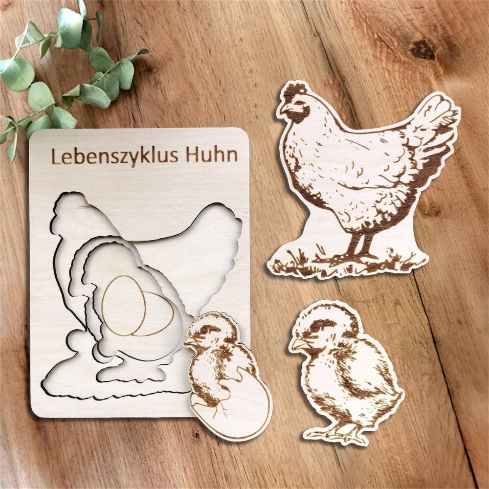Wooden life cycle puzzle: unique and high-quality educational toy Discover the unique life cycle puzzle made of high-quality wood, specially designed for preschool children. This puzzle offers a playful and educational introduction to the fascinating stages of the life cycle of various living things️. Made from durable, natural wood, the puzzle is characterized by its exquisite craftsmanship and child-safe materials. It not only promotes fine motor skills and hand-eye coordination, but also supports cognitive development through the understanding of biological processes. Ideal as a birthday gift, this wooden toy offers hours of learning fun and is a valuable addition to any preschool exercise. - Chicken Life Cycle - an educational puzzle illustrating the 4 stages of development, starting with an egg and ending with an adult hen. Material data: - Dimensions: - Puzzle - 19x14.5 x 1.2 cm - 4-piece puzzle 18 x 6.5 x 0.3 cm - the whole thing is made of plywood sanded on both sides - Wood, high-quality, sustainable beech wood Learning objectives: - the perfect introduction to the world of animal and plant development - 2 puzzle shapes: easier than a 4-piece puzzle and more difficult than a puzzle - learn fine motor skills, fine motor skills development, coordination, motor skills - practice hand-eye coordination - gross and fine motor skills - practice tweezer grip Recommended Age: Warning: "Suitable for children under 3 years of age" "Use under the direct supervision of an adult." ️ Environment & Safety: - Wood from sustainable plantations, ecological ️ Instructions: - Wipe with a damp cloth - Do not immerse in water - Store in a dry condition - Your children should be supervised while playing On Jun 11, 2025 at 12:21:19 PDT, seller added the following information: