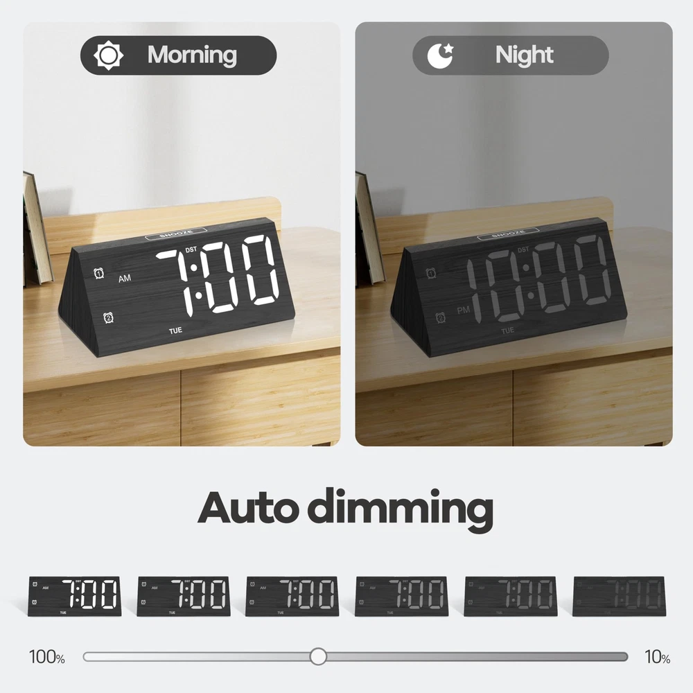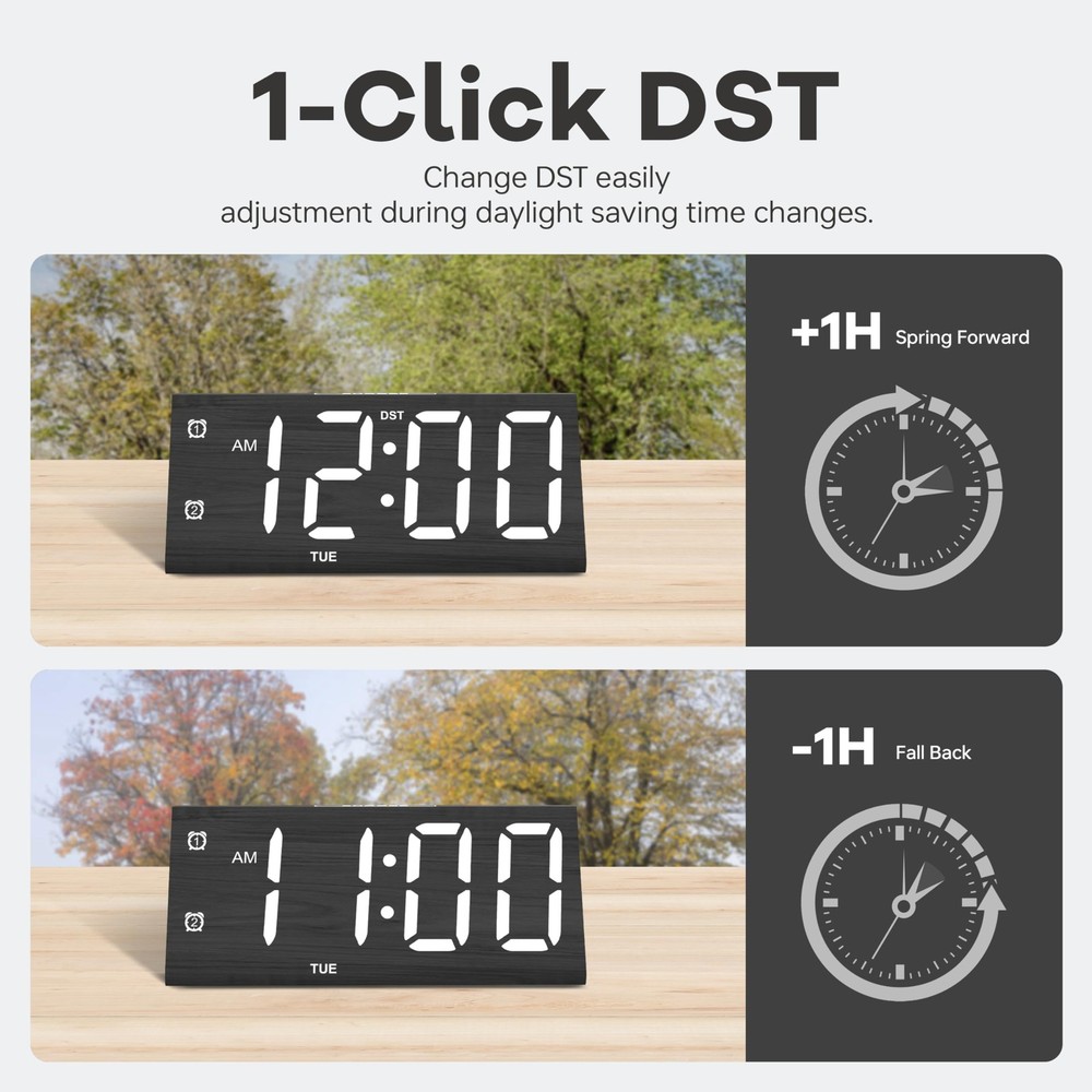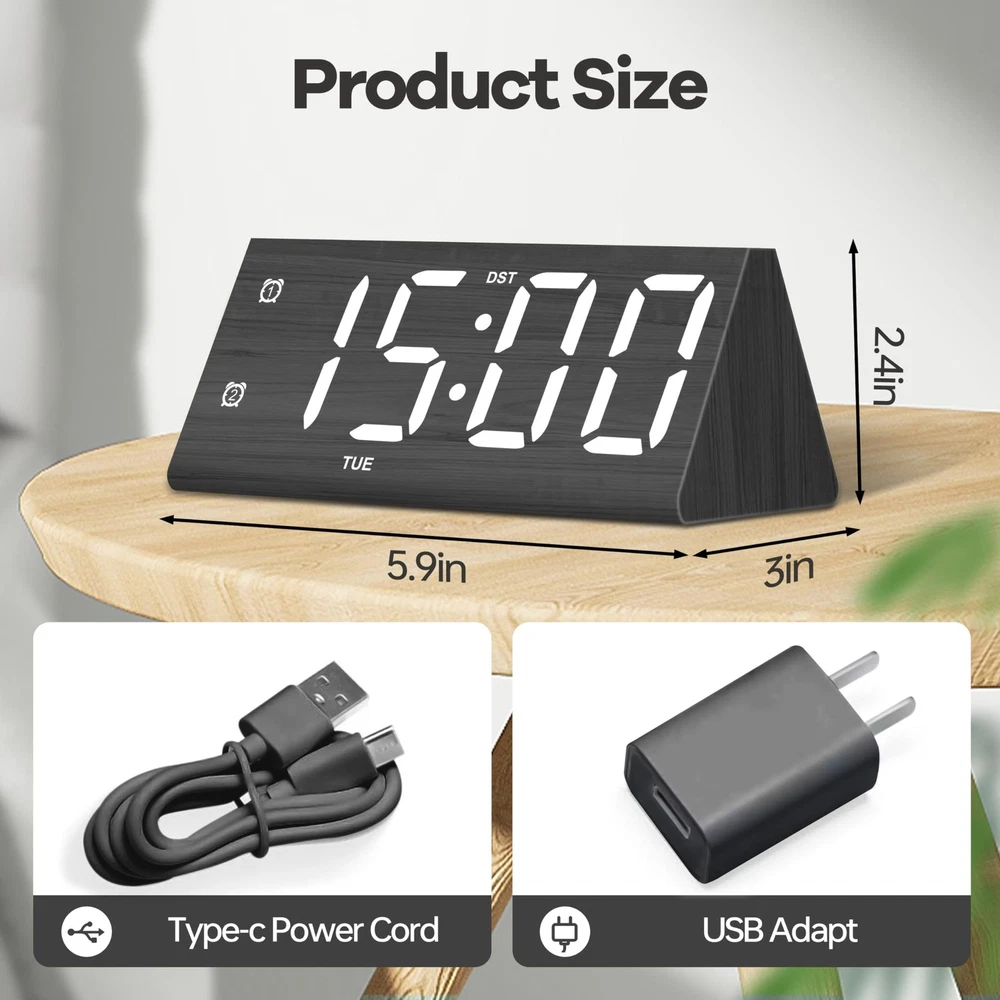 Absolutely love this wooden digital alarm clock! The large, bold digits are super easy to read, even from across the room, which is perfect for my aging eyes. The USB-C power means no more scrambling for batteries, and the dual alarm is a game-changer—I use one for me and one to remind my partner. The weekday-only mode is genius for workdays. Stylish wood finish fits perfectly on my nightstand. A must-have for anyone who values function and design!