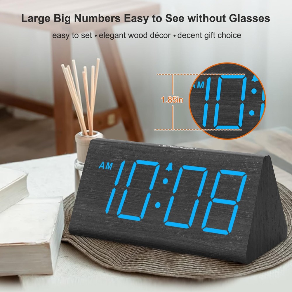 Wooden alarm clock with 1.8 in large big digits, time is easy to see without glasses, which is vision friendly for seniors and the elderly. Time display is 12HR and 24HR switchable. Modern clock simple to operate, setting the clock time only needs 2 steps, perfect for kids, youth, teen, adults and parents. A single manual DST button save your time on restting the clock for summer time and winter time, just press the DST button to have the time one hour forward or backward in one step. No resetting needed. Battery backup alarm clock for power cut, time will not display but the alarm will goes off on the set time with just battery power. 5 level dimmable alarm clock plus an OFF option so you can adjust the brightness per your need so it won't disturb your sleep. Alarm clock with USB Charger allows you to charge your ceelphone or iPad without looking for other outlet or adapter, a perfect bedside clocks bedroom. Alarm clock plug in wall for normal time display and the charging function, the adater is supplied so you don't have to look for the power adapter, which is 5V/1A. Bedroom alarm clock with 5 level adjustable alarm volume, no worring of the alarm sound too weak or too loud, you control the alarm volume at will. Digital bedroom clock with 9 minutes snooze and 2 minutes alarm, a dedicated touch snooze button on the top is easy to reach without opening your eyes, getting extra 9 minutes sleep is like a breeze. The alarm will last for 2 minutes if you don't snooze it or turn it off. Minimalist and stylish wood alarm clock for bedroom, living romm and office decoration, aesthetically beautiful and functionally easy alarm clock is also a decent gifts for yourself, your loved one and friends on Christmas, New Year, Fathers' Day, Mothers' Day, Thanksgiving Day. For students, this night stand clock is the best clock for their back to school day! Basic Wooden Alarm Clock with Easy to See Big Numbers: the 1.8 inches large numbers on this 6.6 inches compact alarm clock are super easy to read from across the room, no complex setting, easy to program, which is an ideal desk clock for kids, seniors, the elderlys and adults. 5 Level Dimmable Brightness Dimmer: the display brightness of this digital clock is 5 level adjustable plus an OFF option, which is vision friendly, no glaring light at night yet still bright enough by day. Time format is standard time and military time (12/24HR) switchable. Battery Only Operates Alarm for Power Failure: the battery function for this bedroom alarm clock will trigger the alarm during power outage, take no risk of missing your vital schedule. The display won't light up with battery power only. Requires 2 AAA Alkaline batteries (not included). Adjustable Alarm Volume with Snooze Button on the Top: the alarm volume is 5 level customizable from very low for light sleepers to extra loud for heavy sleepers adults. Alarm lasts for 2 minutes and a dedicated Snooze button on the top helps you get extra 9 mintues sleep easily. Plug in Alarm Clock with USB Charger: the bedside clock runs on electricity for normal time display and the AC adapter is supplied. A handy USB Charging Port helps you charge your smart devices and other gadgets without looking for your adapter and other outlet. Bedroom Accessories Wood Décoration: the concise and clean LED digits on the sleek wooden face make up this minimalist wooden digital clocks for living room décor which is also perfect for your TV stand and cable box while serves as a decent and beautiful gifts for your loved one. Simple Alarm Clock with Manual DST: the table clock comes with a manual DST button that would save your time when spring or fall time arrives, no setting hassle, just press the DST button, DST shows up on the display, time goes on hour forward, DST off, time goes one hour back. IMPORTANT: please note that the electric alarm clock is NOT battery powered and requires adapter for normal performance. Battery only operates alarm during power outage.
