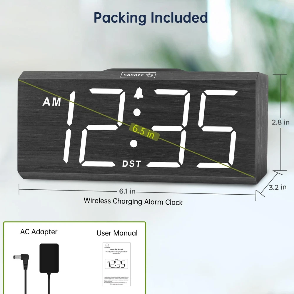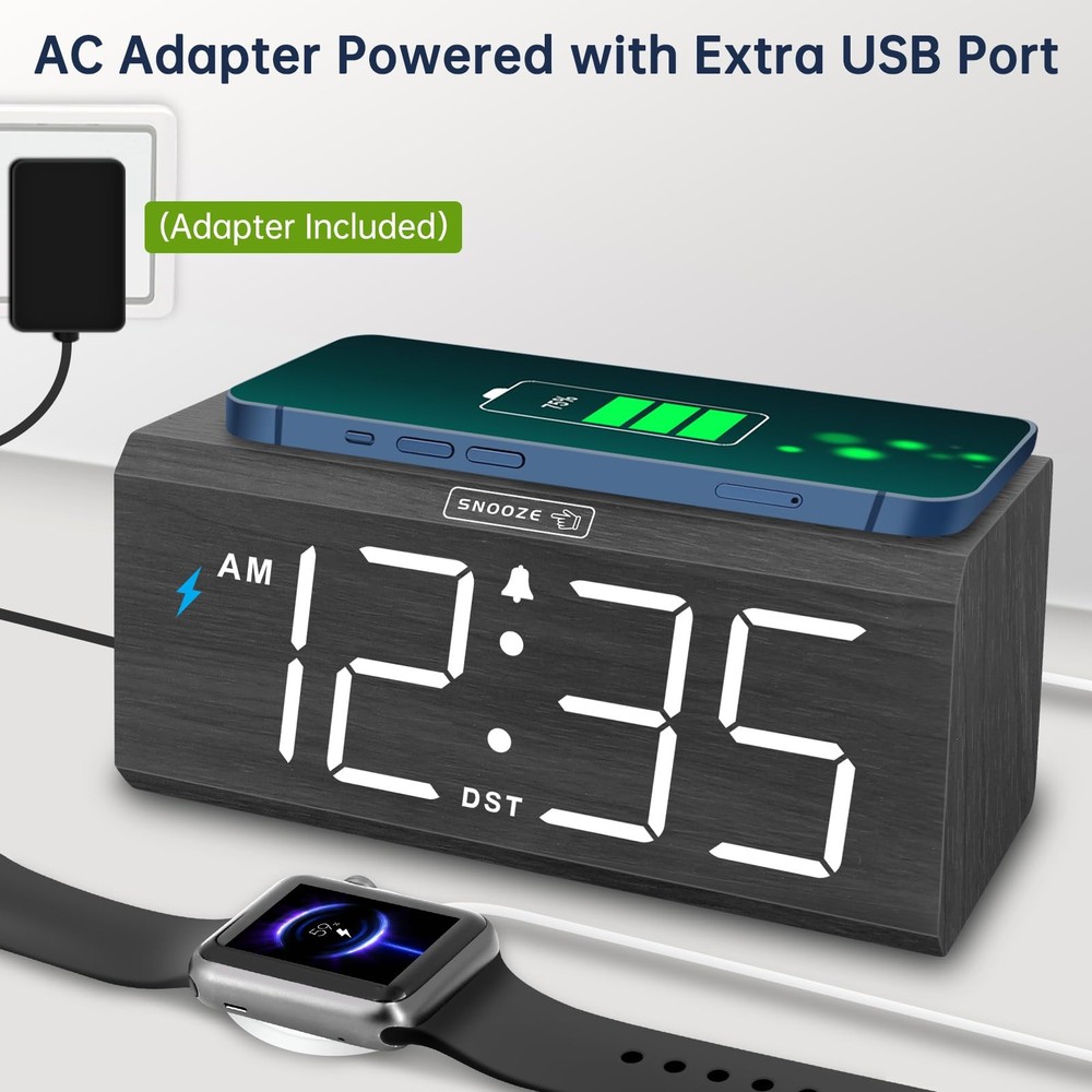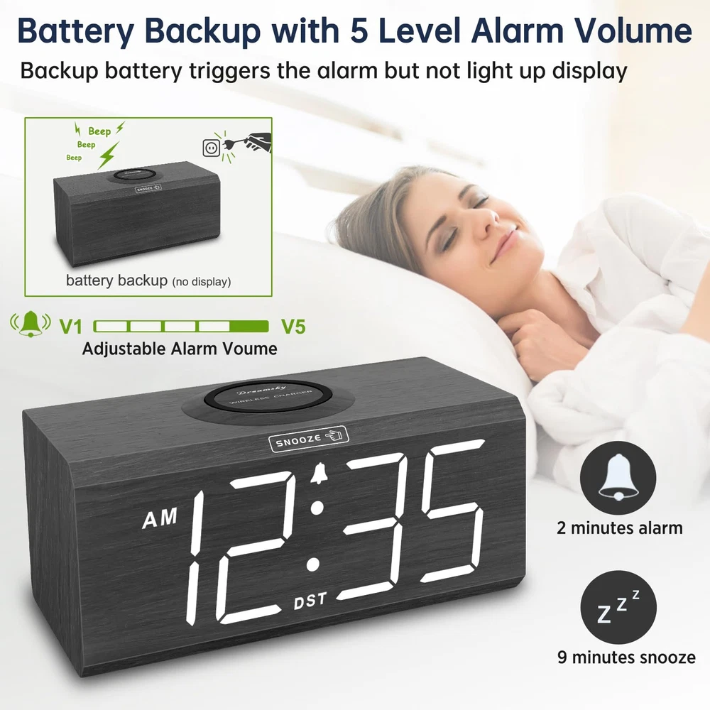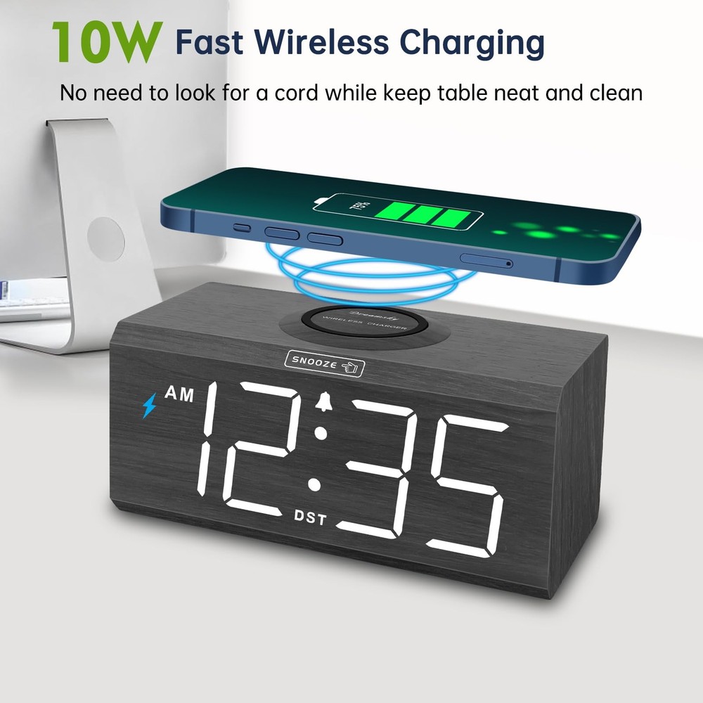 10W Fast Wireless Charger: this wireless charing alarm clock support fast charging and charges universal cellphones with wireless charging which is really handy and space saving while keeps your bedside nightstand neat and clean. 10W Fast Wireless Charger: this wireless charing alarm clock support fast charging and charges universal cellphones with wireless charging in high efficiency way without overheating, which is really handy and space saving while keeps your bedside nightstand neat and clean. Wood Alarm Clock with Large Numbers: the 1.8 inches big digits on the 6.5 inches electric clock are easy to see without glasses. Two steps setting makes the wood clock very easy to setup, no reset hassle for daylight saving time with manual DST. 5 Level Adjustable Bightness with OFF Display: the dimmable alarm clock has 5 level brightness dimmer with OFF mode so you can dim display brightness per your need, no glaring light for bedside use. Extra USB Charging Port: the wireless charger clock also comes with an extra USB ports to charge other electronic devices which is a great handy addtion for bedroom, livign room, office 5 Level Volume Control with Battery Backup Alarm: the alarm volume is adjustable to hig or low level so it can serve as a loud alarm clock for heavy sleepers adults and won't blast you awake. Backup battery function will trigger the alarm during power cut, no worry about oversleep. Alarm lasts for 2 minutes and just tap the snooze button on the top for extra 9 mins sleep. Plug In Alarm Clock: the electric desk clock runs on electricity and is powered by AC adapter. Batteries (not included) just store the clock setting and trigger the alarm during power outage but won't light up the clock display. 5V/2.1A power adapter is supplied. Decent and Stylish Gifts: consider its futuristic modern look and the easy to program function with the fast wireless docking station, this wooden digital clock is perfect for room décor and an elegant small gifts for Christmas, birthday, back to school and New Year.