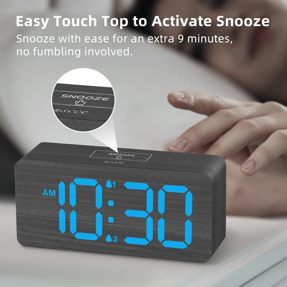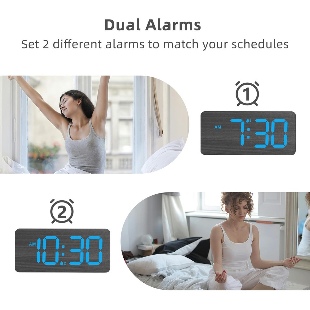 Wooden Digital Alarm Clock with Large Number This wooden digital alarm clock combines style and functionality, making it an essential addition to your home. Whether you're looking to enhance your decor or improve your daily routine, this clock is designed to meet your needs with ease and elegance. Elegant Wooden Clock for Home Decor This digital clock is perfect for placing on bedside tables, desks, shelves, and other home surfaces. Its minimalist and attractive wooden design adds an eco-friendly and distinctive touch to the decor of bedrooms, offices, and living rooms. It also makes a thoughtful and aesthetically pleasing gift for Christmas or birthdays, ideal for family, friends, and children. Large-Number Digital Alarm Clock This modern digital alarm clock boasts a 6.3-inch display with 1.8-inch large numbers, ensuring that the time is clearly visible even from a distance, perfect for those with visual impairments. It offers the flexibility to switch between 12-hour and 24-hour time formats, along with convenient DST adjustments. The clock is designed with intuitive controls and clearly labeled buttons, making it simple to set the time or alarms. User-friendly for all ages, from children to seniors, this clock is an accessible addition to any home. Adjustable Brightness Digital Alarm Clock Equipped with a 0-100% dimmer, this clock allows for seamless brightness control, ranging from a completely dark display to a brilliantly lit one. Ideal for preventing nighttime glare while maintaining daytime clarity, this feature accommodates the needs of those with light sensitivity or the elderly, providing a comfortable viewing experience at all hours. Convenient Dual Alarm Clock with Accessible Snooze Function Featuring a prominently sized Snooze button on top, this clock enables you to effortlessly extend your sleep by an additional 9 minutes, perfect for those who prefer not to fully wake up to turn off the alarm. It's simple to configure two distinct alarms, catering to family members with varying daily routines, ensuring a user-friendly experience for all. Electric-Powered Alarm Clock with USB Charging Capability This alarm clock runs on electricity through an included AC adapter, simply plug it into any standard wall outlet. It comes with a convenient USB charging port on the back, allowing you to power up your smartphone or other smart devices overnight while you rest. Battery Support for Uninterrupted Function Ensure reliability during power failures by backing up the clock with 3 AAA batteries (not included). When operating on battery power, all features function as usual, except for the USB charging port. The display illuminates for 8 seconds with each press of the 'SNOOZE' button or any buttons on the back, then dims to save energy, ensuring your clock remains operational without interruption. What You Get 1*Wooden Digital Alarm Clock 1*AC Power Adaptor 1*User Manual WOODEN DIGITAL CLOCK WITH LARGE NUMBERS: This wooden clock features bold, 1.8-inch LED numbers that are easy to read from across the room. Its natural wood finish complements any desk, shelf, table, or nightstand.(Note: The display stays lit only when plugged in) 0-100% CUSTOMIZABLE BRIGHTNESS: Easily adjust the display brightness from 0-100% to suit any setting–from bright daytime to a glare-free, night-friendly glow. The full-range dimmer makes it ideal for light-sensitive users and seniors. DUAL ALARMS WITH ADJUSTABLE VOLUME & EASY SNOOZE: Set two separate alarms with 5 volume options for light or heavy sleepers, perfect for different routines. An easy-access snooze provides an additional 9 minutes of rest. PLUG-IN ELECTRIC CLOCK WITH USB PORT: Powered by a reliable AC adapter, this clock ensures dependable timekeeping with a built-in USB port for convenient device charging on your nightstand, keeping your phone or other devices ready while you sleep. BATTERY BACKUP FOR POWER OUTAGES: Insert 3 AAA batteries (not included) to maintain clock settings and alarms during power outages, ensuring your schedule stays intact and you never miss an alarm - even in a power failure. USER-FRIENDLY CLOCK WITH MANUAL DST: Featuring clear, easy-to-use buttons, this clock is perfect for all ages–kids, adults, and seniors. Easily switch between 12/24-hour formats and use the manual DST function for seasonal changes, keeping you on schedule all year round. DESK CLOCK FOR HOME DÉCOR: With its natural and minimalist design, this wooden clock is a perfect decoration for bedrooms and offices. It's also ideal for placement on the TV stand in the living room, replacing the time display on the cable box. It makes a nice gift for family and friends.