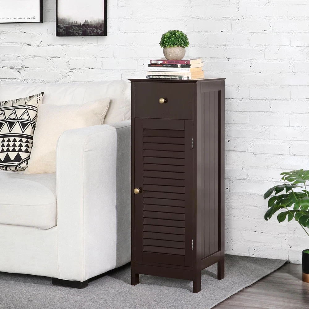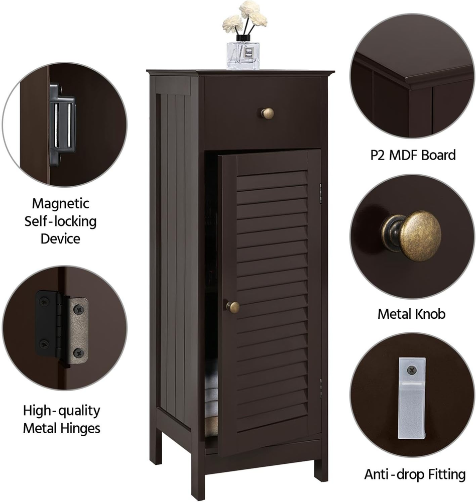 Store New Arrivals Add to Favorite View Feedback Contact Bathroom Floor Storage Cabinet, Wooden Free-Standing Storage Organizer Unit with Drawer and Door Cabinet, Tall Side Table for Home Decor, 34.5 in H, Espresso Description Country of Origin China Top Material Type Wood Department Unisex Adult Number of Racks 2 Number of Pieces 1 Room Type Bathroom Number of Compartments 2 Assembly Required Yes Installation Type Freestanding Number of Doors 1 Number of Drawers 1 Frame Material Wood Material Wood Style Modern Finish Type Painted Included Components Shelves Door Style Shaker, Shaker Item Weight 16.71 pounds Number of Shelves 2 Special Feature Adjustable Shelf Weight Limit 5 Kilograms Mounting Type Freestanding Color Espresso Shape Rectangular Base Type Legs Back Material Type Engineered Wood Recommended Uses For Product Towels Product Dimensions 12"D x 13"W x 34.5"H Size Large Modern Design: Stylish and fashionable design seamlessly complements any room décor and also adds a touch of elegant charm to your room Large Storage Space: The cabinet comes with large storage space, which will keep everything in order; one shutter door and one drawer design can help you classify your items better. You can put a variety of toiletries, cosmetics, and other sundries Multi-purpose Use: This bathroom cabinet is not only used as bathroom cabinet but also can be used as side cabinet and cupboard, very practical Waterproof Finish: The high-quality MDF wooden material can stand the humidity of the bathroom and prevents moisture Safety Is Priority: Crafted from CARB P2-compliant MDF, the bathroom storage cabinet features an anti-tip kit for improved safety. Plus, built-in drawer anti-slip device prevents the drawer from sliding out and falling automatically Product Description Wooden Bathroom Floor Cabinet, Free-Standing Storage Organizer Unit, Console Sofa Side Table for Living Room/Hallway/Kitchen This bathroom storage cabinet is made of high quality material, sturdy and durable to use and waterproof. The cabinet features 2 shelves design, which provides enough space for your hand sanitizer, paper towel, books and other stuff. The drawer in the higher part is for your additional small stuff, and the shutter door can protect your essentials from dust and water. High Quality We apply a waterproof and moisture-proof coating process to the surface, making it resistant to moisture and easy to clean. Bathroom Floor Storage Cabinet High Quality Material: our bathroom storage cabinet is made of high quality MDF material, sturdy and durable to use and not easy to break Modern Design: stylish and fashionable design perfectly compatible seamlessly with any room décor and also adds a touch of elegant charm to your room Versatile & Practical: compact size and practical function make it suitable for bathroom, hallway or kitchen Dimension: 12.6 x 11.8 x 34.3’’ (LxWxH) Max. Weight Capacity: Cabinet top: 26.5 lb; Each drawer: 11 lb; Layer board: 17.6 lb G.W.: 19 Lb Made of high quality P2 grade MDF board, harmless and suitable for long-term use. The bathroom cabinet can be connected to the wall for safer use. Magnetic self-locking device can sure the open and close easily, protect storage items. 4 fixed parts in the back are connected tightly, which provides solid stability. Ideal for Bathroom, Hallway and Living Room ABOUT US We offer the best prices around on high quality products. Our E-store includes media such as books, movies, music and games while offering electronics, toys, sporting apparel, clothing, tools, general home, garden items and more. SHIPPING We are always working hard to ensure your package arrives as soon as possible. Please understand that some factors like weather, high postal traffic, and the performance of shipping companies are outside of our control. We offer free shipping to the lower 48 states and ship within 2 business days of payment, usually sooner. We do not accept P.O. Boxes. Please provide a physical address. For shipping outside of the continental USA, we only use eBay's Global Shipping Program.The item is shipped to KY and then sent to the rest of the world. International customers are responsible for all duties and taxes. Continue to check out in order to calculate costs for shipping the item to your country. Messages regarding eBay's Global Shipping Program MUST be directed at eBay EXCLUSIVELY. RETURNS We offer a 30-Day Return Policy on items which you are not completely satisfied with. You have the option for a full-refund or an exchange of the item. No returns are available on items shipped outside of the USA. PAYMENT We accept PayPal. CONTACT US This page content is yet to come Please ad us to your favorite seller and visit again later Thank You CUSTOMER SATISFACTION We try our very best to make sure every customer is completely satisfied. If there's a problem, message us! We're happy to help. WE ACCEPT Copyright © 2021 AutoDS. | All Rights Reserved
