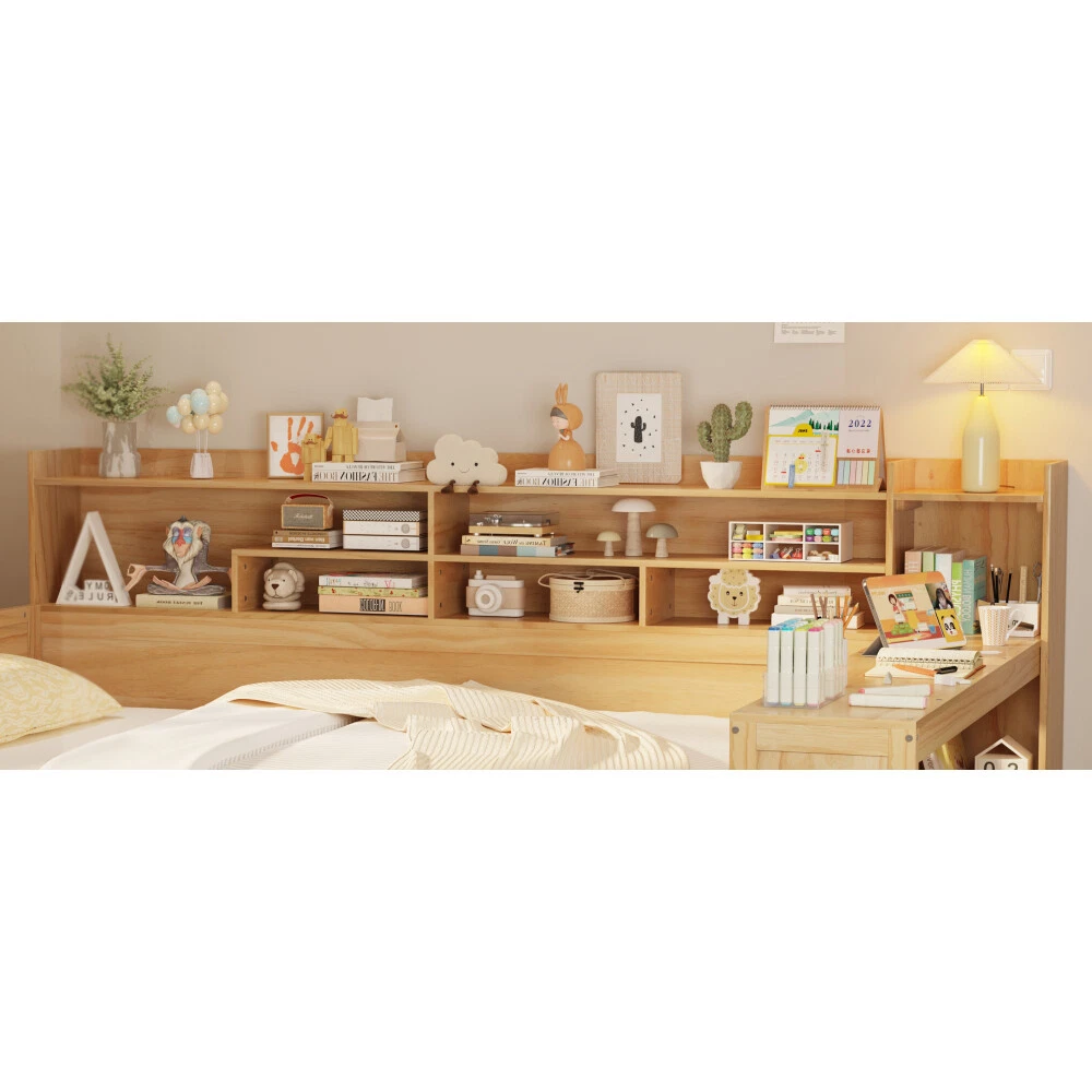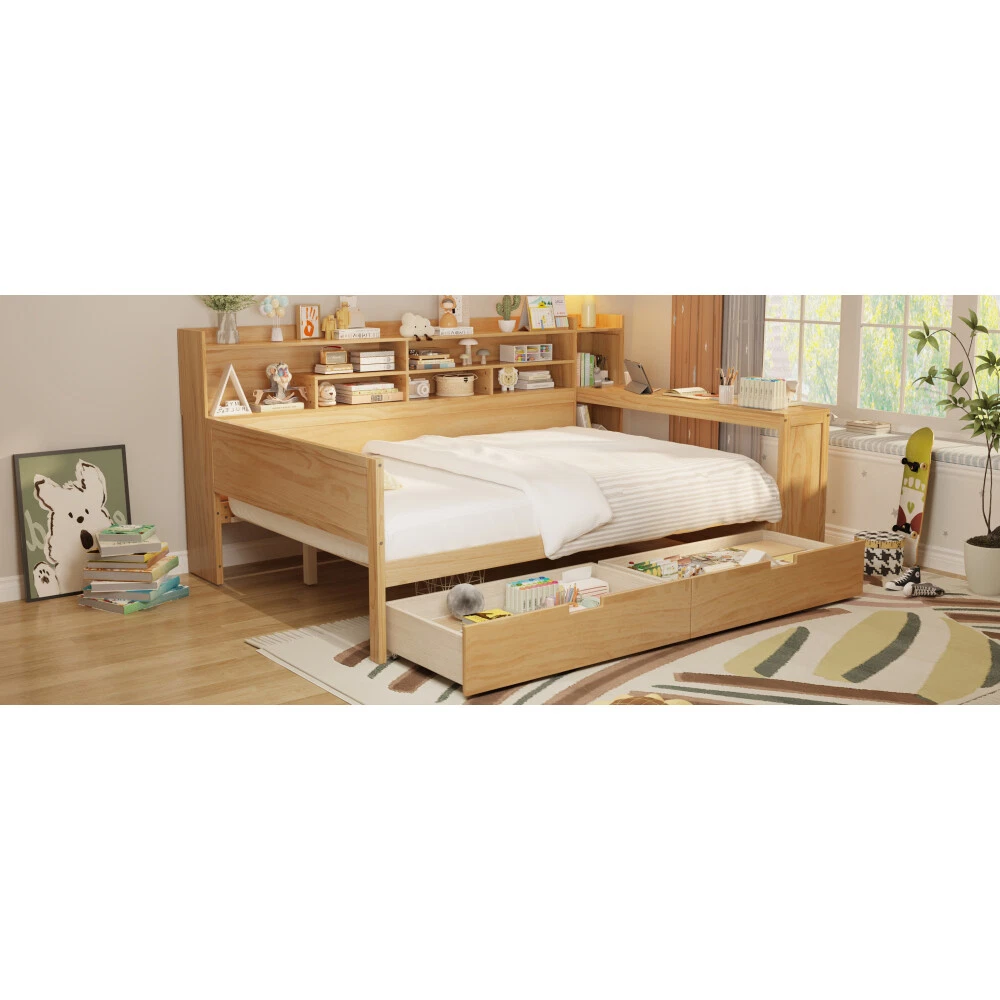 Multifunctional design: This bed boasts a multifunctional design that is tailored to meet various needs. With its multi-layer storage shelves on the side, two spacious drawers at the bottom, and a study desk at the foot of the bed. The bed is designed with a modern aesthetic, featuring clean lines and sleek finishes that effortlessly complement various bedroom styles. Bed Frame with Study Desk: This bed comes with a unique feature - a study desk at the foot of the bed. Transform your bedroom into a productive workspace effortlessly with this innovative design. Whether you need a quiet place to study, work on your laptop, or simply enjoy a good book, this multifunctional bed provides the perfect solution. Maximize your space and productivity with the convenience of a built-in study desk right at the end of your bed. Space-saving:This bed is designed with multi-layer storage shelves on the side, along with two large drawers at the bottom, providing ample space-saving solutions for your bedroom. With the convenient storage options, you can store bedding, toys and other items to keep your essentials organized and maximize the use of space efficiently. Superior Quality: Made of high-quality MDF,Plywood and Pine, the frame of this bed is not easy to be affected by humidity change and lead to crack. The strong legs, wide boards and 10 slats for bed ,not only improve the weight capacity of the bed greatly but also ensure the stability. Product Dimension: Overall Product Dimension: 91.3"L X 64.9"W X 44.9"H. Bed suitable for Full size mattresses. Wooden Daybed with Storage Shelves, Multi-functional Bed with Two Storage Drawers and Study Desk This bed is a versatile piece of furniture with multiple functionalities to meet your various needs. Featuring multi-layer storage shelves on the side, two large drawers at the bottom, and a study desk at the foot of the bed, it offers practical solutions for maximizing space and organization in your bedroom. Whether you need extra storage for bedding and belongings, a designated workspace for studying or working, or simply a stylish and functional bed, this multi-functional design has you covered. Enjoy the convenience and efficiency brought by this bed's versatility and innovative features.