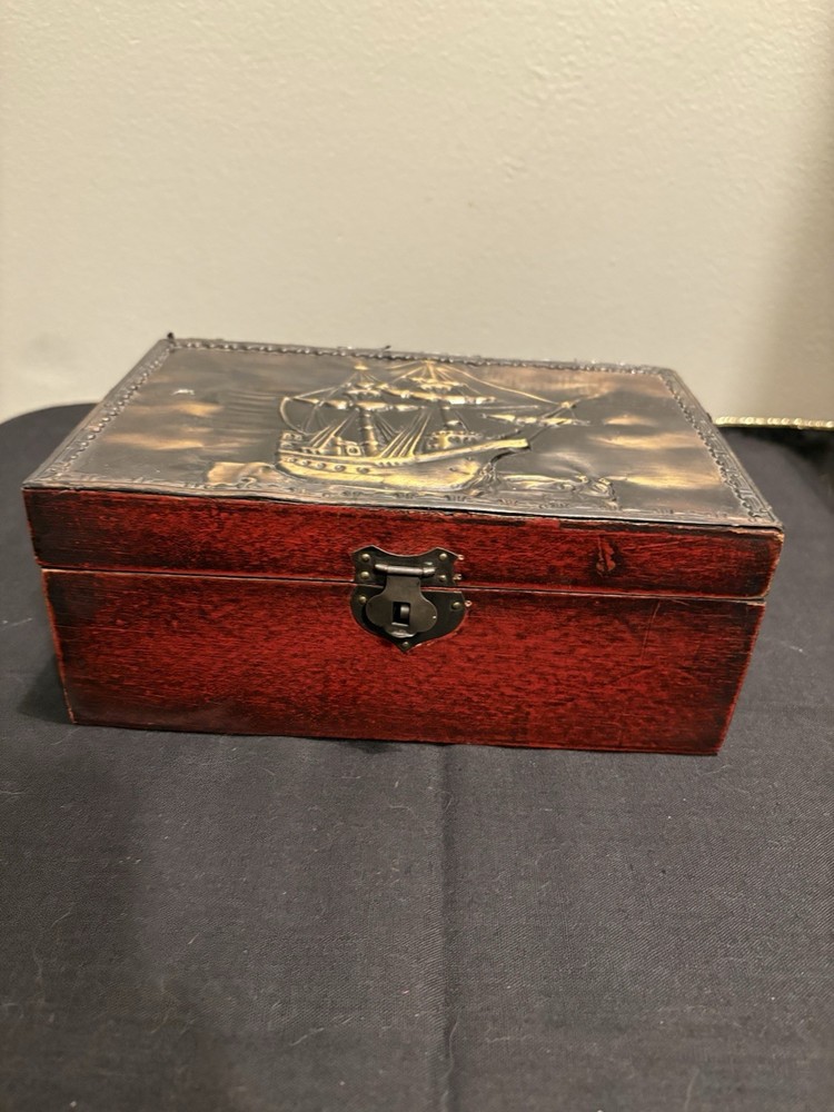 Jewelry/trinket wooden box with sail ship. 7 3/4 x 5 x 3 1/2