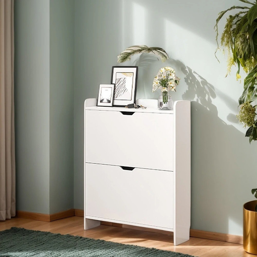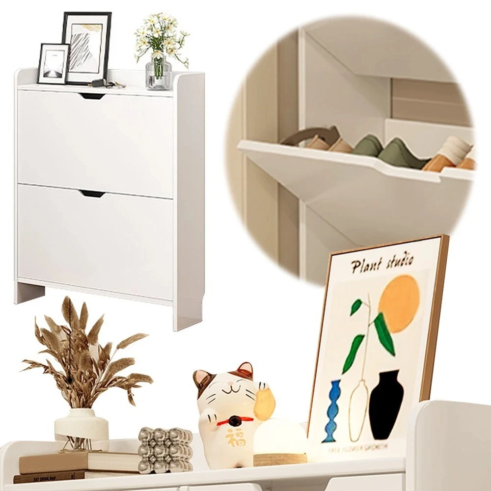2-Tier Wooden Entrance Shoe Cabinet with Flip Drawers Shoe Organizer Cabinet Narrow Shoe Storage Cabinet for Bedroom Living Room Features: 1. Versatile Storage Solution: This entrance shoe cabinet accommodates various types of footwear, including high heels, sneakers, flats, and boots. Each flip-drawer features an adjustable or removable panel, allowing you to customize the storage space according to the size and shape of your shoes. 2. Compact and Spacious: Measuring 19.69" x 6.69" x 32.68", this shoe organizer cabinet includes two flip-out drawers, each with dual-layer storage. The top platform provides additional space for storing items like wallets, keys, and accessories, combining practicality with an elegant design. 3. Space-Saving Design: The flip-drawer design makes opening and closing easy, allowing the narrow shoe storage cabinet to fit in narrow spaces. It keeps your shoes dust-free and protected from pets and insects, offering a tidy storage solution compared to traditional shoe racks. 4. Sturdy and Safe: Made from sturdy P2 engineered wood, this free-standing shoe cabinet boasts a stable structure with excellent weight-bearing capacity for long-term use. It includes an anti-tip device to secure the cabinet to the wall, preventing tipping and ensuring child safety. 5. Elegant and Easy Assembly: This slimming shoe rack featuring a hidden shoe cabinet design with embedded handles, it complements various home styles and is for entryways, hallways, living rooms, or porches. All parts are numbered for straightforward assembly, and our customer support is ready to assist with any questions. Specification: Origin: Mainland China Size: 500.00x170.00x830.00mm/19.69x6.69x32.68inch Appearance Style: Modern Installation Method: Assembly Material: Wooden Note: Due to different monitor settings and lighting conditions, the actual color of the item may vary slightly from the pictures. Thanks for your understanding! Please allow a 1-2 cm difference in measurements due to manual measuring.
