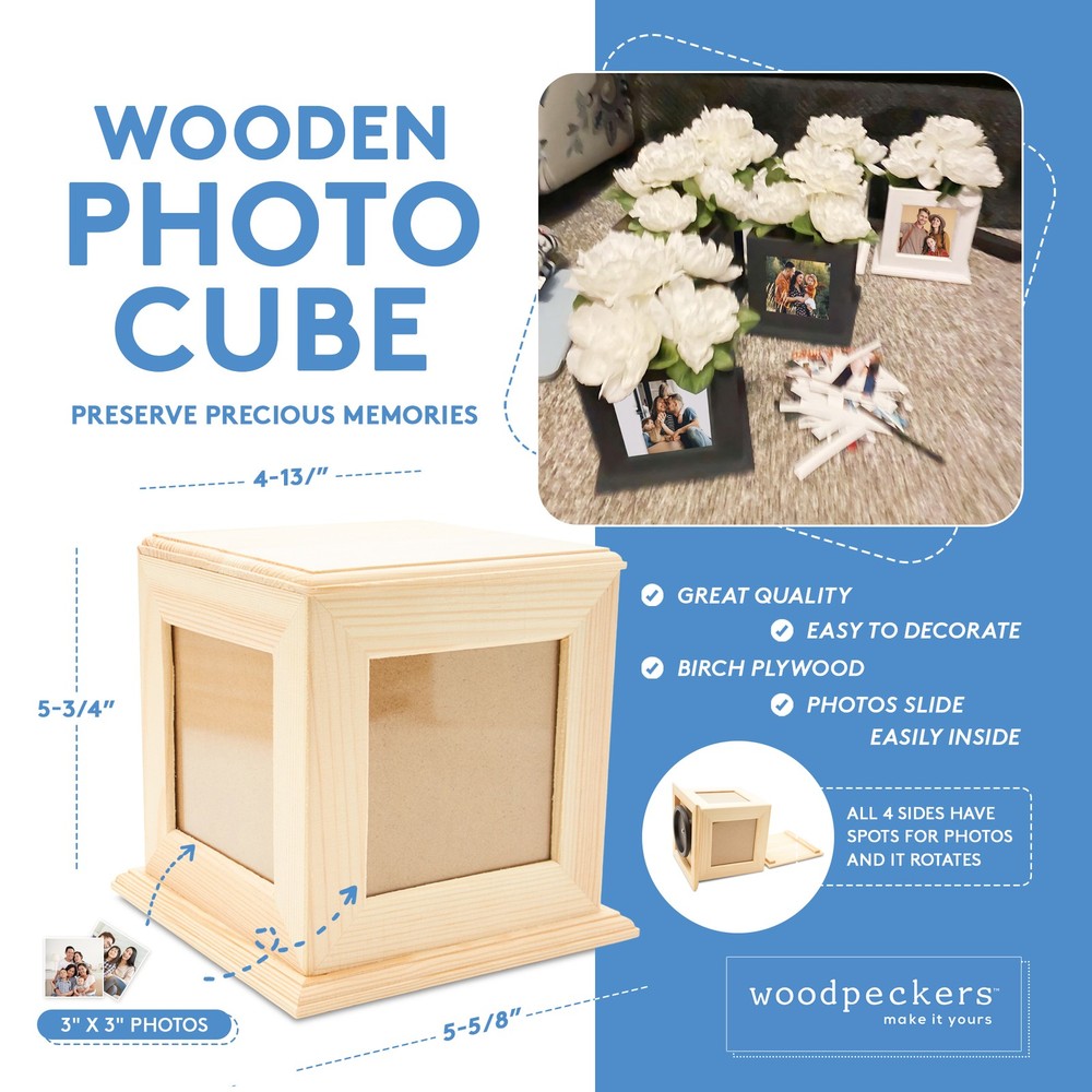 PRESERVE PRECIOUS MEMORIESA wood cube that can brighten up the entire room! Paint or go the rustic route and leave the birch plywood face unfinished. For an antique feel, decorate it the old-fashioned way and put in your old, slightly faded pics. Too many choices with this picture keepsake box? Don't fret. It's easy to put pictures in the 3"x3" pine frames, so you could change up the look a little down the line. Think out of the box with this 5-5/8-inch x 4-13/16-inch cube!TELL YOUR STORYA craft cube to match the story you want to tell. Add quotes, photos, and art mediums to this unfinished wooden box picture frame. Watch your office and once-empty corners at home now come alive with your beautiful story cube. Try a series of photo cubes for different "chapters" at a milestone event. This wooden picture cube is also ideal as a centerpiece at a party. The square shape can turn into almost anything - with a little decoration of course - to match your theme. It spins and displays well. Let the big photo show begin!HONOR THEM WITH PHOTO MEMORIESSmile because it happened. Keep your loved ones near with this cube photo frame, no matter how far away they really are. This nifty photo box cube - scratch that, picture frame keepsake box has space for four photos and storage space too! Memories and keepsakes from loved ones who have since passed on can be safeguarded here. Wooden box with picture frames makes a good sympathy gift and really any kind of gift to say "I love you."