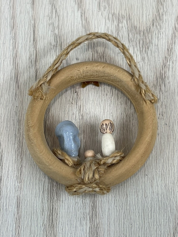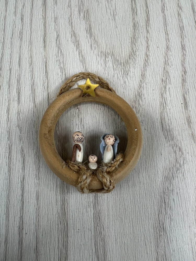 2” Small Wooden & Rope Wreath with Wood Nativity Design. Normal signs of wear wear for preowned item. See pictures for assessment and measurements. Thanks for looking.